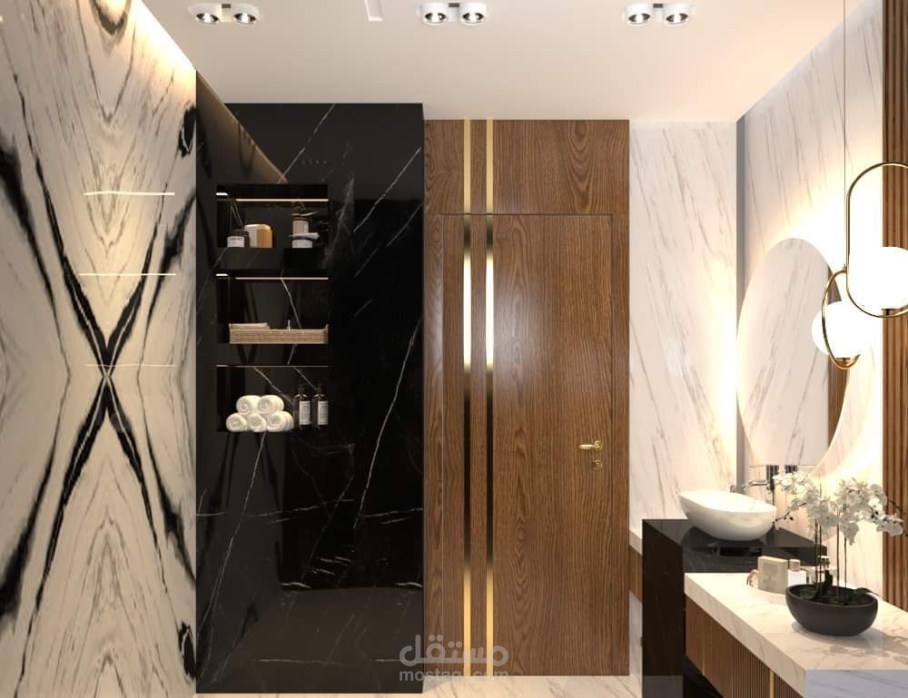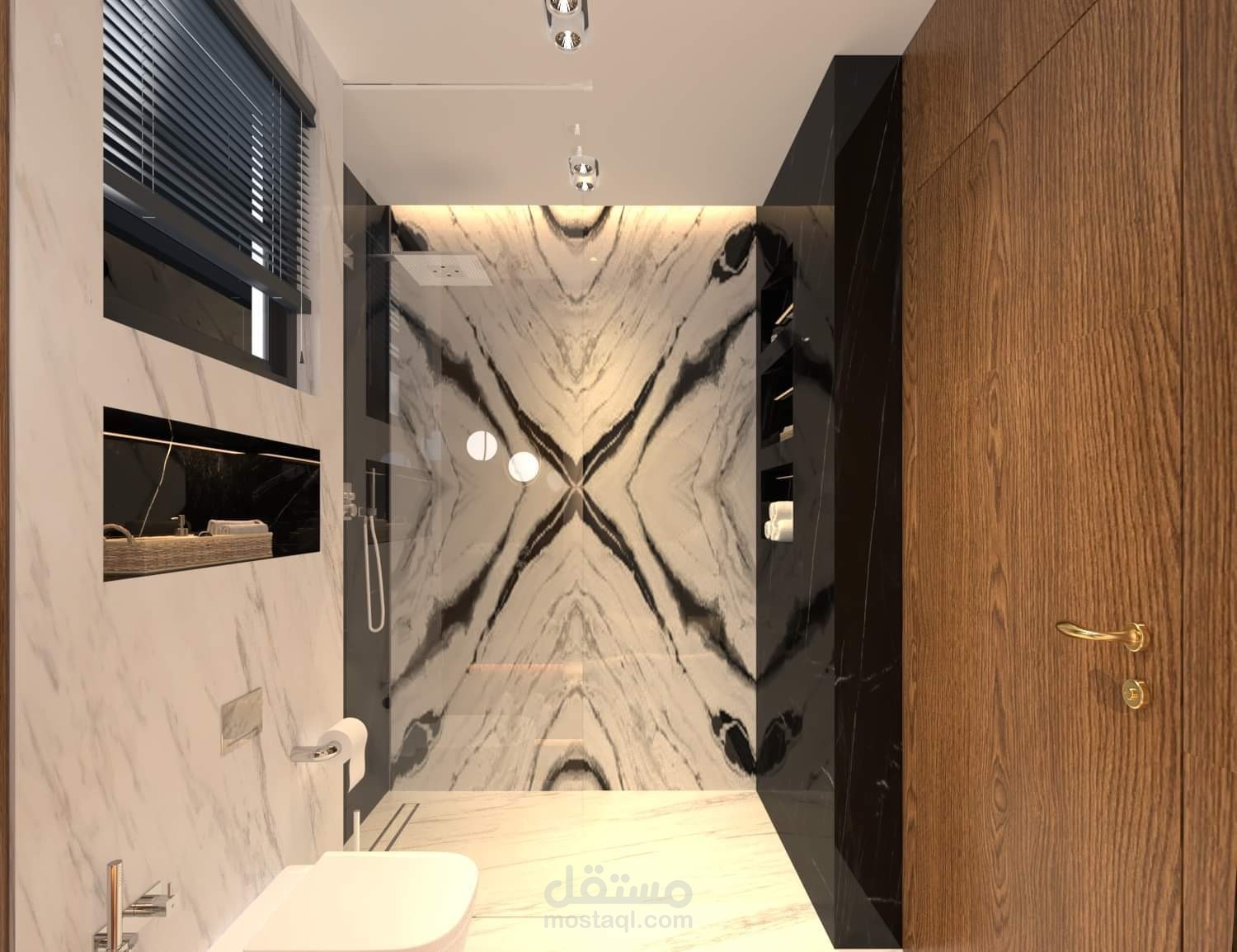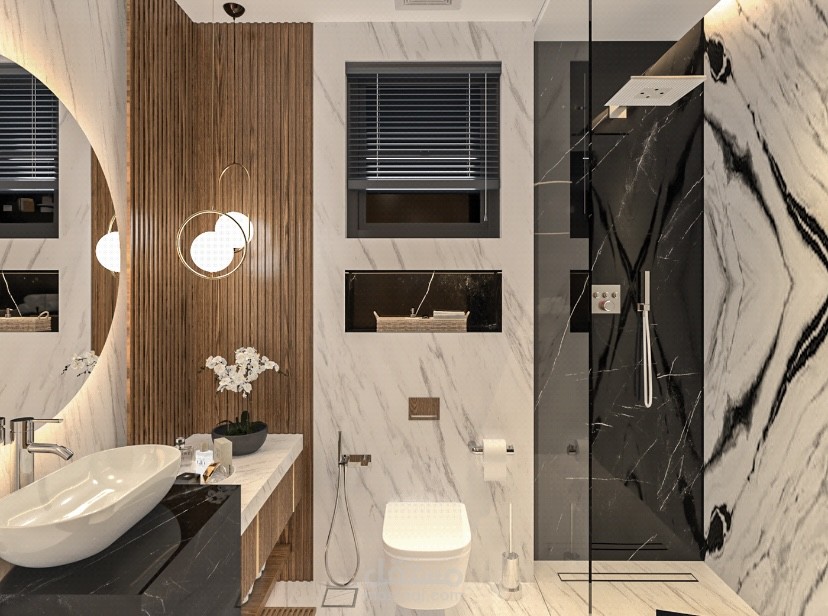 حمام صغير في شقه يتميز بالوان الخشب مع رخام الباندا