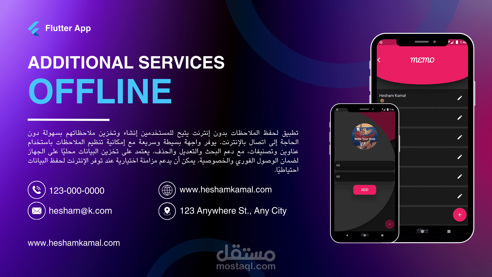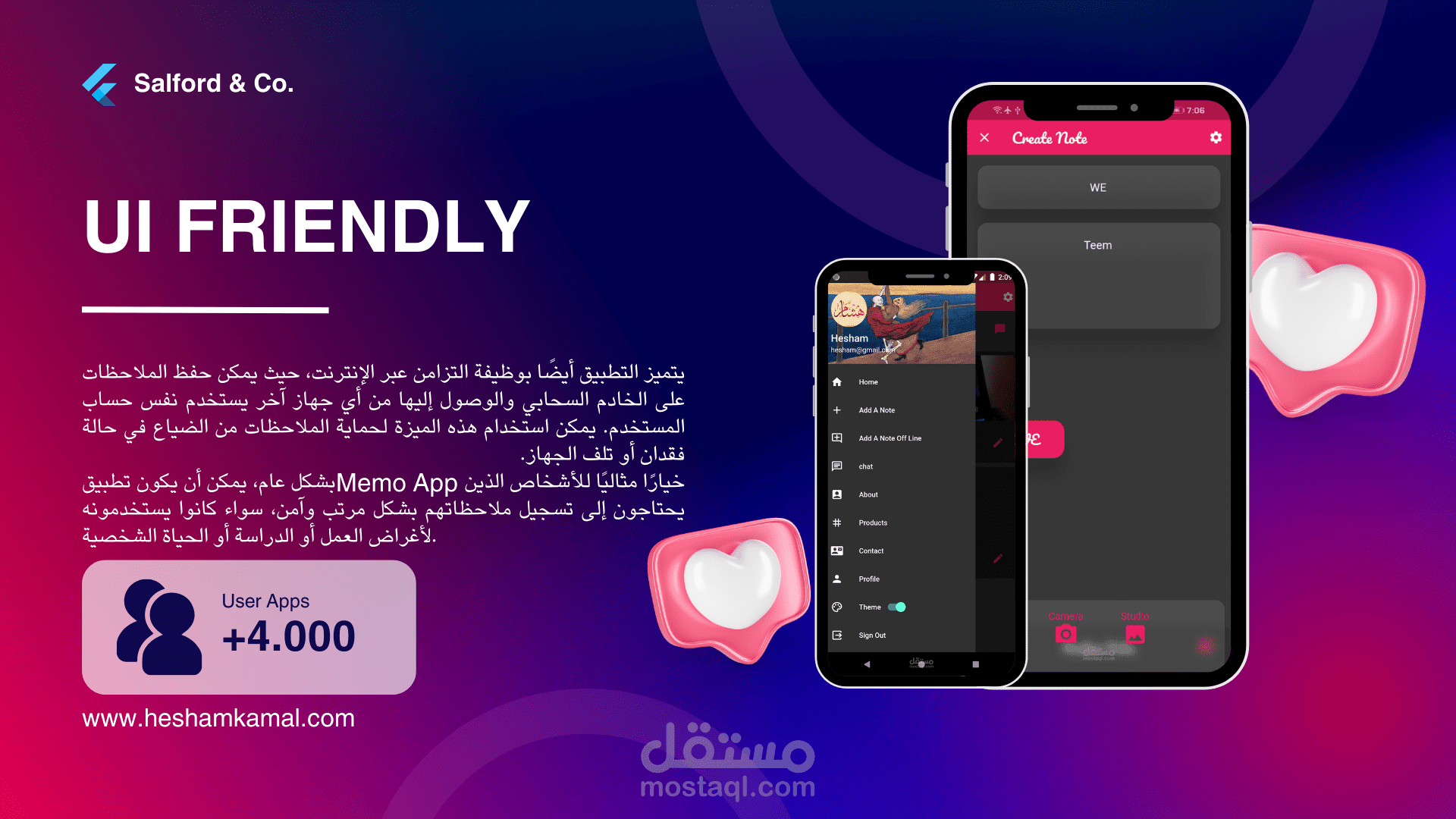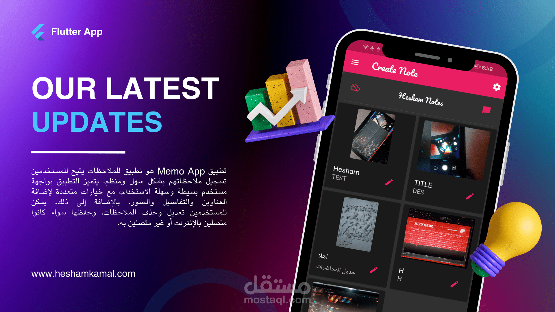 تطبيق Memo App هو تطبيق للملاحظات يتيح للمستخدمين تسجيل ملاحظاتهم بشكل سهل ومنظم. يتميز التطبيق بواجهة مستخدم بسيطة وسهلة الاستخدام، مع خيارات متعددة لإضافة العناوين والتفاصيل والصور. بالإضافة إلى ذلك، يمكن للمستخدمين تعديل وحذف الملاحظات، وحفظها سواء كانوا متصلين بالإنترنت أو غير متصلين به.