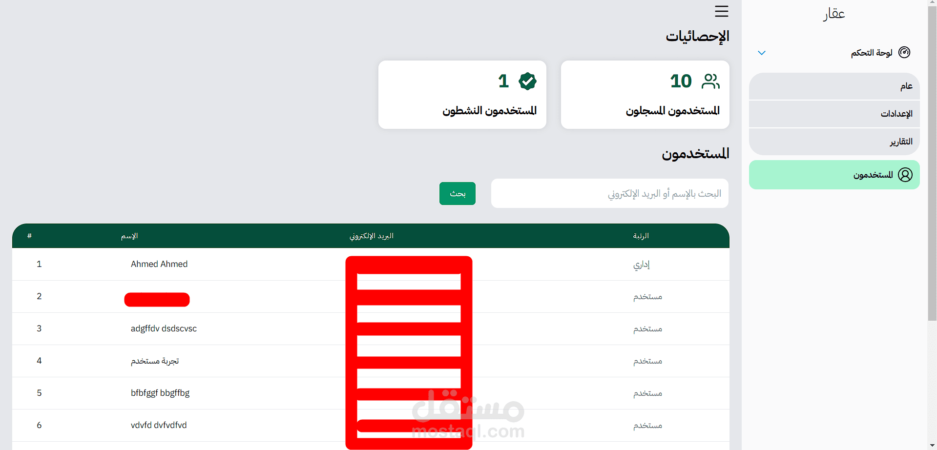 لوحة تحكم للمسؤول لإدارة المستخدمين والعقارات.