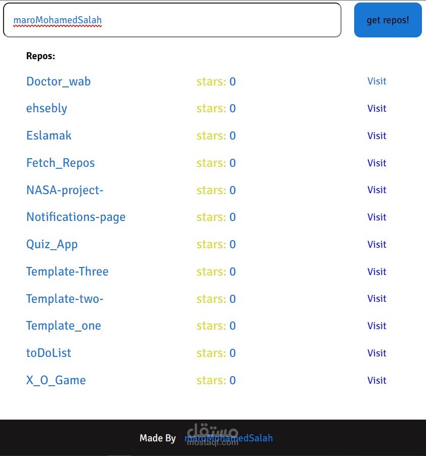 تم إنجاز هذا المشروع خلال يوم واحد فقط. يسمح للمستخدمين بإدخال اسم المستخدم في GitHub ، وبعد ذلك يقوم الموقع بجلب المستودعات المرتبطة بهذا المستخدم وعرض عدد النجوم لكل منها. يمكن للمستخدم اختيار أي من المستودعات المدرجة لزيارتها وعرض محتواها.