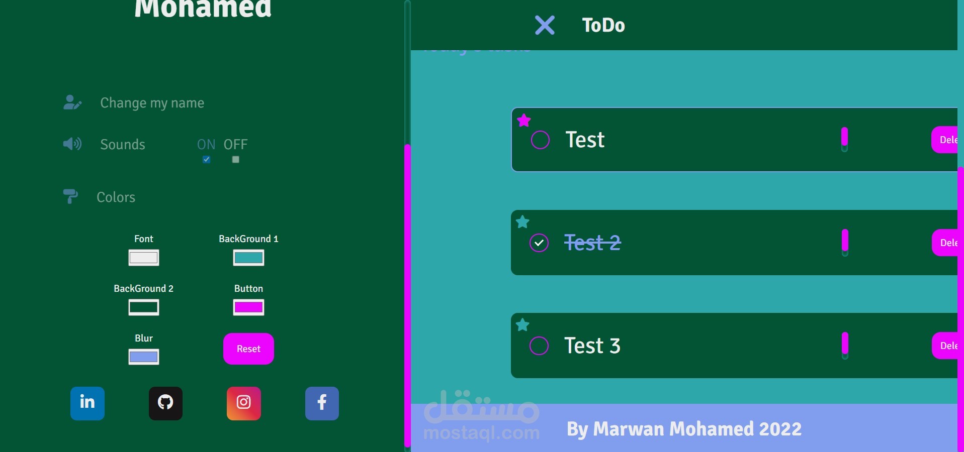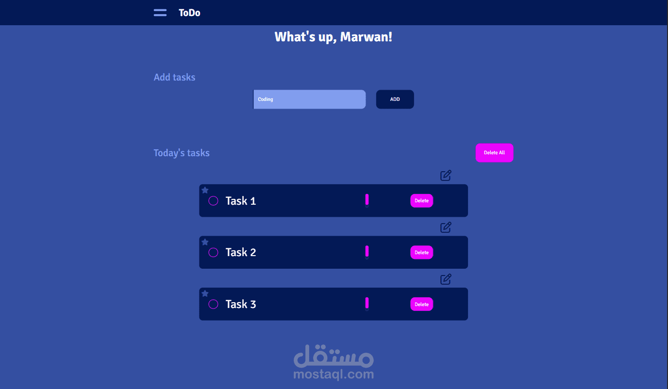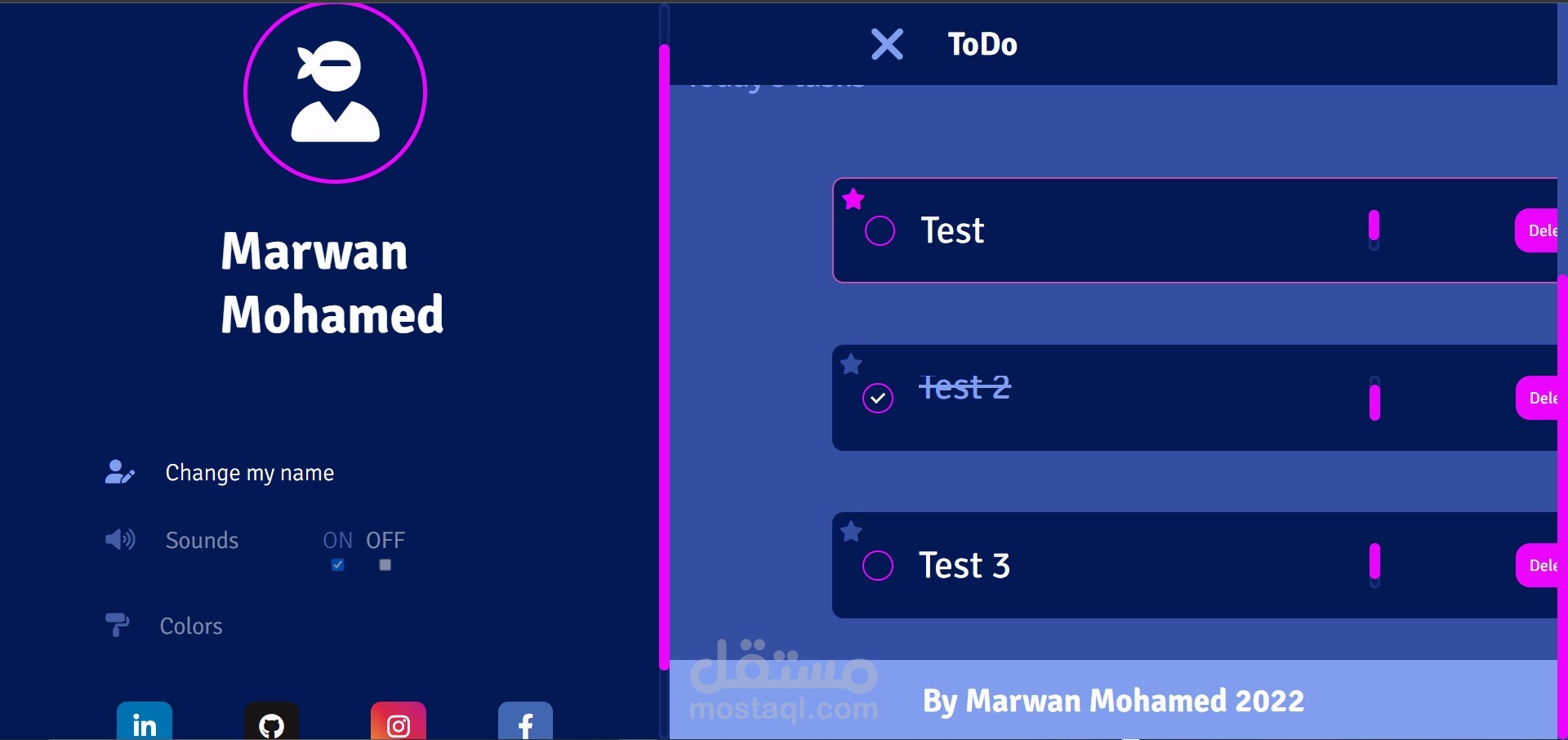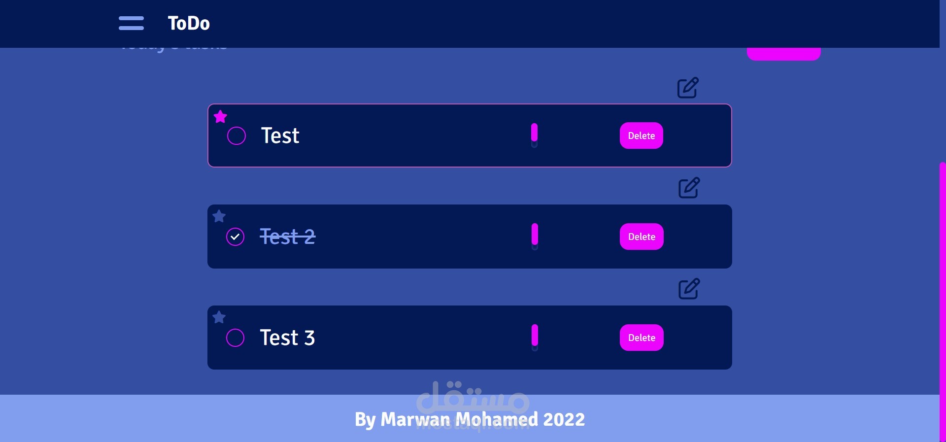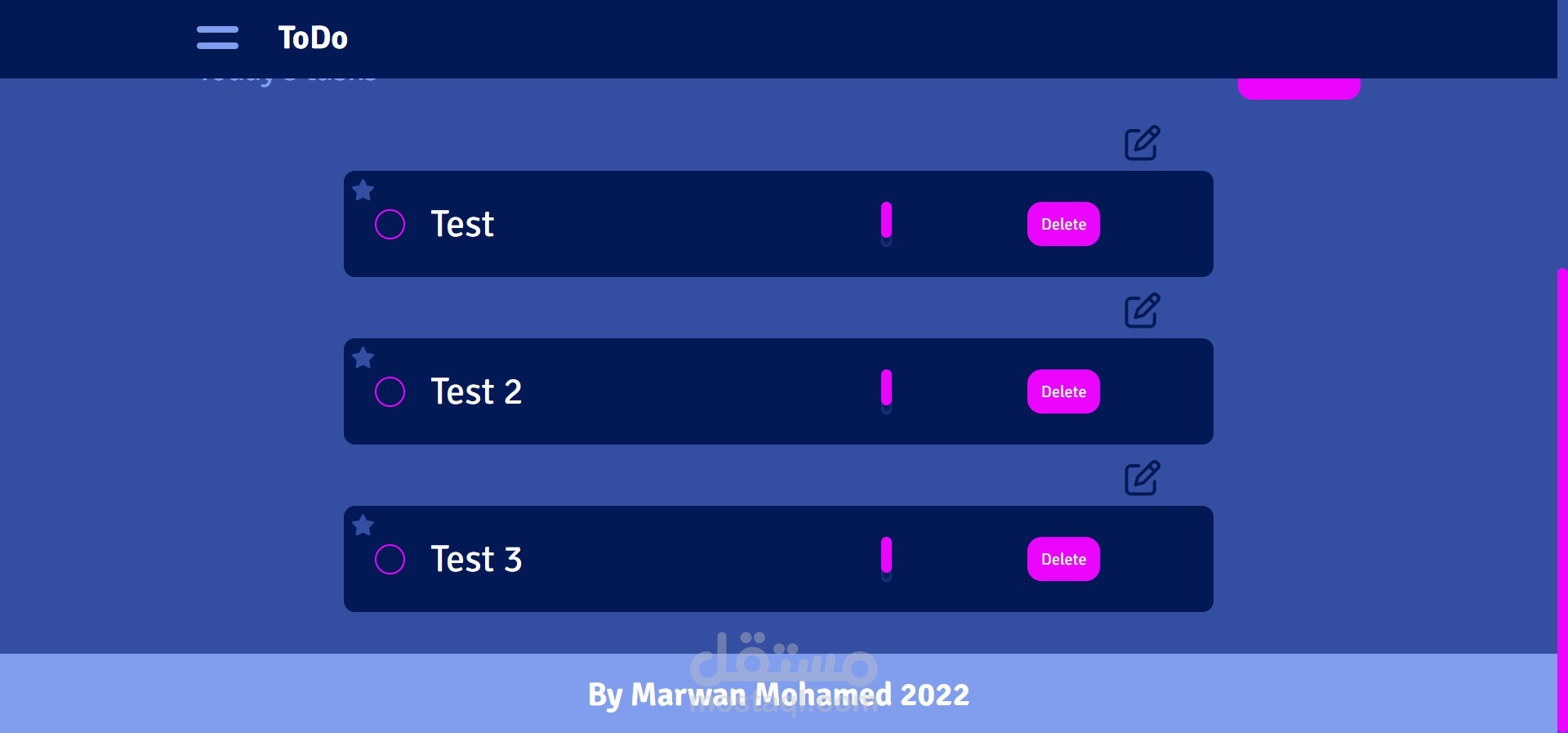 تم إنجاز هذا المشروع خلال أسبوع واحد. يتضمن صفحة تسجيل الدخول التي تسمح للموقع بالتعرف عليك باستخدام التخزين المحلي. لديك القدرة على تغيير جميع الألوان في الموقع وإيقاف تشغيل الموسيقى. بالإضافة إلى ذلك، يمكنك تحرير محتوى المهام ووضع علامة عليها كمهمة مهمة. تم تصميم واجهة المستخدم من قبلي وتحويلها إلى رمز برمجي أمامي باستخدام HTML و CSS و JS.