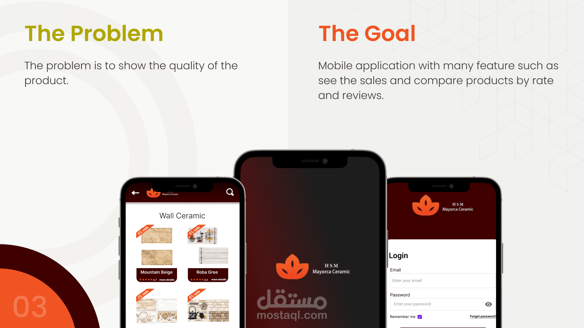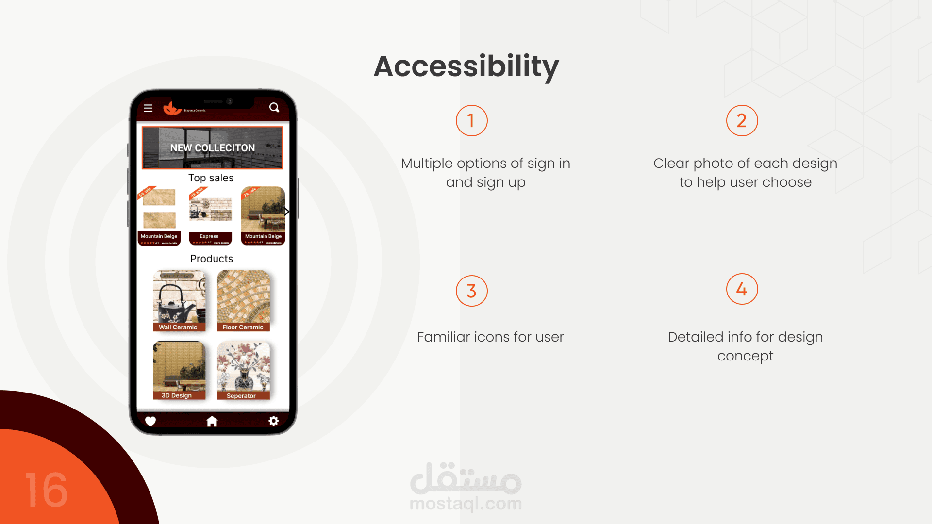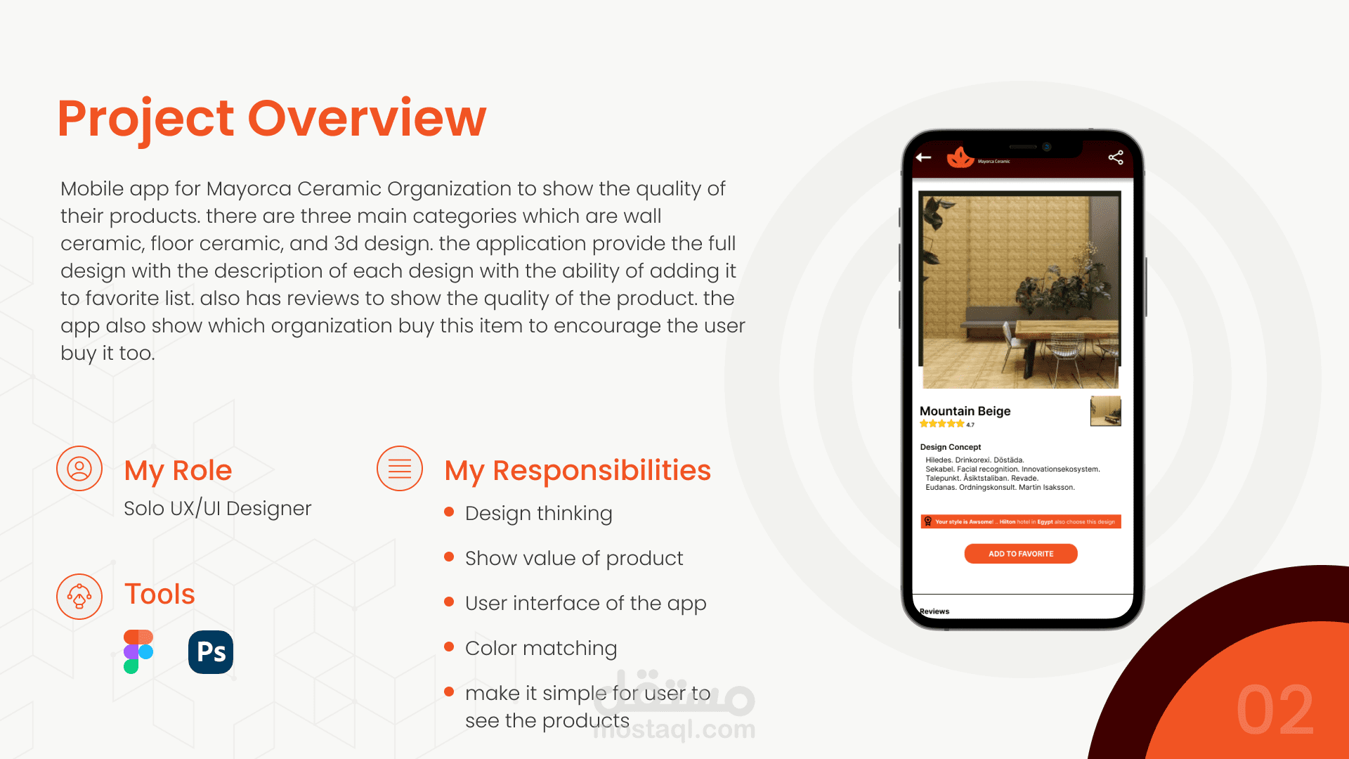 تصميم لشركة سيراميكا مايوركا لعرض المنتجات الجديدة للتجار بشكل مبسط. التطبيق يوضح قيمة المنتج والفكرة وراء كل تصميم.