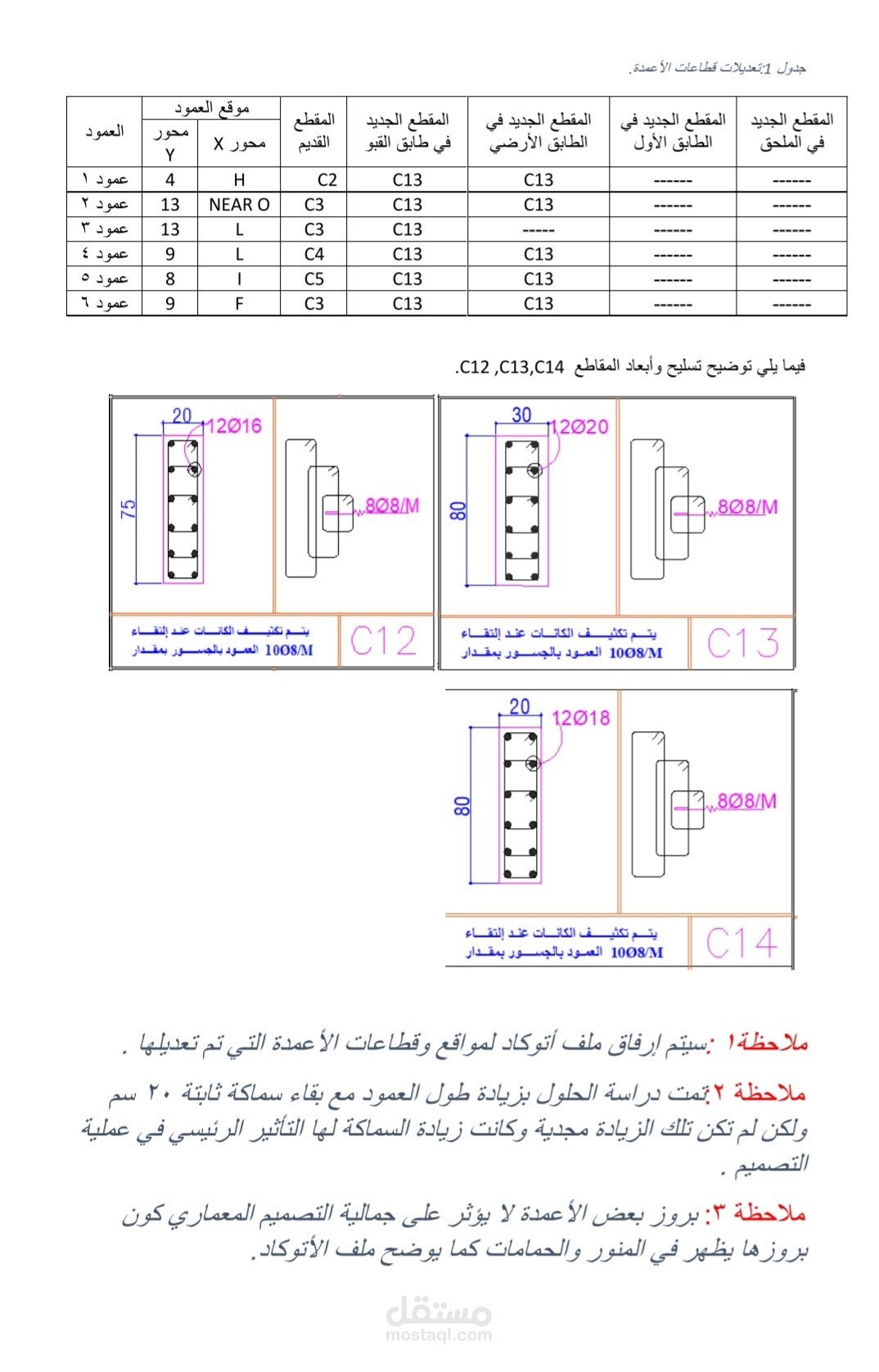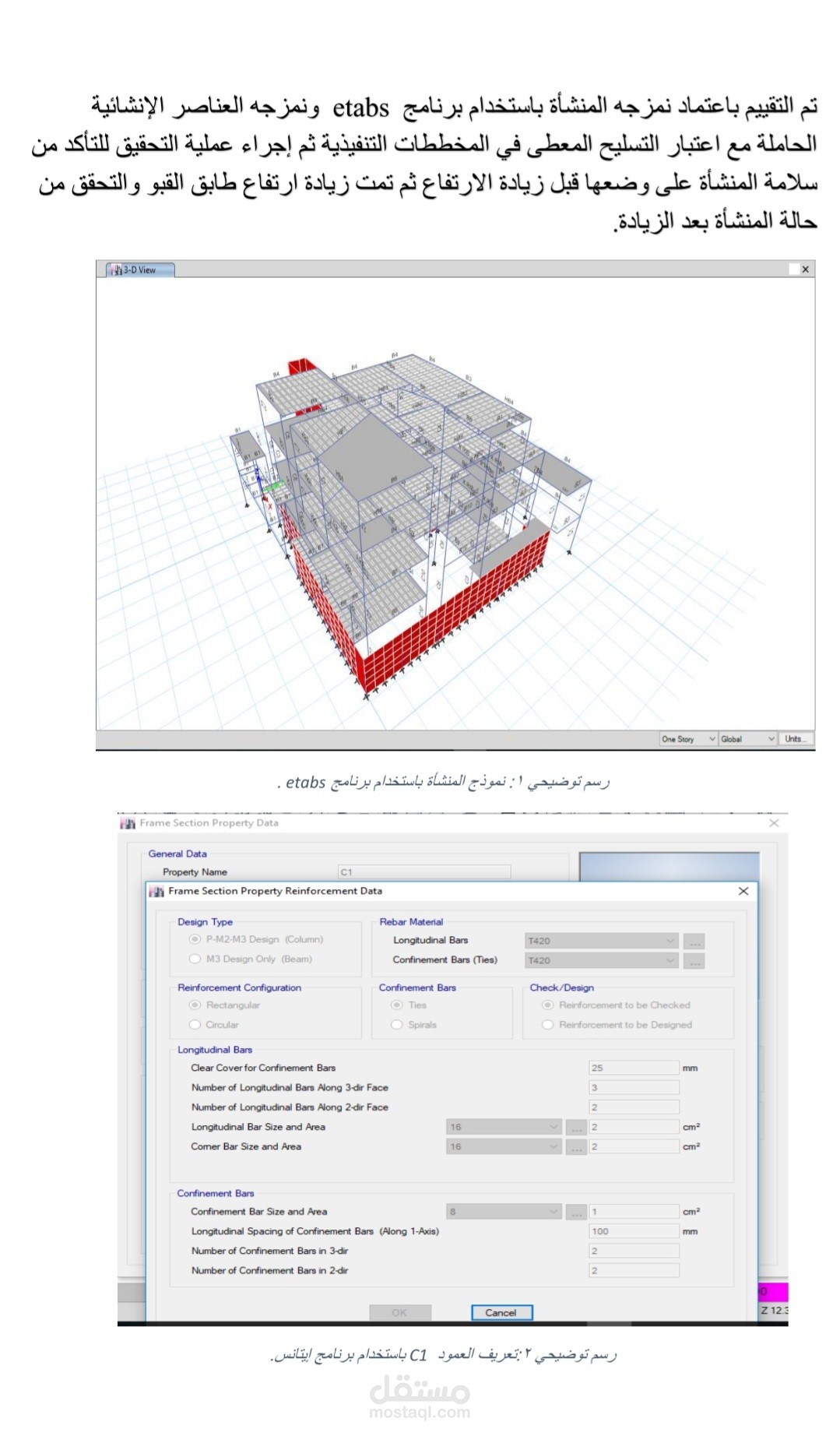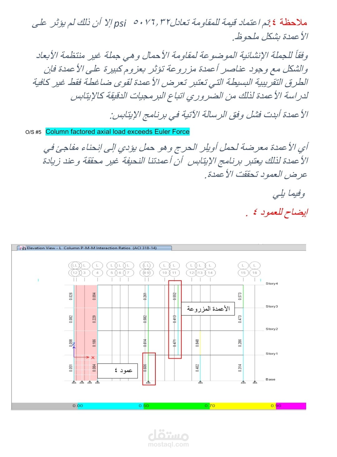 بعد النمذجة على الإيتابس و التحقق من المخططات التنفيذية المرفقة ...تبين أن هناك ستة أعمدة غير آمنة وذلك قبل زيادة ارتفاع القبو .