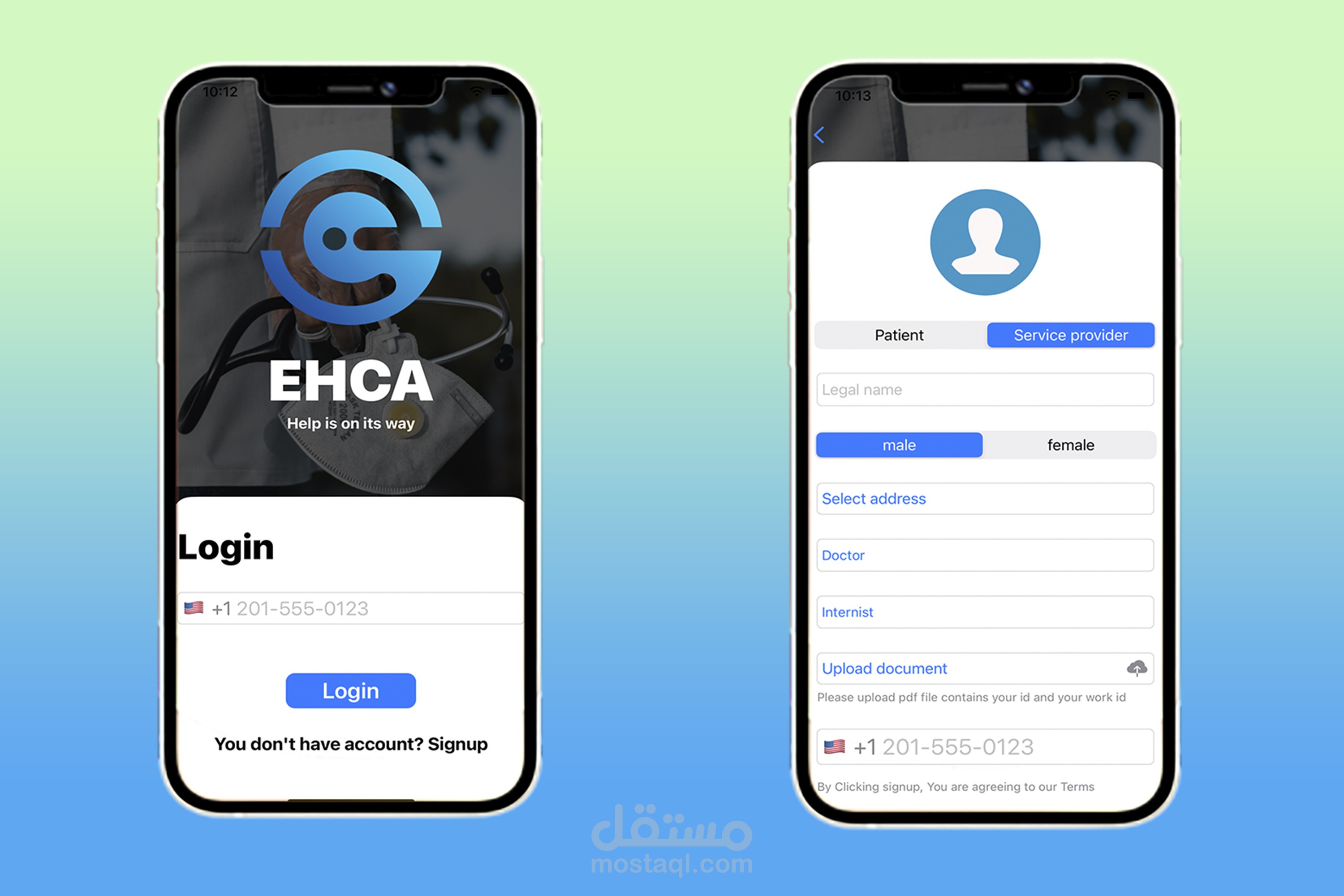 تسجيل الدخول / التسجيل: يتضمن تسجيل الدخول الذي يستند إلى رقم الهاتف مع التحقق برمز OTP، وتسجيل المرضى، وتسجيل مقدمي الخدمات مع تحميل وثيقة التحقق الطبي.
