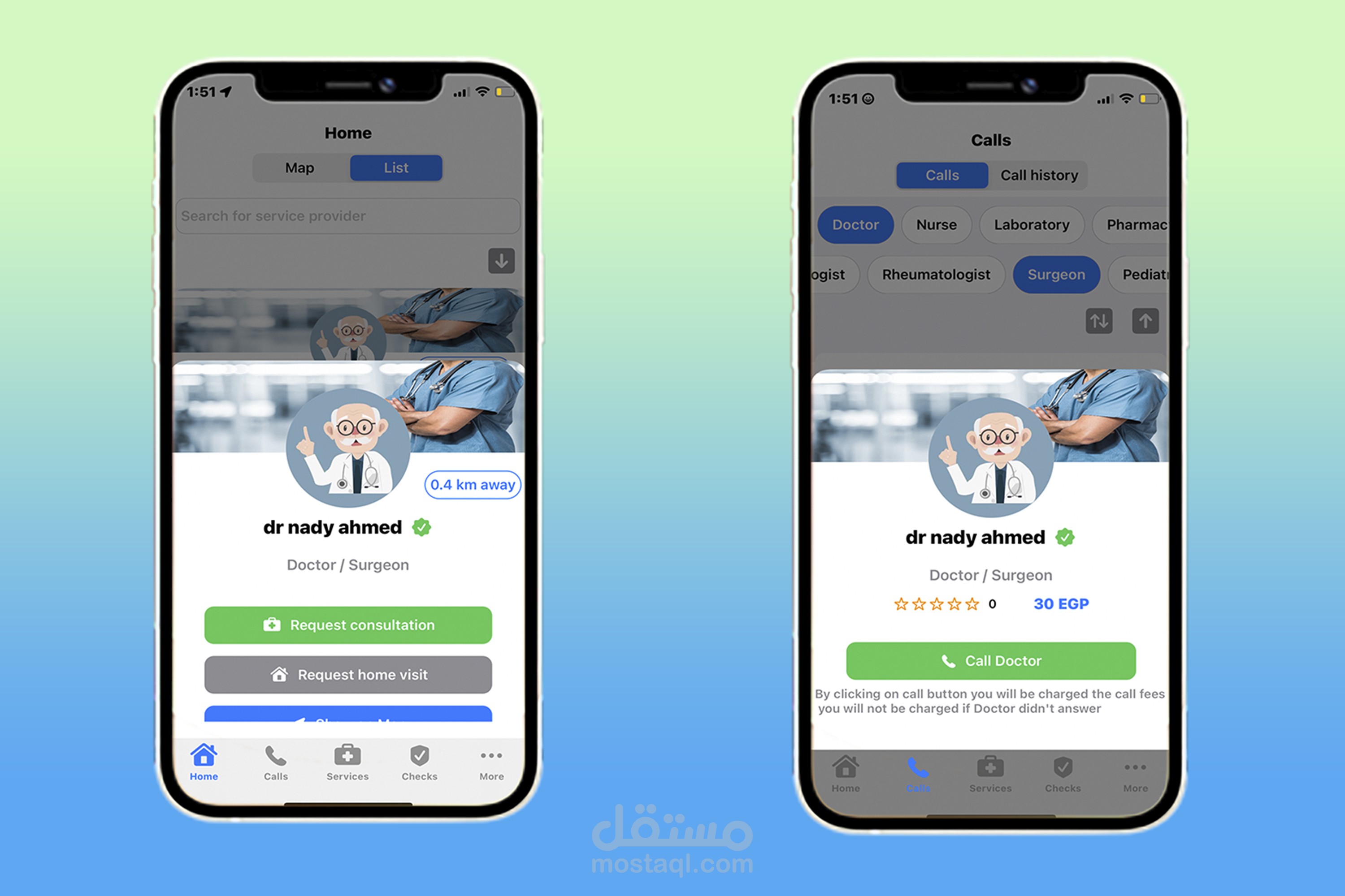 الصفحة الرئيسية: بالنسبة للمرضى، يقدّم مجموعة من الوظائف مثل عرض مقدمي الخدمات القريبين على الخريطة أو القائمة، طلب مكالمة أو زيارة منزلية، وأكثر من ذلك. بالنسبة لمقدّمي الخدمات، يتيح لهم قبول طلبات المكالمات والزيارات المنزلية.