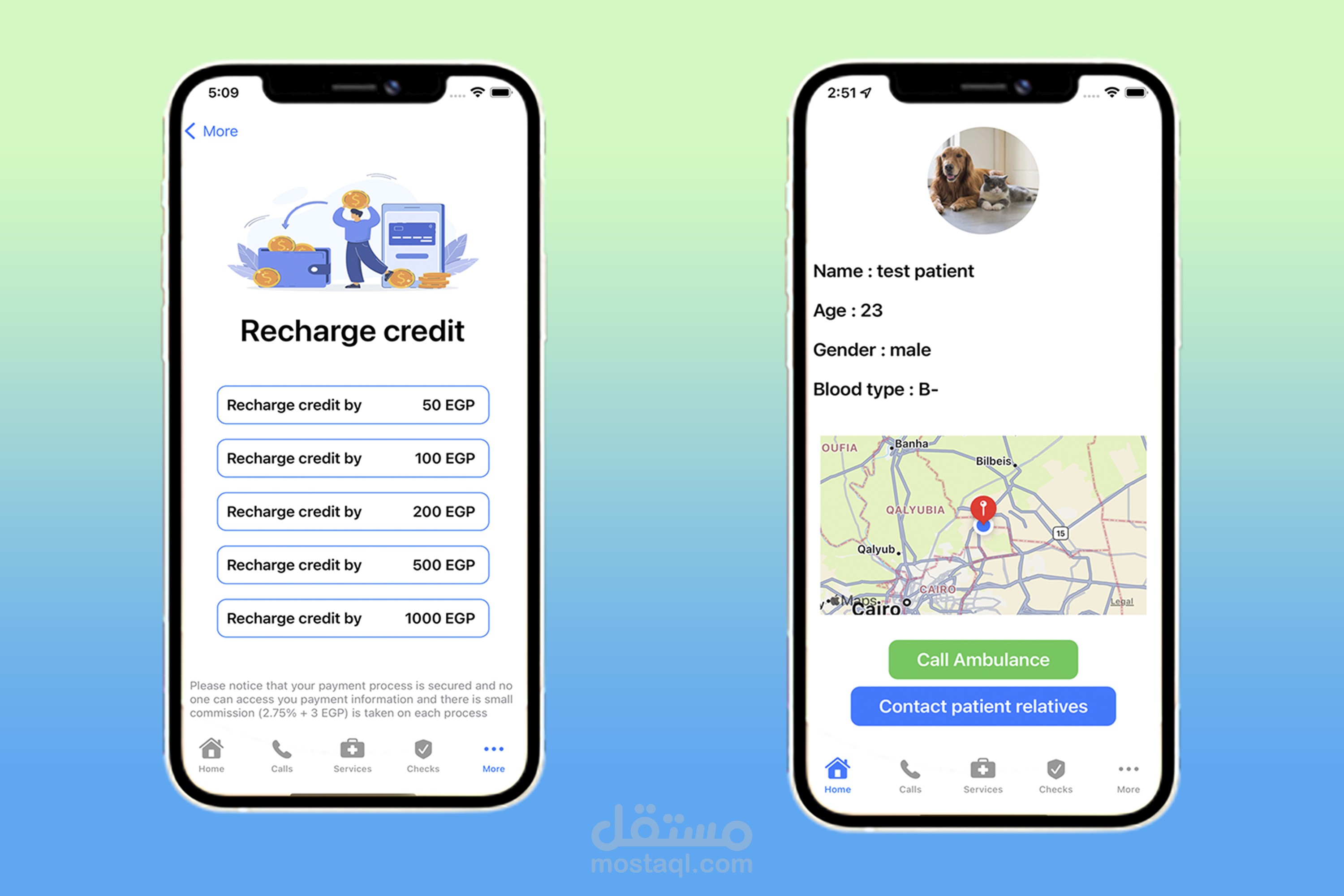 صفحة المكالمات: تتيح للمرضى عرض مقدّمي الخدمات المتاحين، والتصفية حسب المهنة، وطلب المكالمات الصوتية/المرئية، وعرض سجل المكالمات، وتقييم مقدّمي الخدمات. يستطيع مقدّمو الخدمات عرض سجلات مكالماتهم وقبول المكالمات، وإرسال الوصفات الطبية، وعرض المال المكتسب.