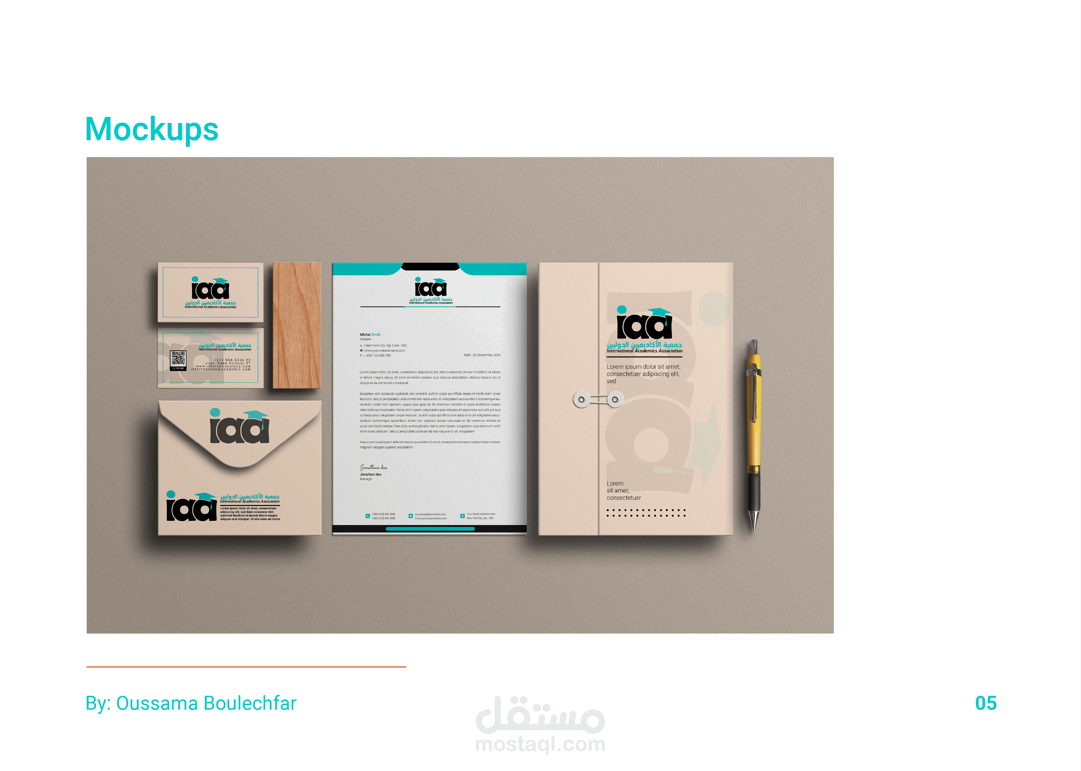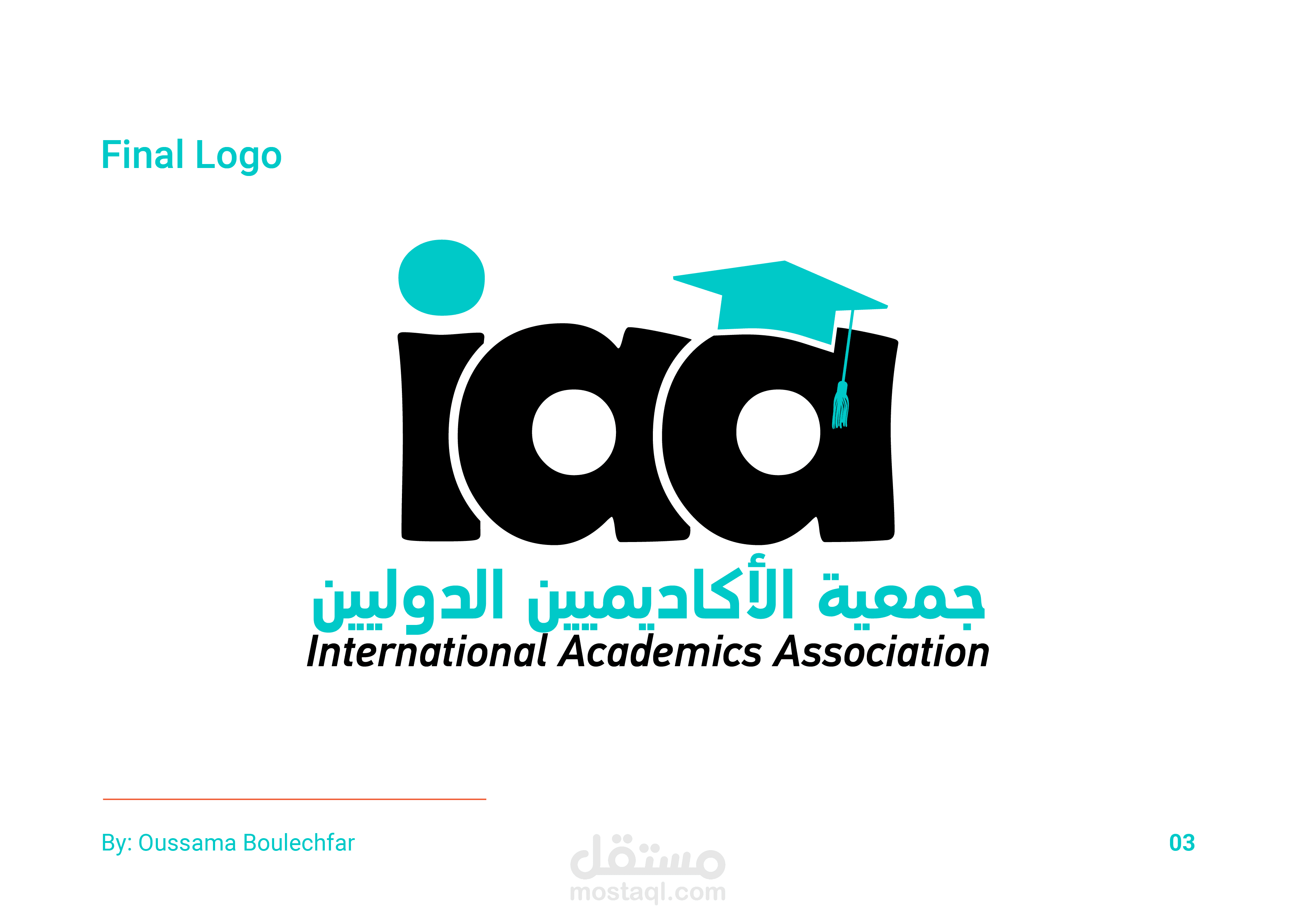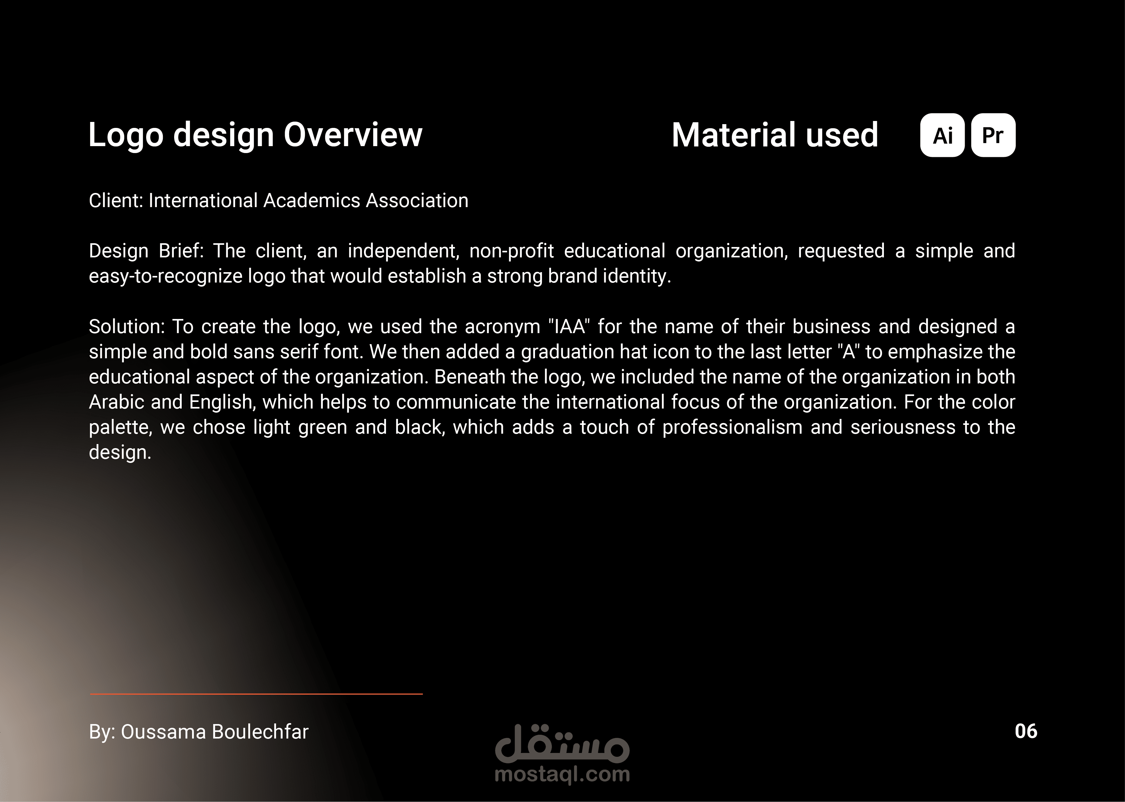 الحل: لإنشاء الشعار ، استخدمنا الاختصار "IAA" لاسم أعمالهم وصممنا خطًا بسيطًا وجريئًا بلا خط. ثم قمنا بإضافة أيقونة قبعة التخرج إلى الحرف الأخير "A" للتأكيد على الجانب التربوي للمنظمة. تحت الشعار ، قمنا بتضمين اسم المنظمة باللغتين العربية والإنجليزية ، مما يساعد على إيصال التركيز الدولي للمنظمة. بالنسبة للوحة الألوان ، اخترنا الأخضر الفاتح والأسود ، مما يضيف لمسة احترافية وجدية على التصميم.