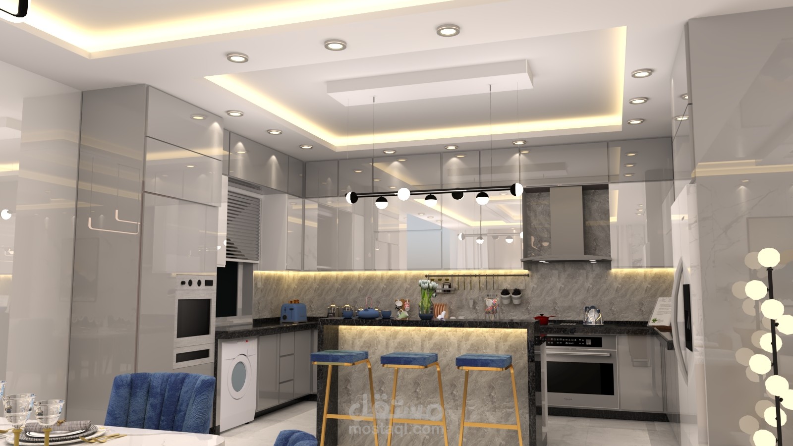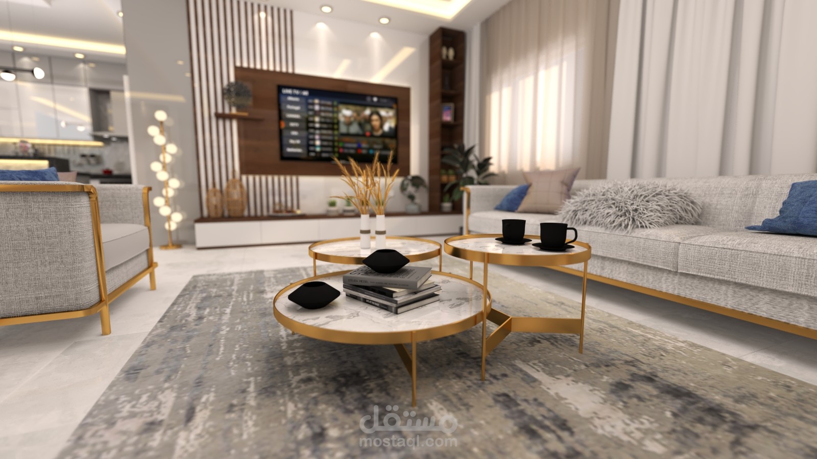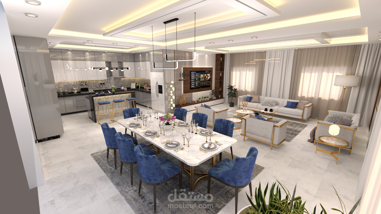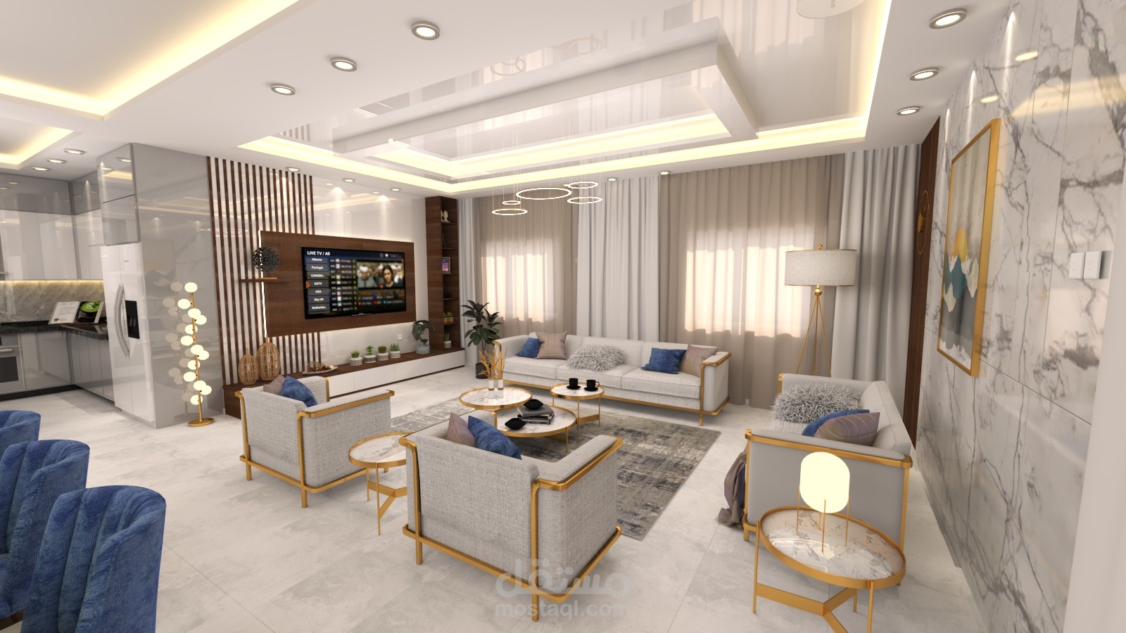 - مشروع تصميم داخلي لشقه سكنية (غرفة معيشة + مطبخ + صالة طعام ).