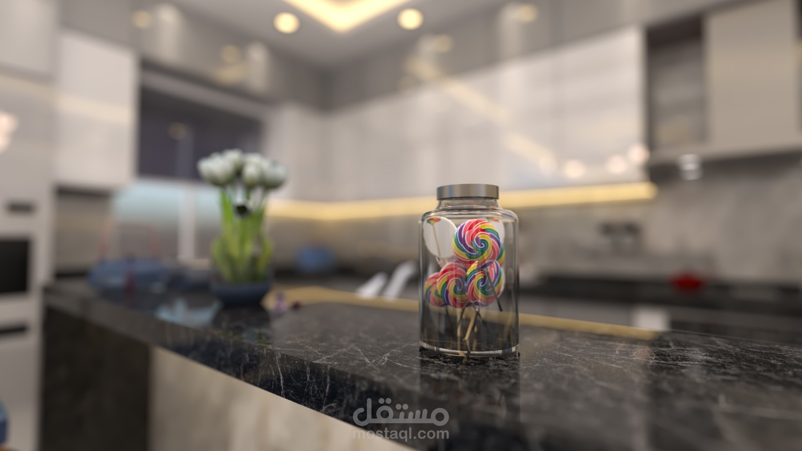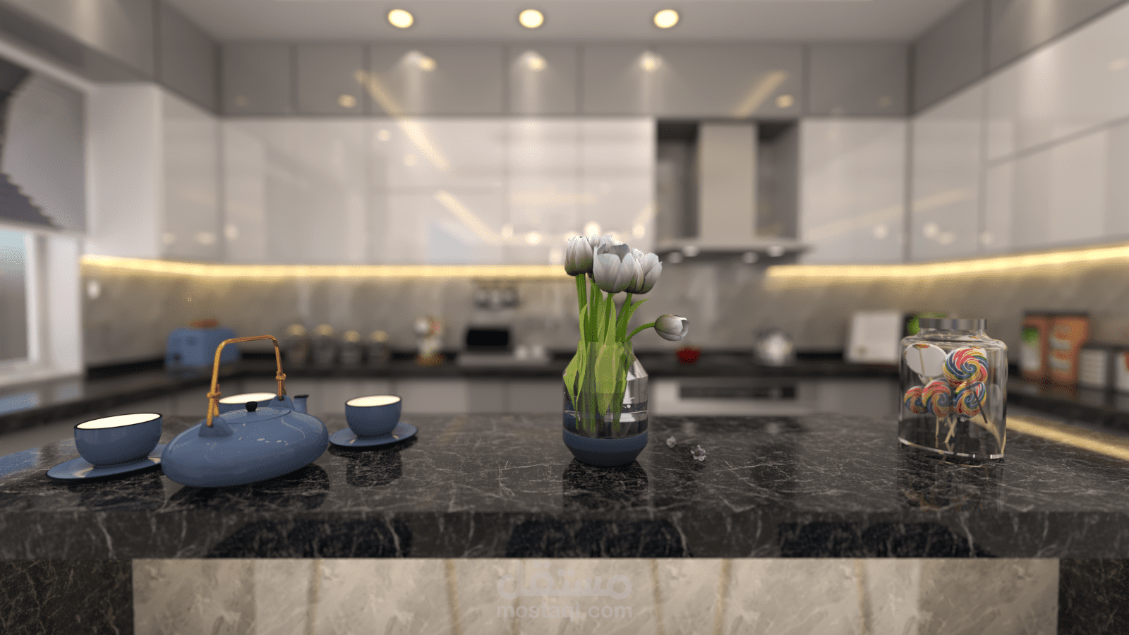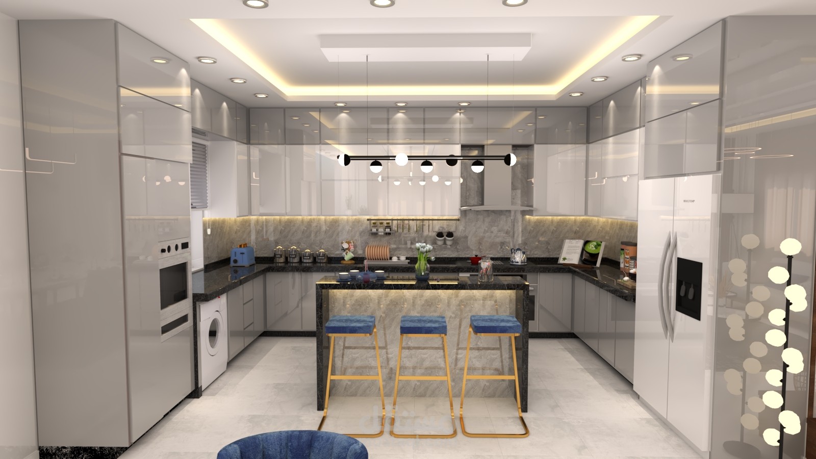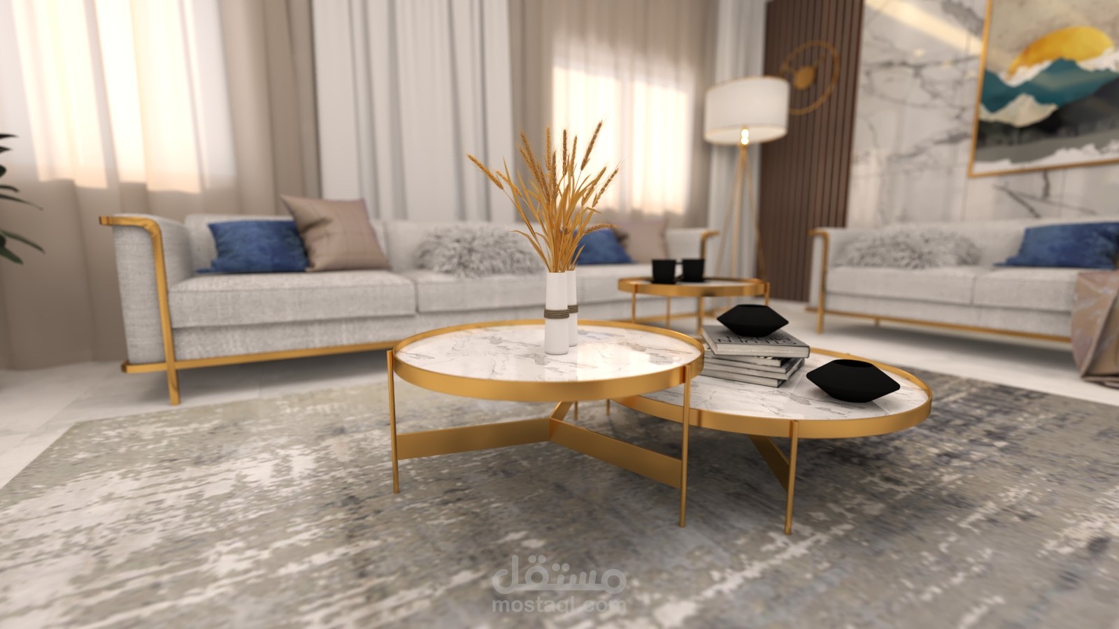 - مشروع تصميم داخلي لشقه سكنية (غرفة معيشة + مطبخ + صالة طعام ).