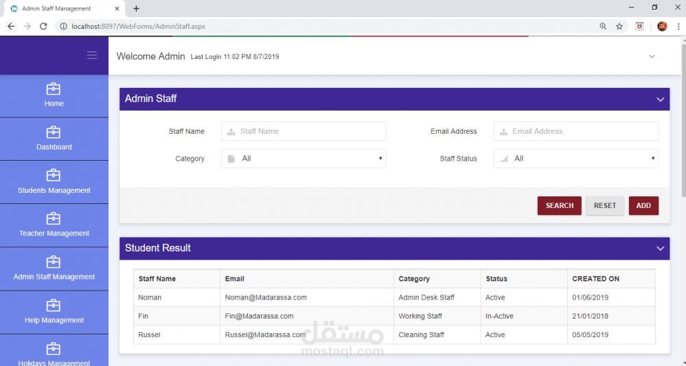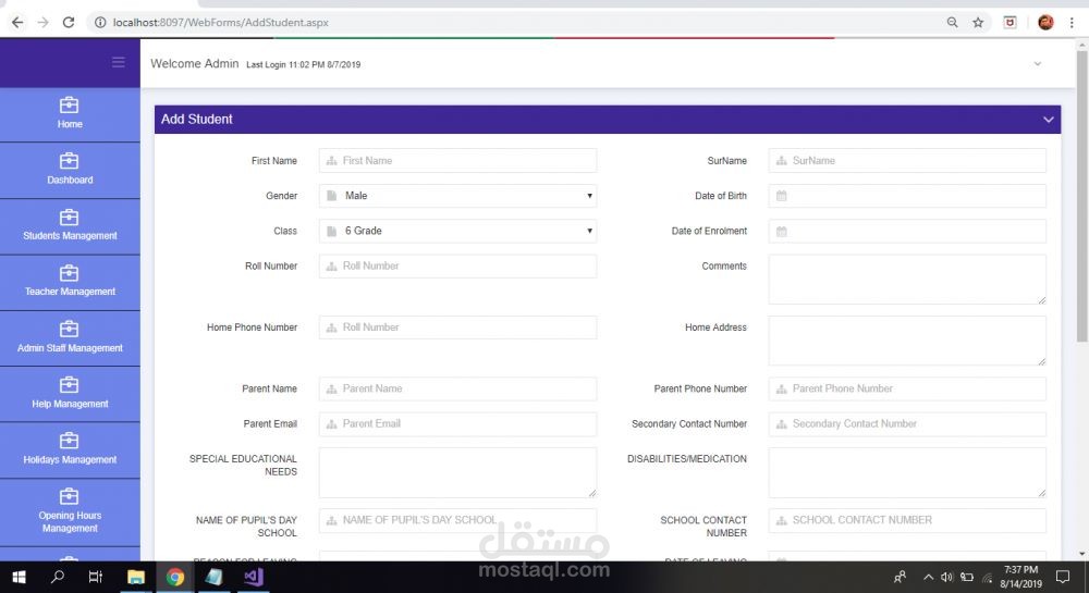 برنامج إدارة المدرسة به لوحة التحكم وإدارة الطلاب والمعلمين وإدارة الموظفين الإداريين وجميع الاستفسارات المتعلقة بالحضور.