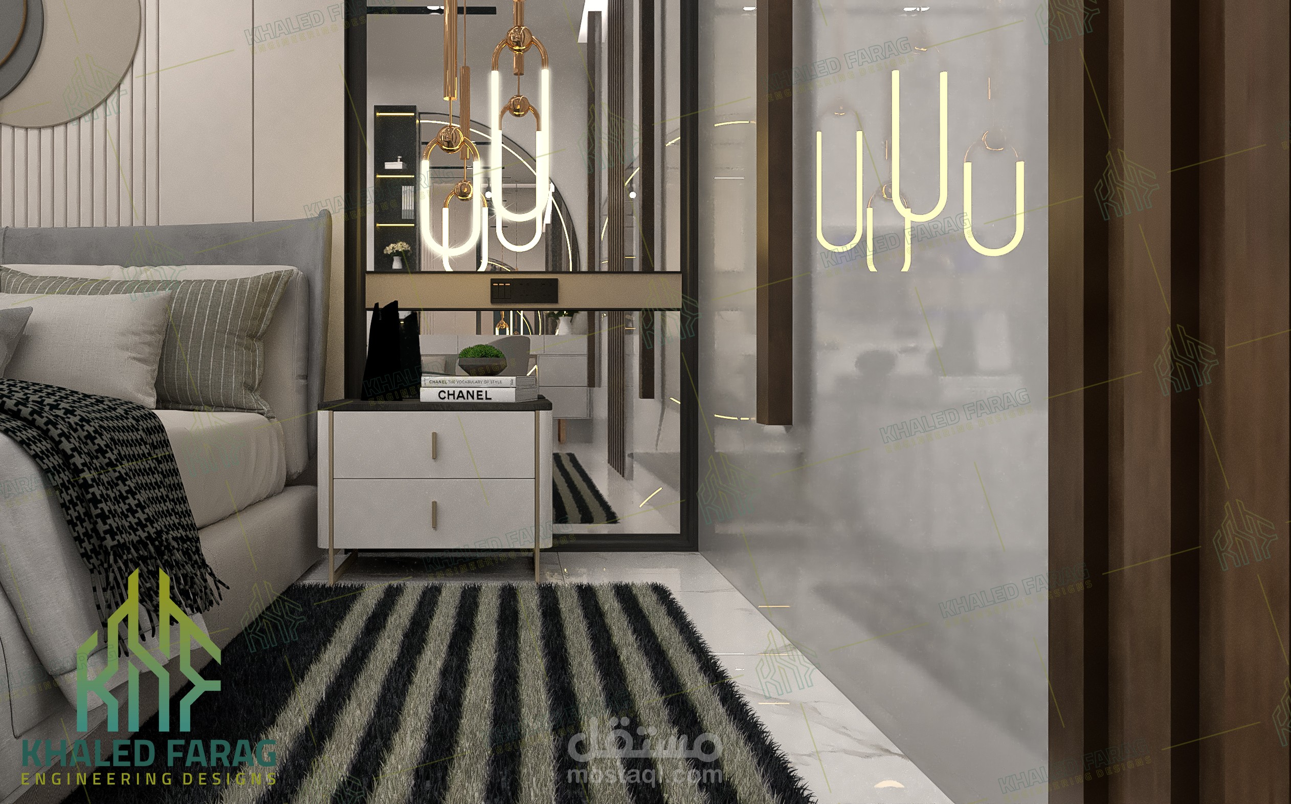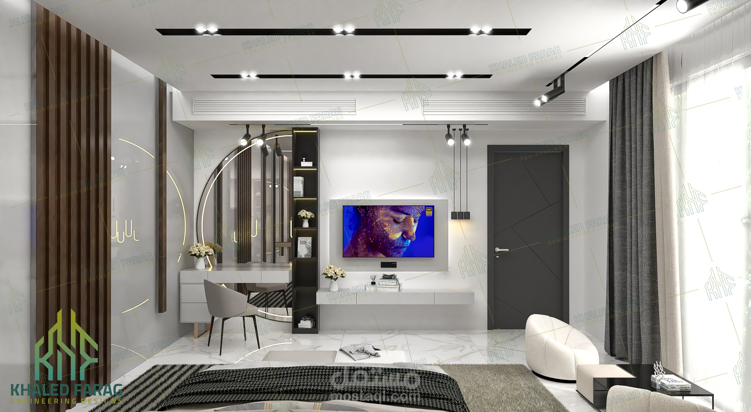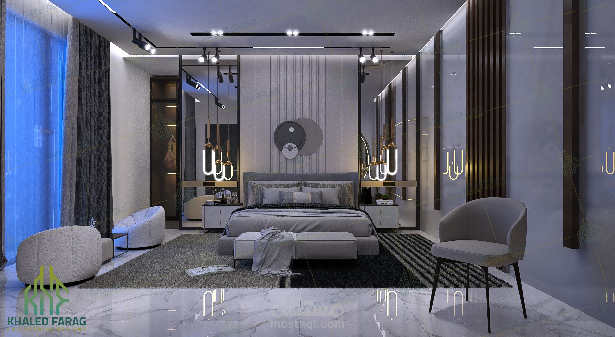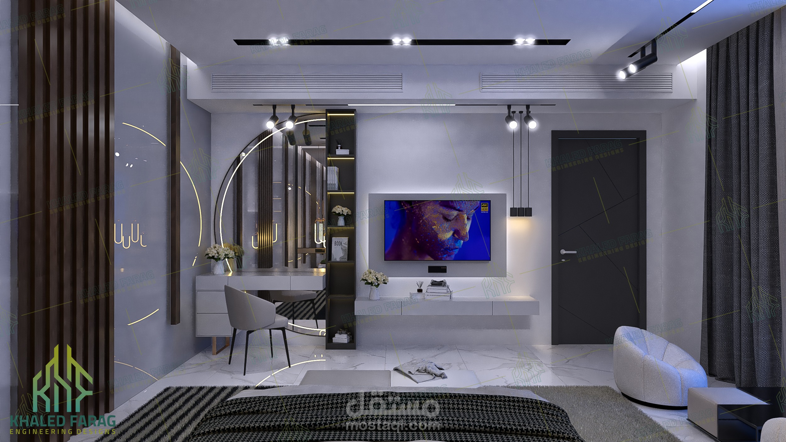تصميم غرفة نوم مودرن بمشهدين ليلي ونهاري