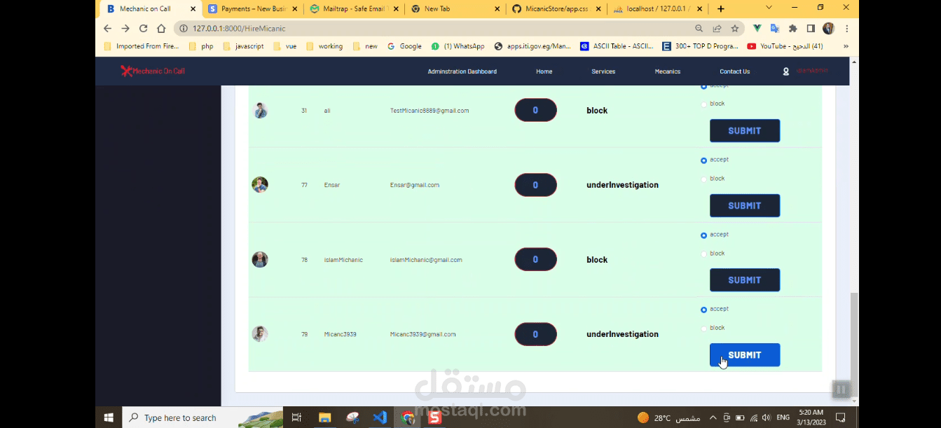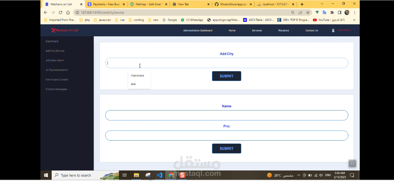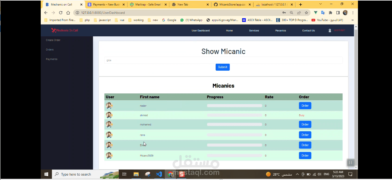 "I am glad to present this project. It is about a new idea that helps people with car issues on the road to get them fixed as quickly as possible by visiting our website and placing an order for the best-rated mechanic in the city to come and fix their problems. Our platform also helps mechanics to get freelance jobs by registering on our website as a mechanic and becoming a member of our team. You can watch a video demo in the 'Important' folder and follow the steps to run the project."