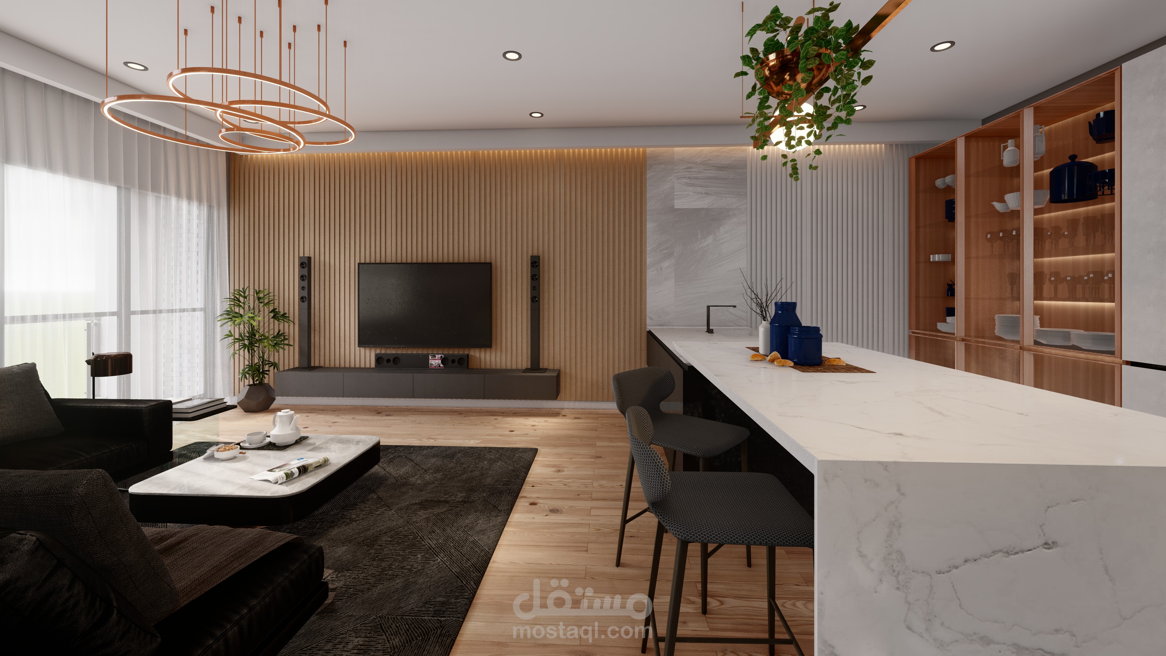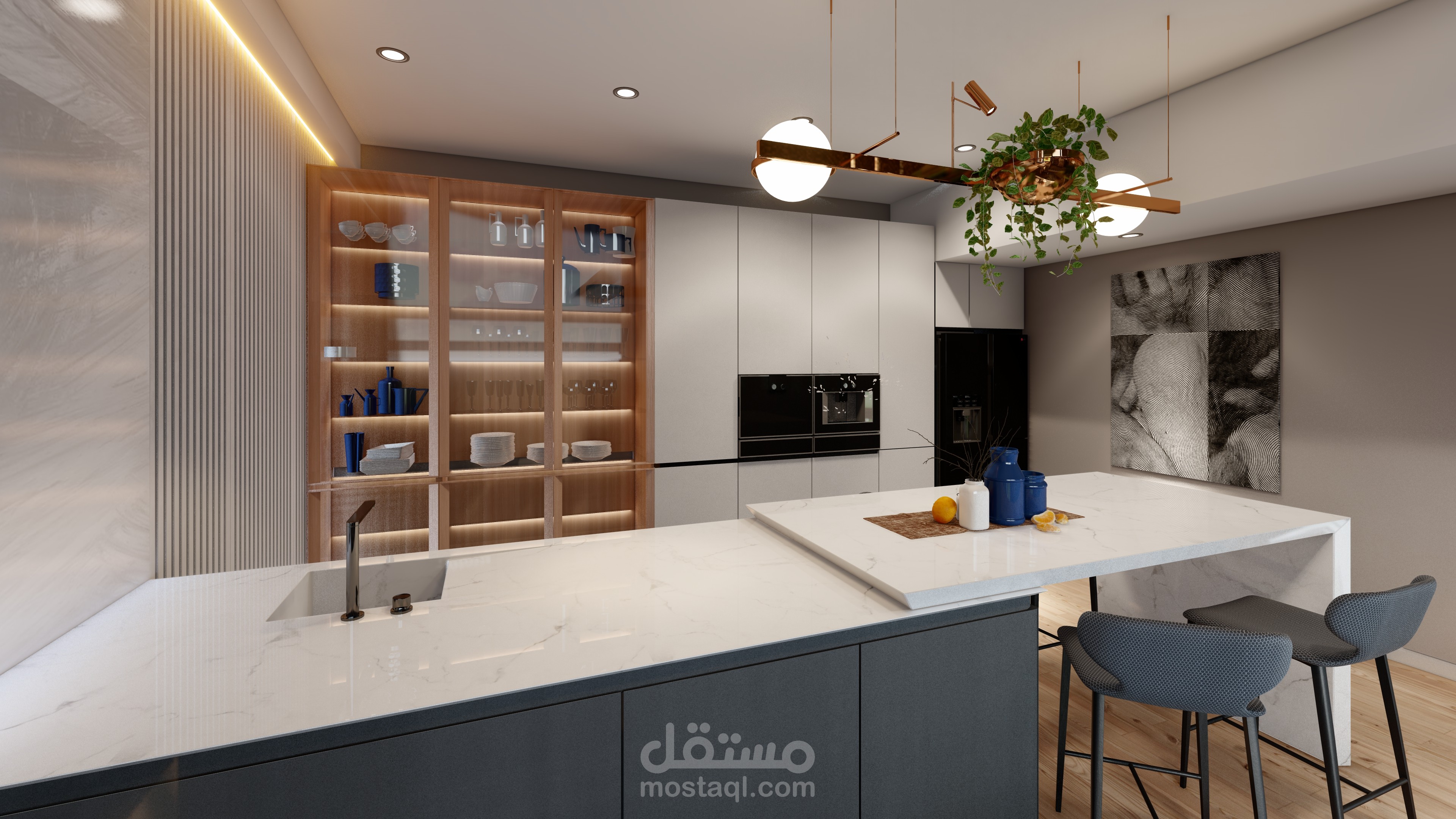تصميم داخلي متكامل بأسلوب عصري لمطبخ وصالة معيشة بتصميم مفتوح، يجمع بين الأناقة والراحة، ويعكس ذوق العميل ورؤيته الخاصة بكل تفاصيله. تم تنفيذ المشروع باستخدام برنامج SketchUp لتشكيل النموذج ثلاثي الأبعاد بدقة، ثم تقديمه بجودة عالية من خلال الرندر الواقعي في Lumion، مع اهتمام خاص بتوزيع الإضاءة، اختيار المواد، وتنسيق الألوان بطريقة مدروسة. التصميم يراعي الجانب الجمالي والوظيفي، ويقدم تجربة معيشية متناغمة ومريحة في كل زاوية. النتيجة: مساحة مفتوحة تنبض بالحياة، مصممة باحتراف لتلبي أعلى معايير التصميم الداخلي الحديث.