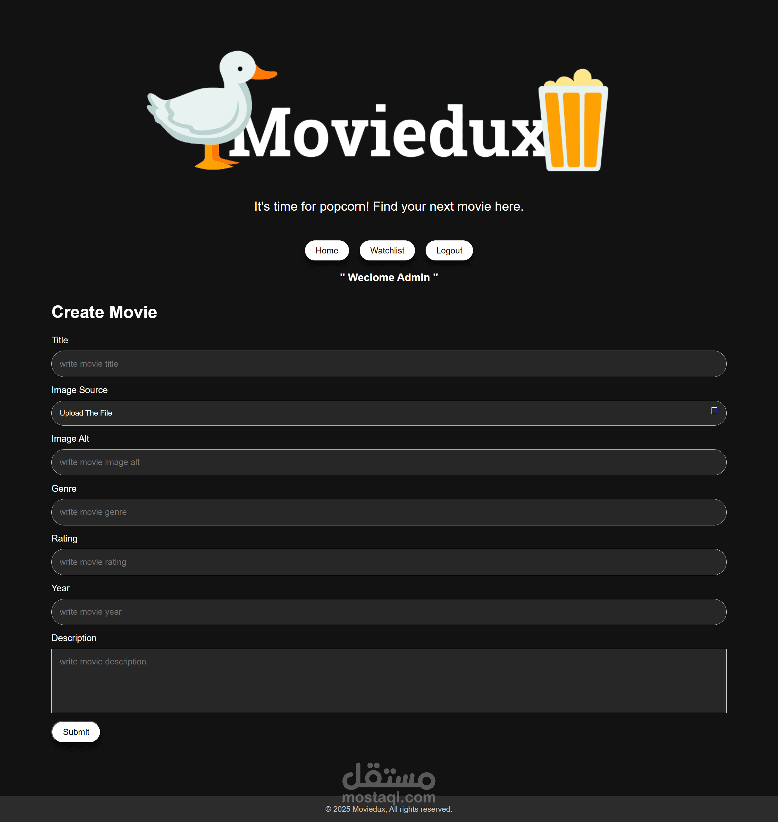 صفحة إنشاء فيلم (Create): تمكن المستخدمين من إضافة أفلام جديدة إلى قاعدة البيانات.