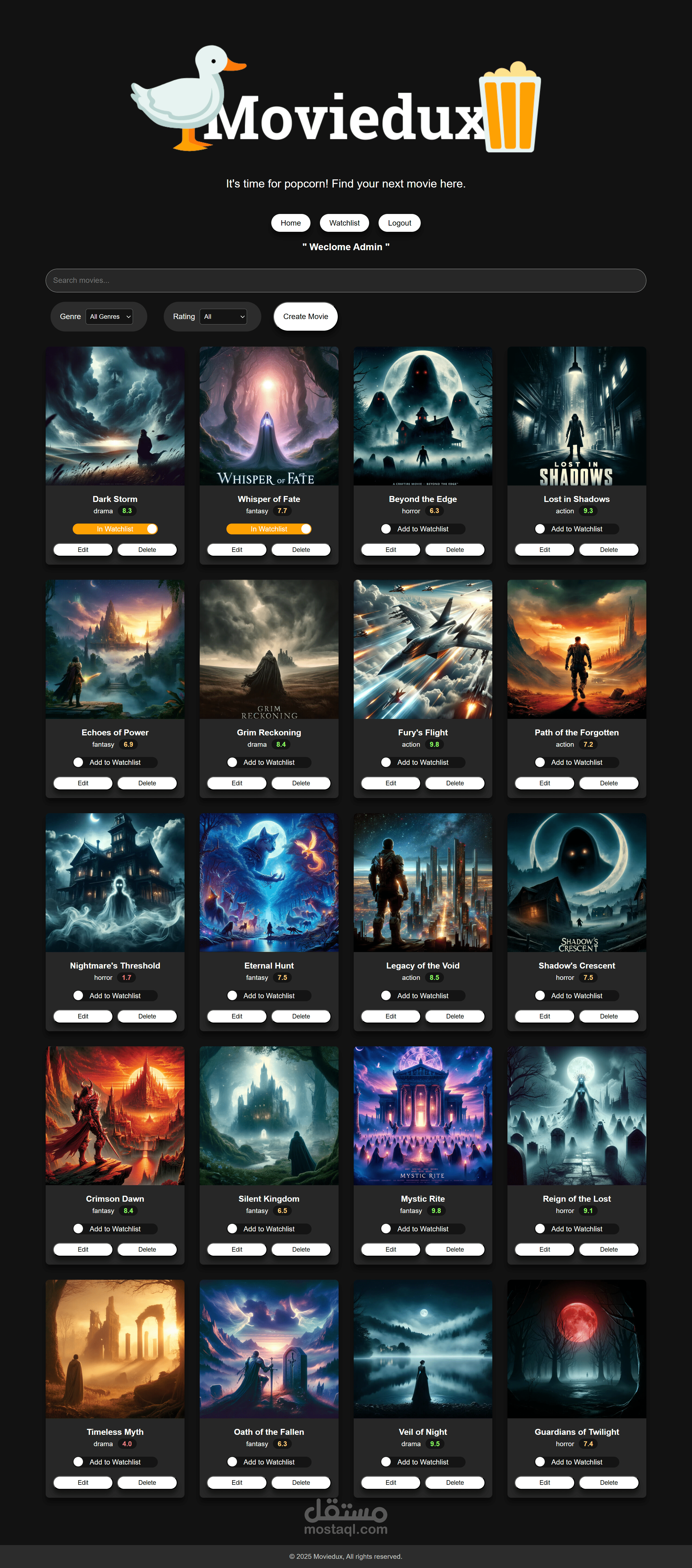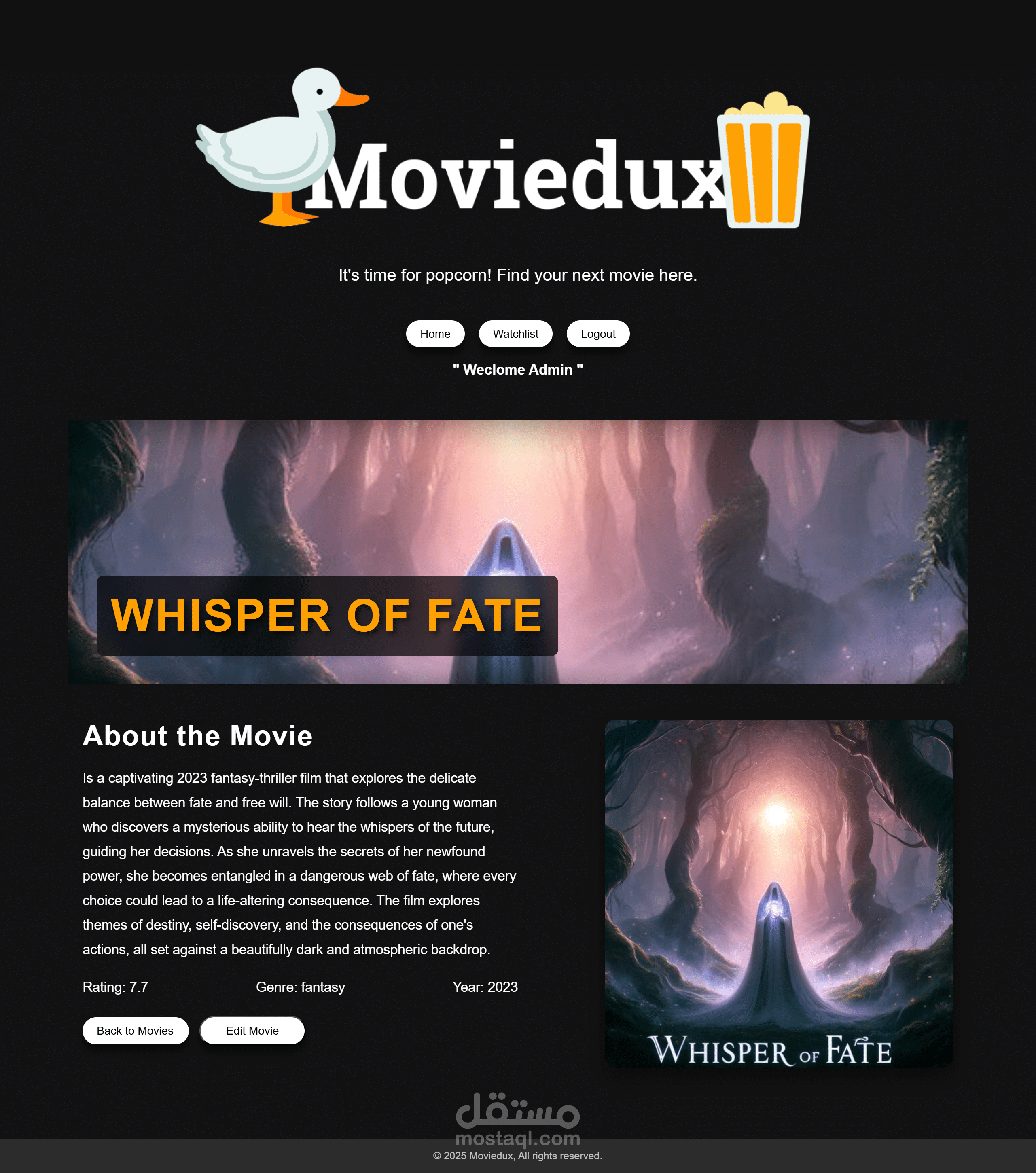 يهدف هذا المشروع إلى توفير منصة بسيطة وسهلة الاستخدام لعشاق الأفلام، حيث يمكنهم تصفح وإدارة مجموعتهم الخاصة من الأفلام. يمكن للمستخدمين إضافة أفلام إلى قائمة المشاهدة، تصفيتها حسب النوع والتقييم، بالإضافة إلى إمكانية إنشاء وتعديل وحذف الأفلام. كما يتيح التطبيق تسجيل الدخول باستخدام Auth API لحماية البيانات الشخصية وضمان تجربة مخصصة لكل مستخدم.