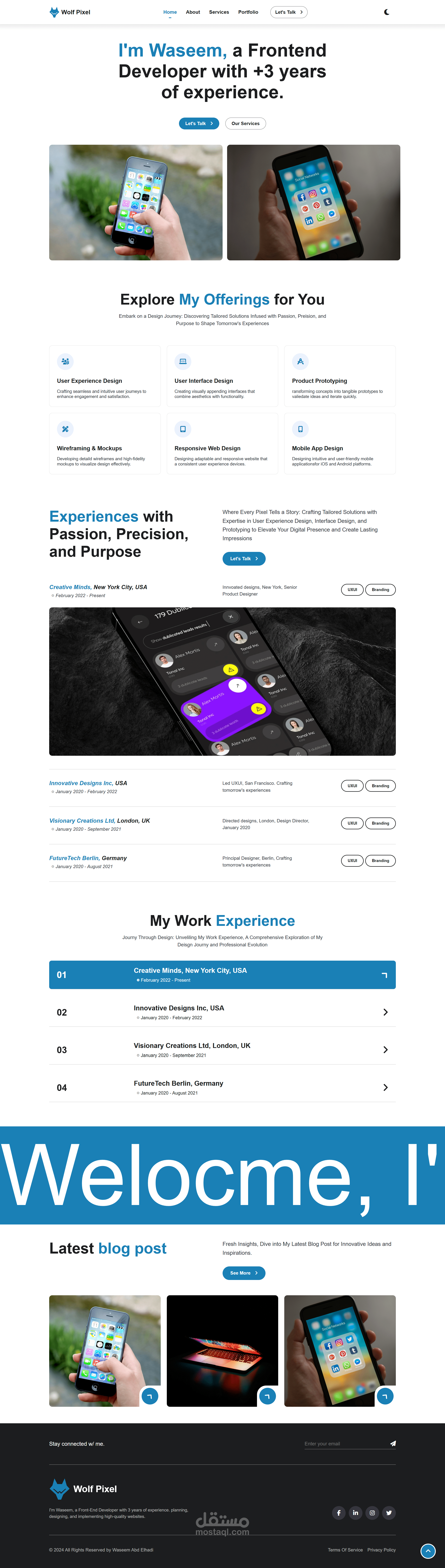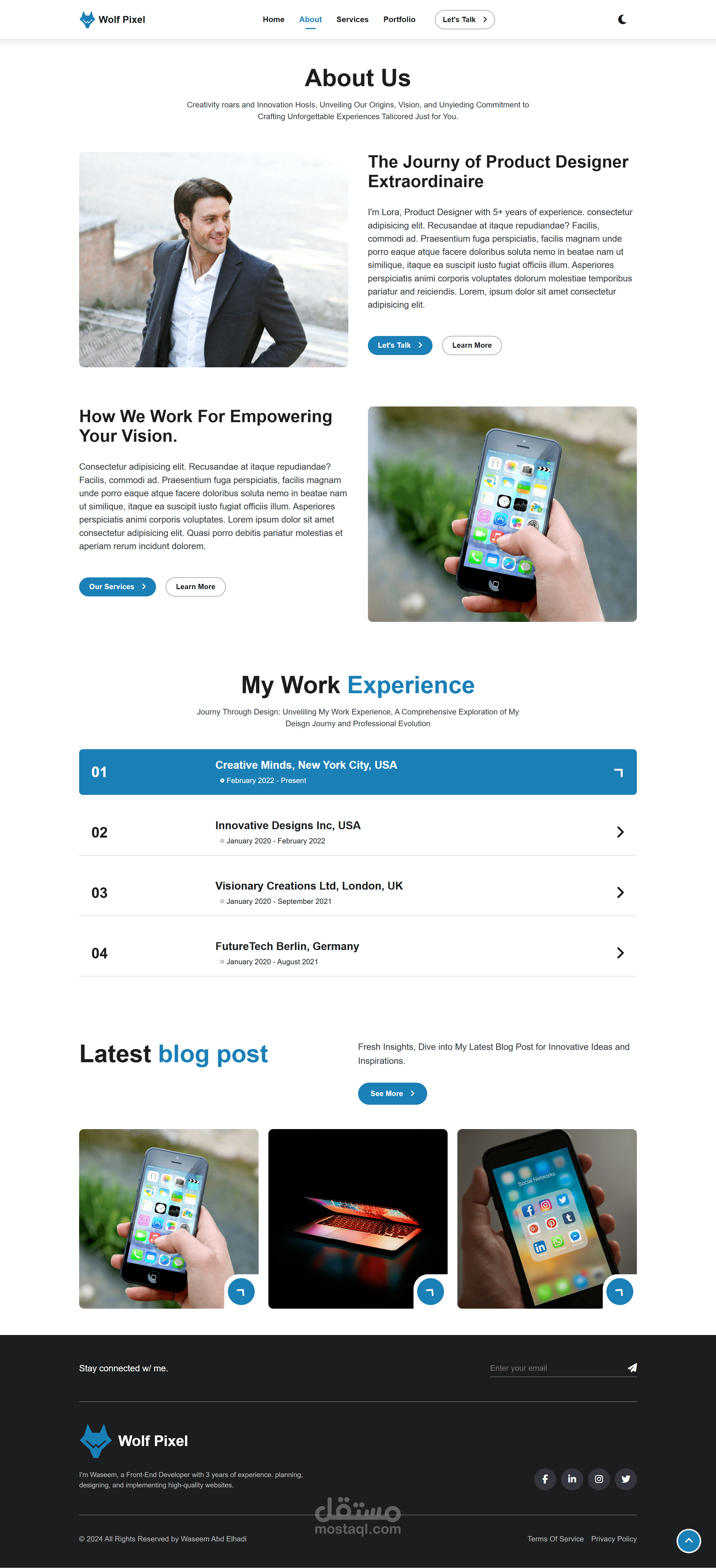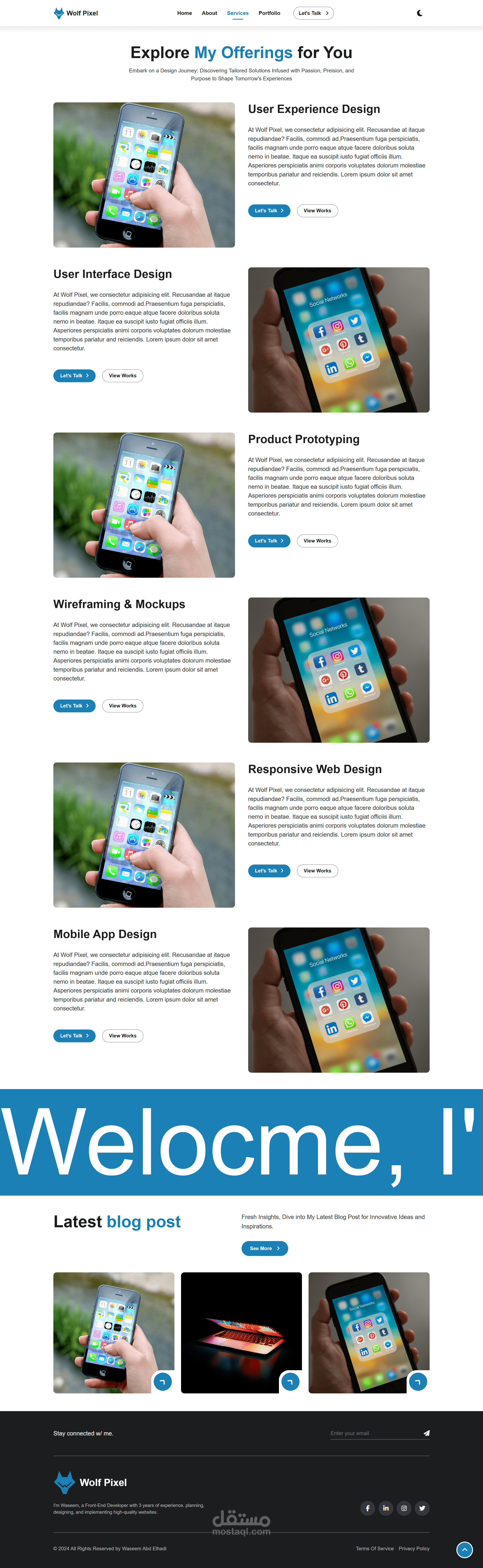 Wolf Pixel هي موقع ويب متعدد الصفحات ومتجاوب مبني باستخدام HTML و CSS و JavaScript. يعرض المشاريع الإبداعية والخدمات والمحتوى المدون بتصميم نظيف ومنظم من أجل تجربة مستخدم سلسة عبر جميع الأجهزة.