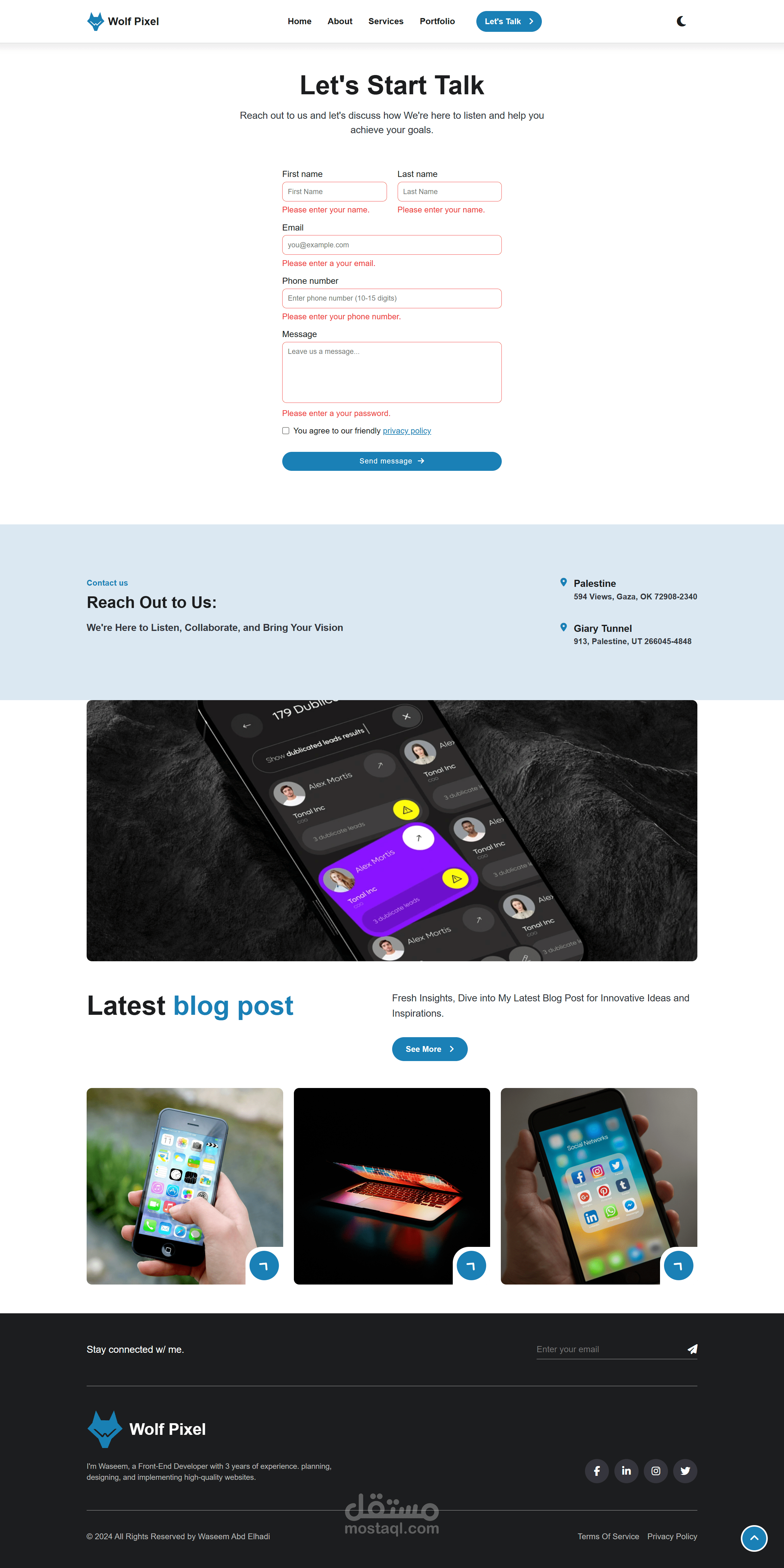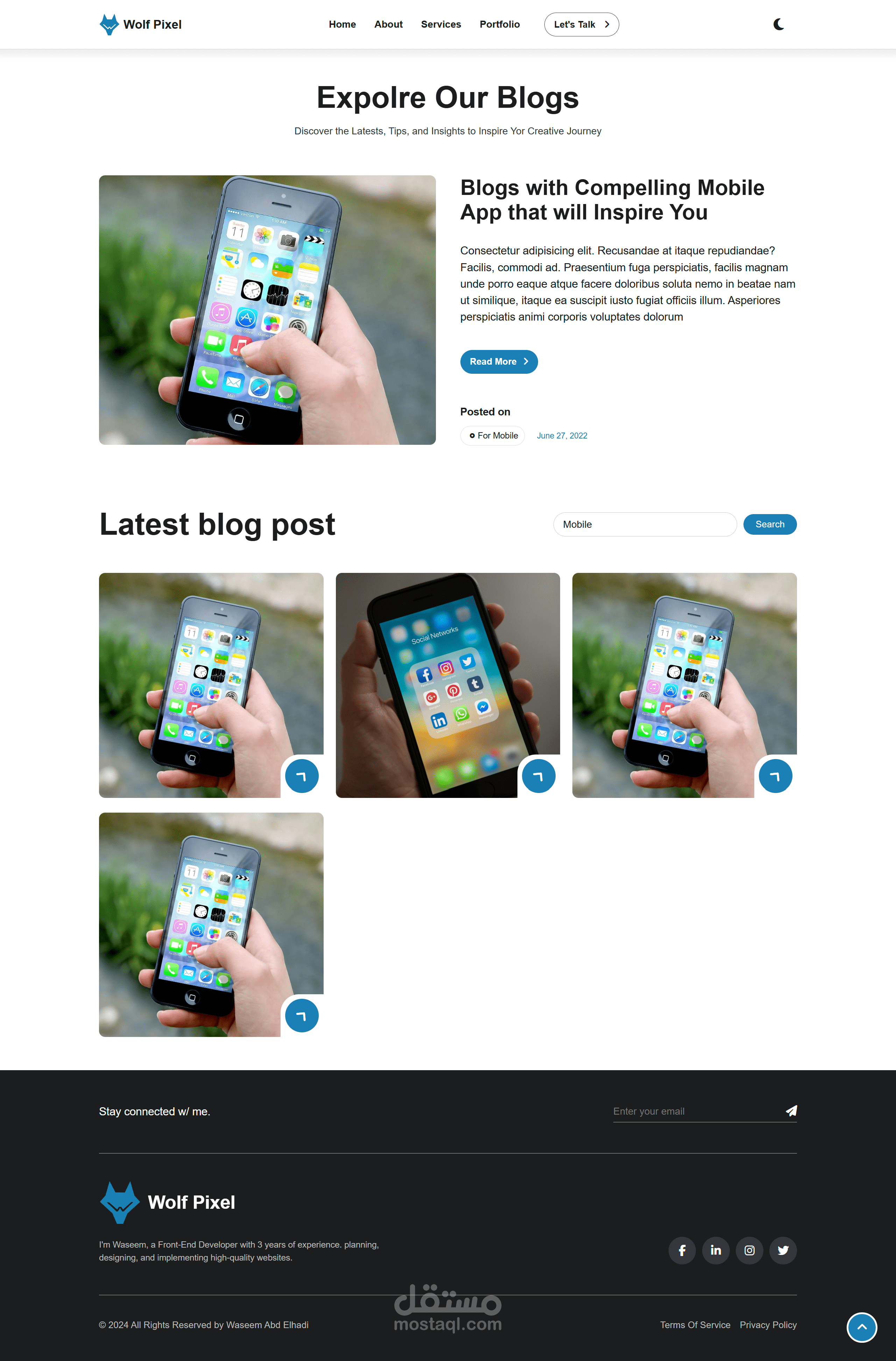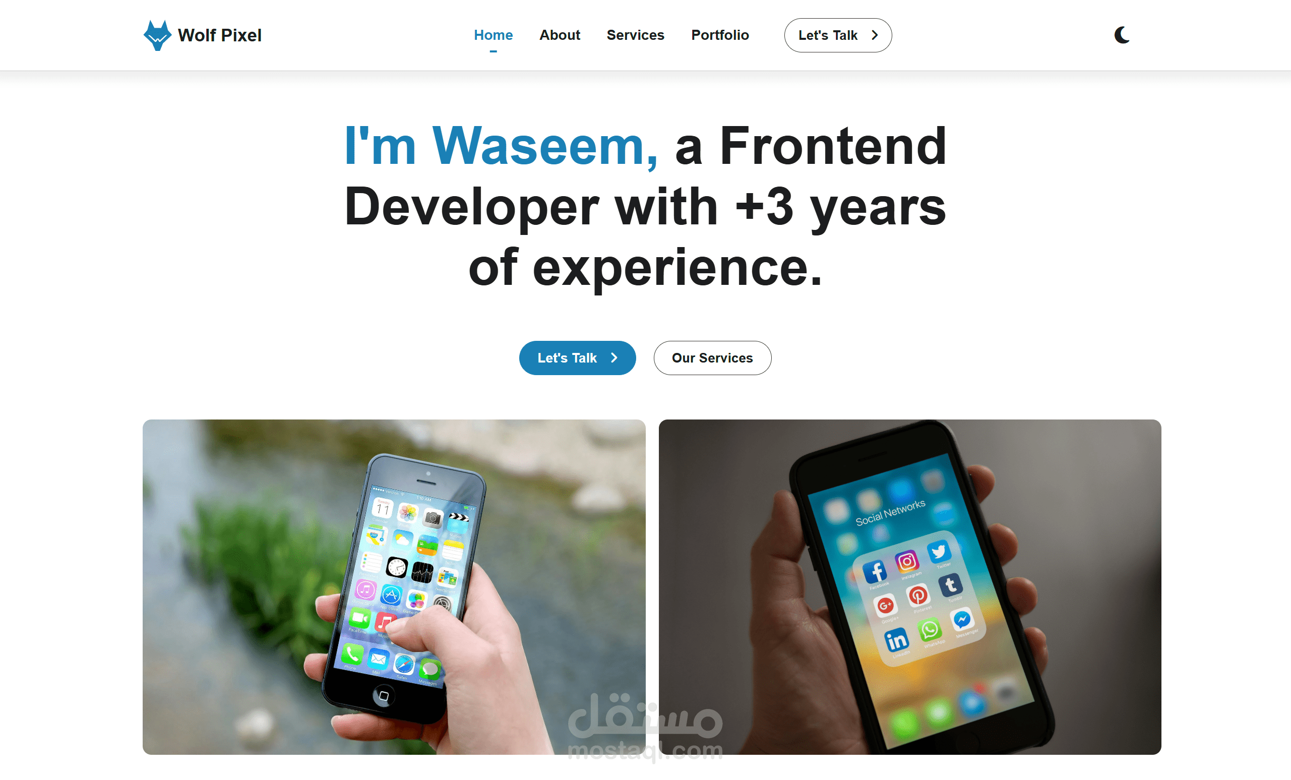 Wolf Pixel هي موقع ويب متعدد الصفحات ومتجاوب مبني باستخدام HTML و CSS و JavaScript. يعرض المشاريع الإبداعية والخدمات والمحتوى المدون بتصميم نظيف ومنظم من أجل تجربة مستخدم سلسة عبر جميع الأجهزة.