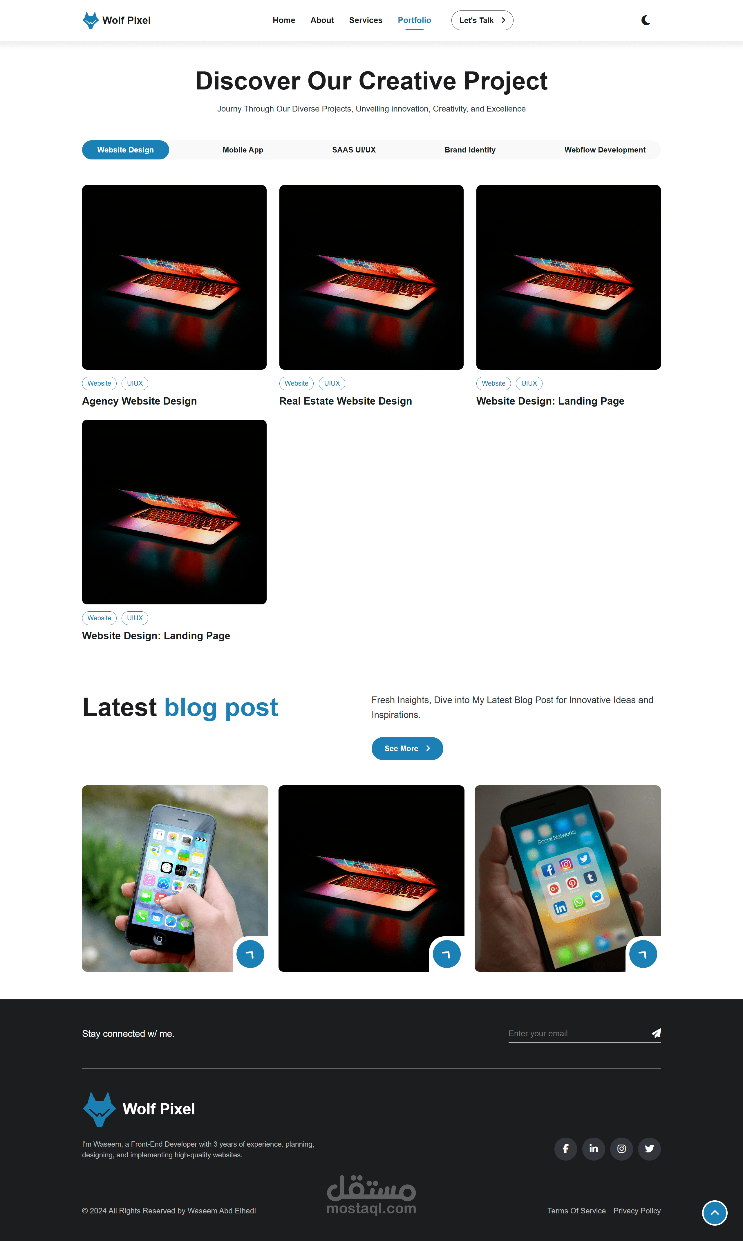 هو موقع ويب عصري وأنيق مصمم لعرض الخدمات، والمشاريع الإبداعية، والمدونات، مع التركيز على تقديم تجربة مستخدم استثنائية وتصميم لافت للنظر مناسب للمبدعين والمطورين.