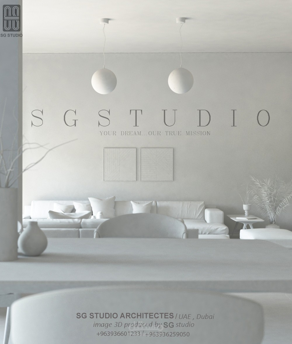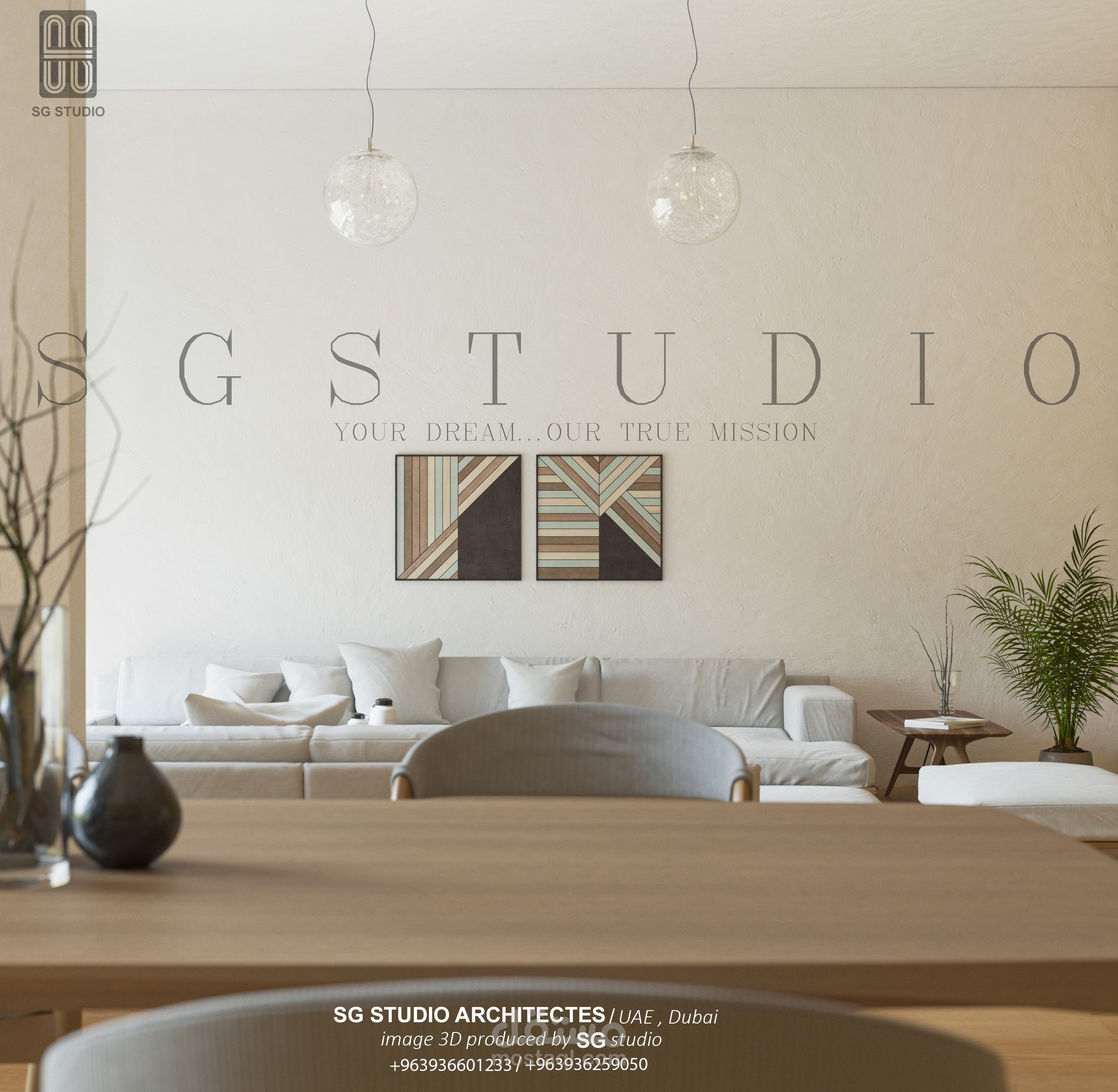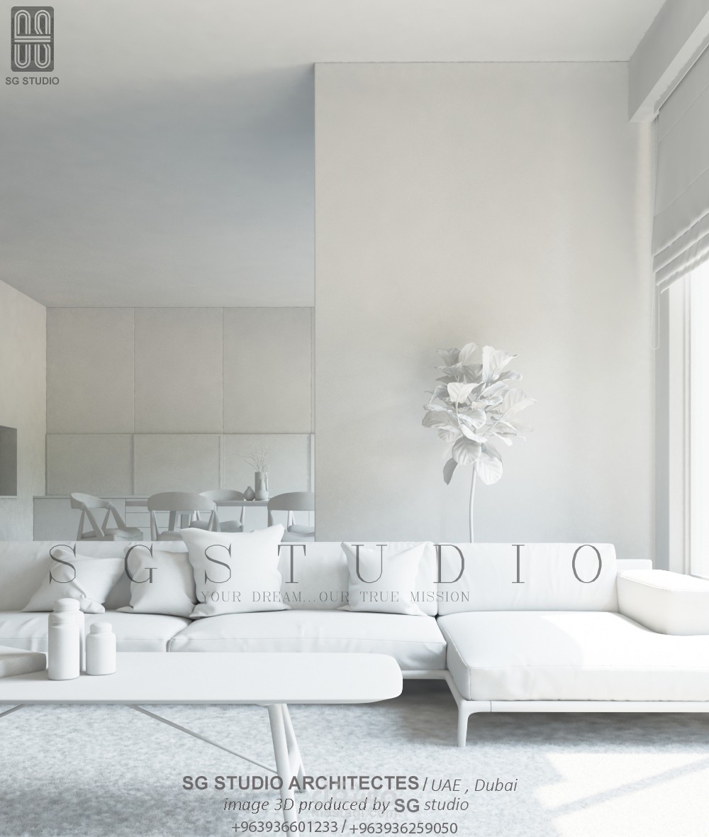 اعتمد هذا التصميم على خلق جو بسيط بين غرفة المعيشة وركن الطعام , واستخدام أثاث بسيط وحديث واثنين من مواد الاكساء البسيطة للجدران