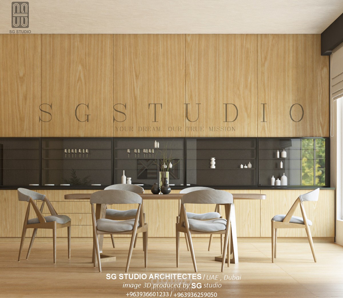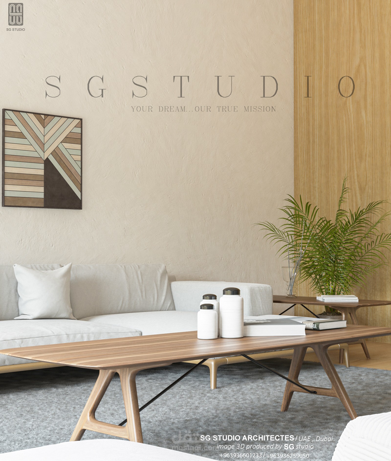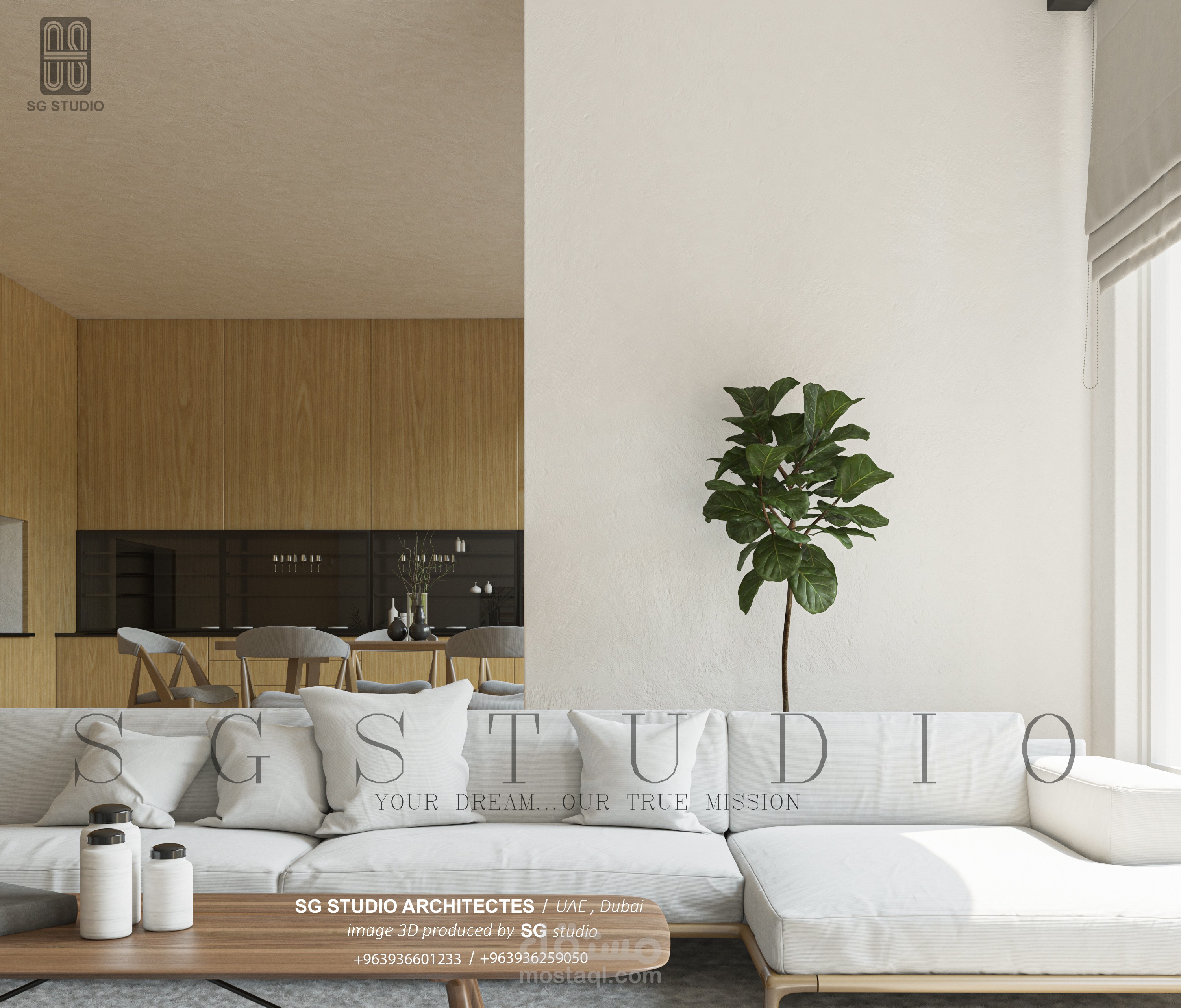 اعتمد هذا التصميم على خلق جو بسيط بين غرفة المعيشة وركن الطعام , واستخدام أثاث بسيط وحديث واثنين من مواد الاكساء البسيطة للجدران