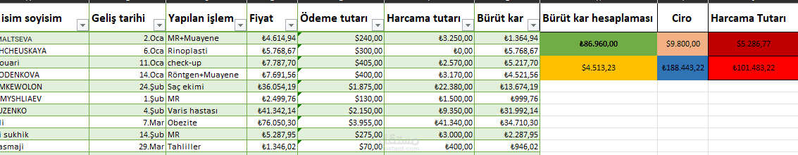لقد صممت جدولًا قصيرًا يحسب إجمالي الربح. تتضمن شركة السياحة الصحية جدولًا يحسب إجمالي الربح لجميع المرضى القادمين ، بالإضافة إلى جدول صرف العملات الأجنبية الذي يُظهر التغييرات الفورية في الليرة التركية والدولار.