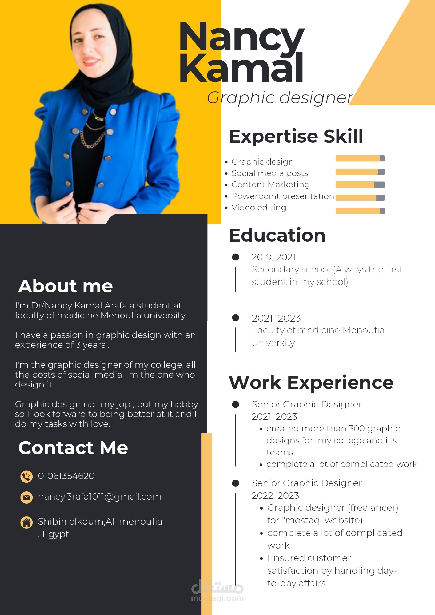 تصميم سيرة ذاتية مع وضع جميع البيانات بصورة واضحة و مرتبة كل على حدى مع إضافة الصورة الشخصية و المهارات ووسائل التواصل بشكل راقى وواضح