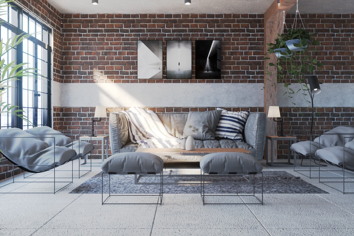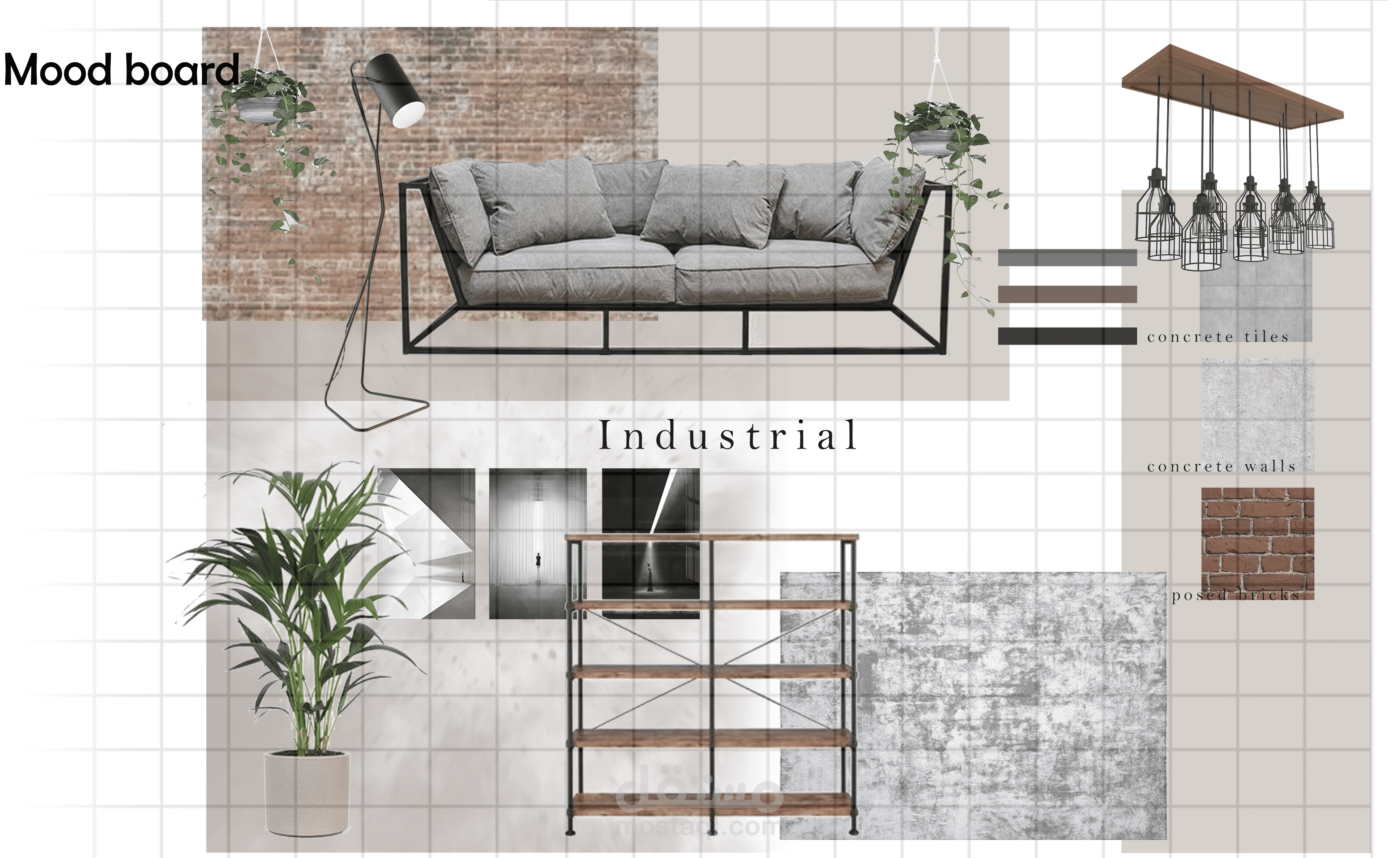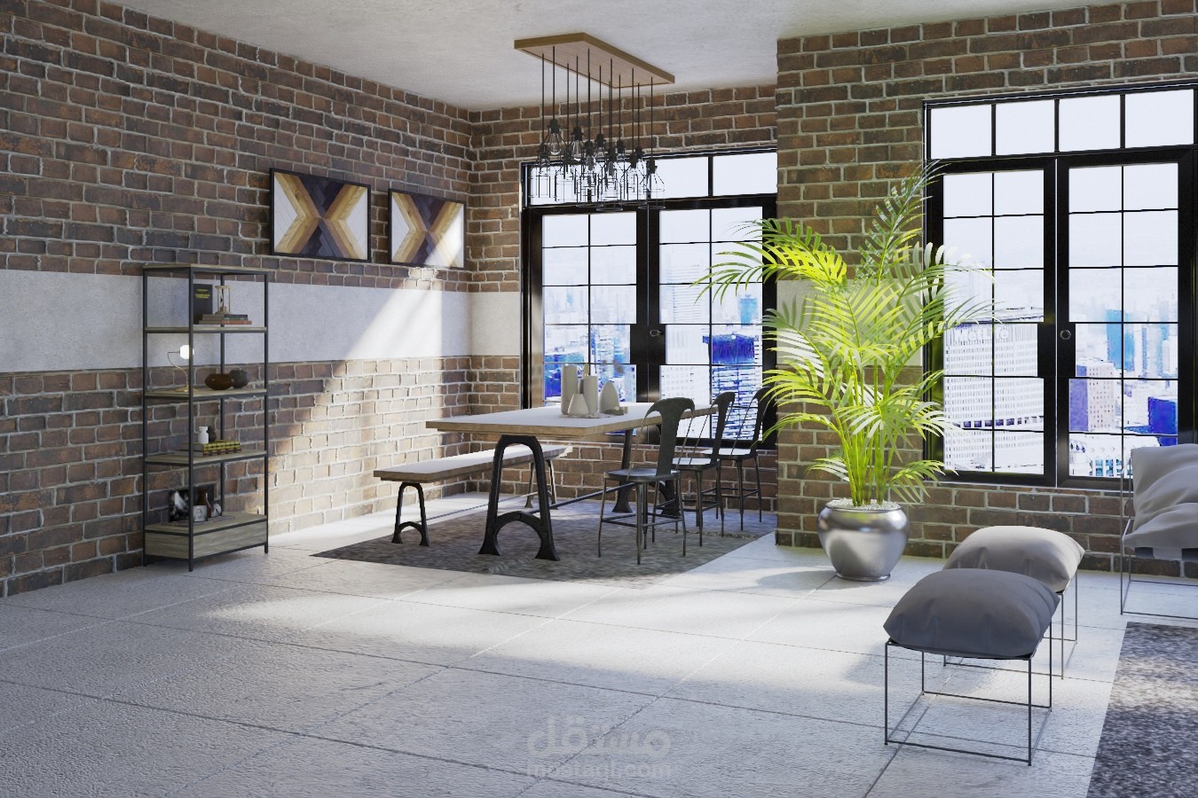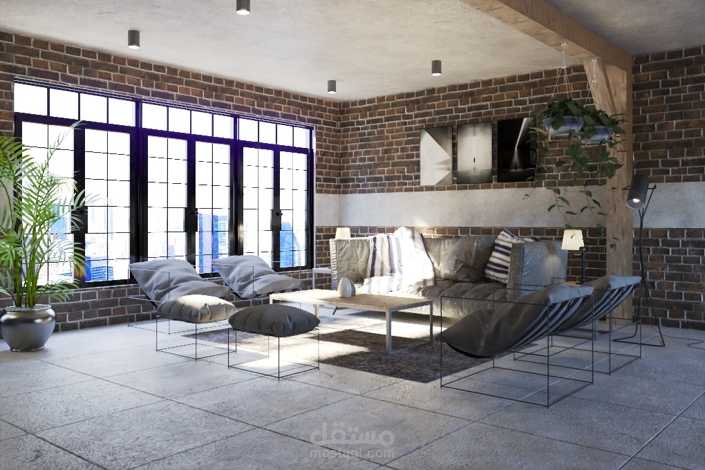 , A graphic designer wished for an industrial style living area with a wide view that would enhance his creativity. The work started by providing a mood board representing the used color, materials, and furniture pieces. then agreeing on the furniture allocation and presenting 3d renders.