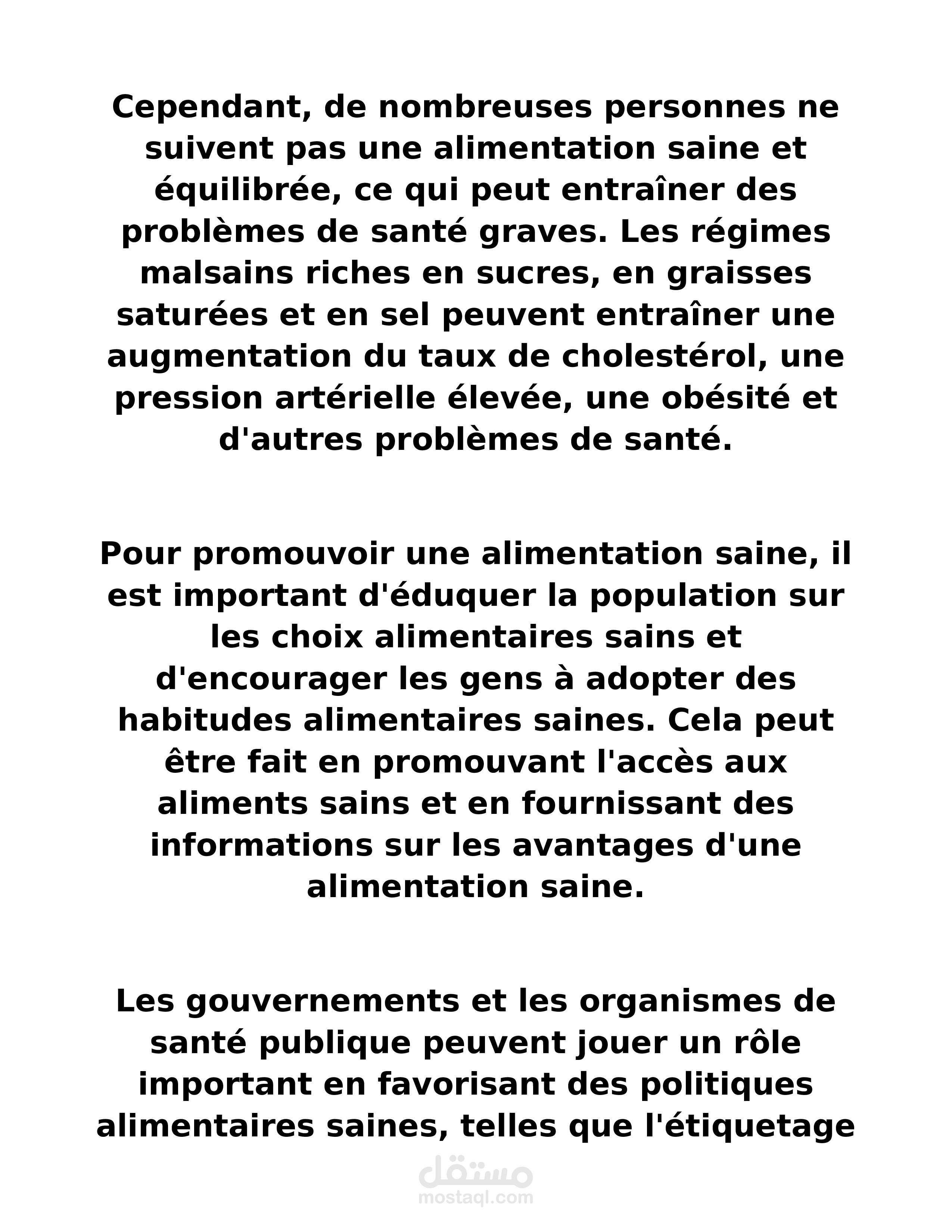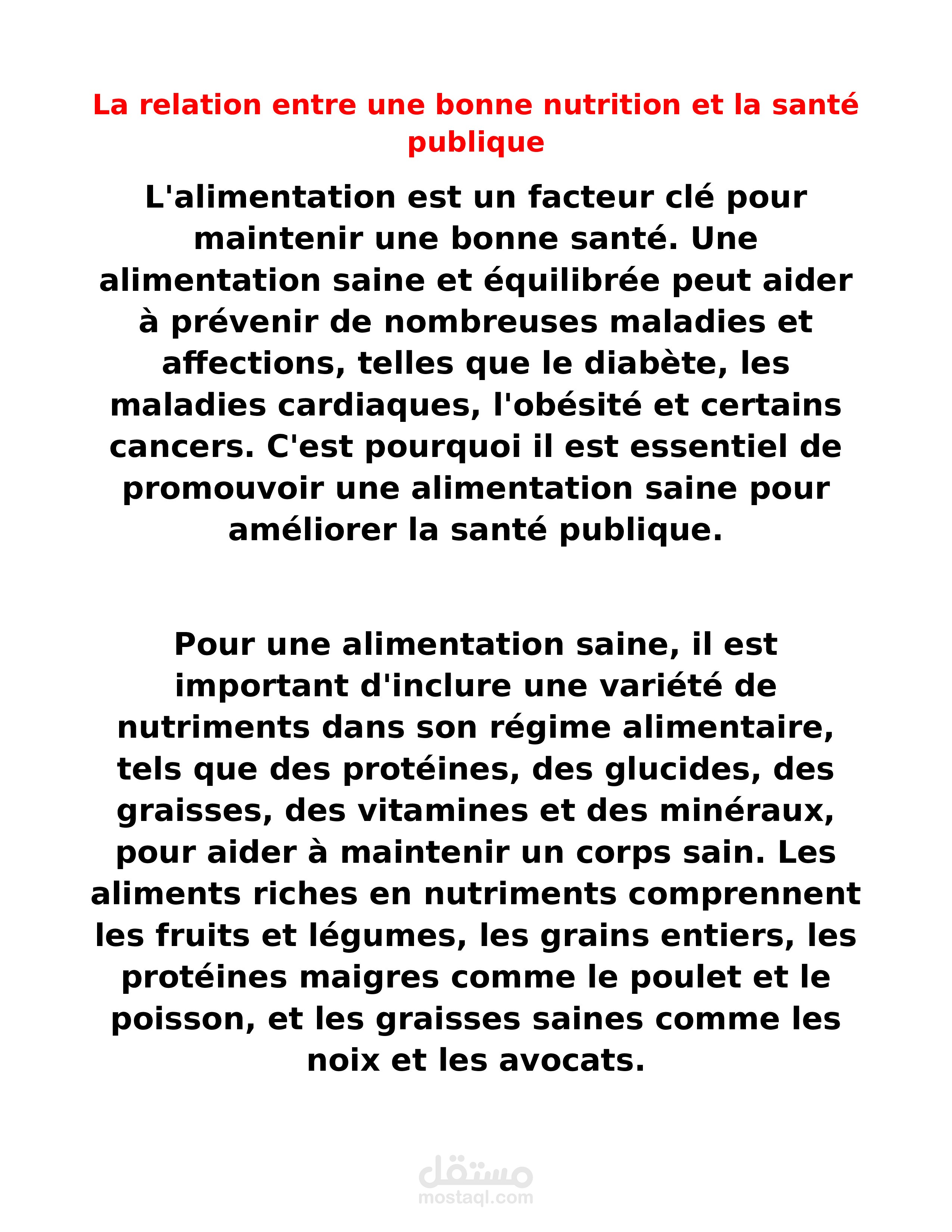 المقاله تتحدث عن العلاقة الوثيقة بين التغذية السليمة والصحة العامة، حيث يشير إلى أن التغذية الصحية والمتوازنة ضرورية للحفاظ على الصحة والوقاية من العديد من الأمراض المزمنة. كما يؤكد المقاله على أهمية العمل على تعزيز الوعي بأهمية التغذية السليمة وتوفير المعلومات والموارد للمساعدة في اتخاذ خيارات غذائية صحية. ويشير المقاله إلى أن التشجيع على التغذية السليمة يمكن أن يساهم في الوقاية من الأمراض وتحسين جودة الحياة للجميع.