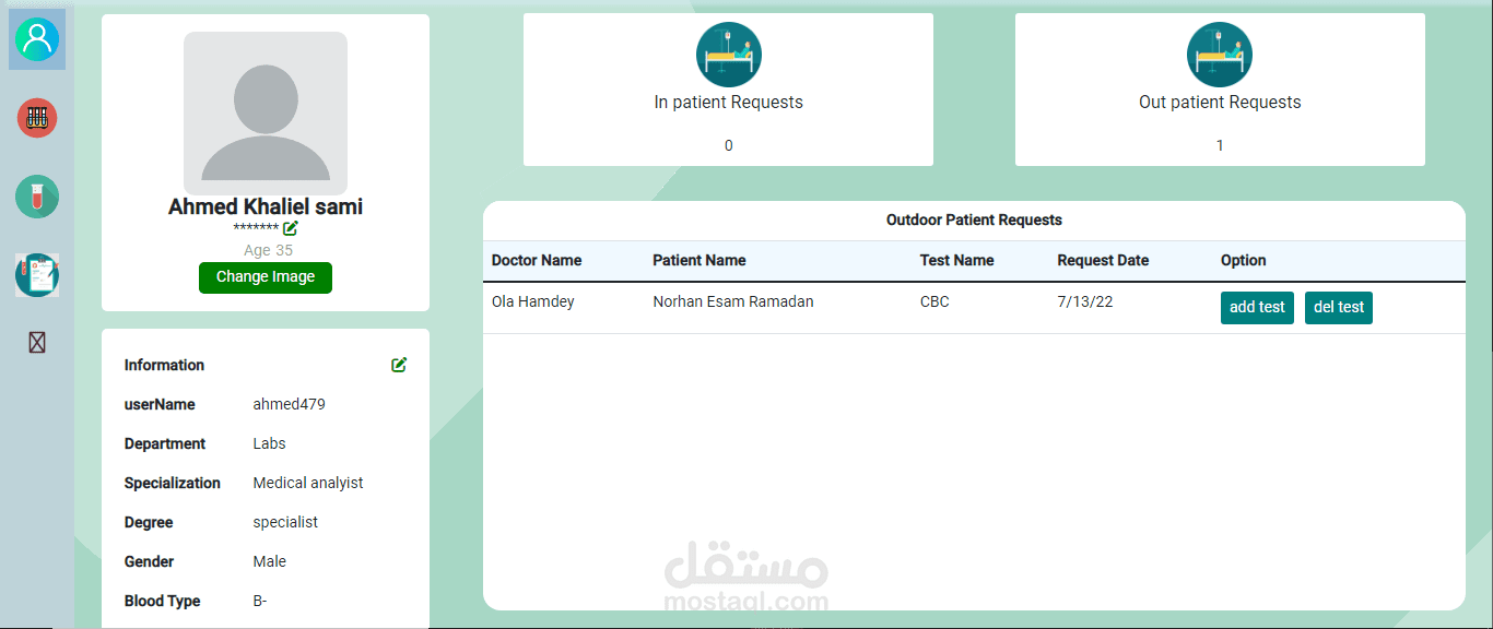 يمكن للطبيب الاشعه و التحاليل تلقي طلبات تحليل او اشعه للمرضي سواء كان مريض داخلي او مريض عياده