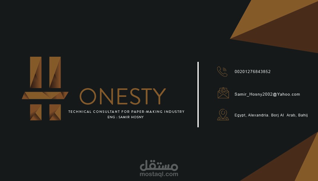 كارت شخصي لشركة اونستي كيميكالز لصناعة الاوراق استخدم فيه الظل و الالوان لتعطي انطباع عمل الشركه في صناعة الاوراق و راحة العين بشكل عملي