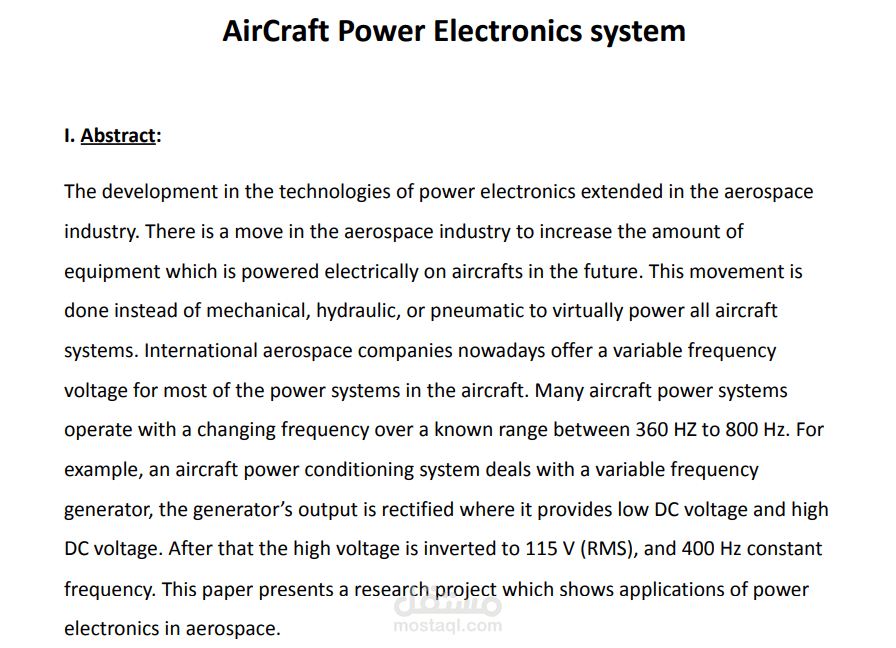 تم كتابة تقرير عن AirCraft Power Electronics System باللغة الانجليزية و تم وضع امثلة توضيحية و عمل مقارنات لتوصيل المعلومة بشكل كاملز
