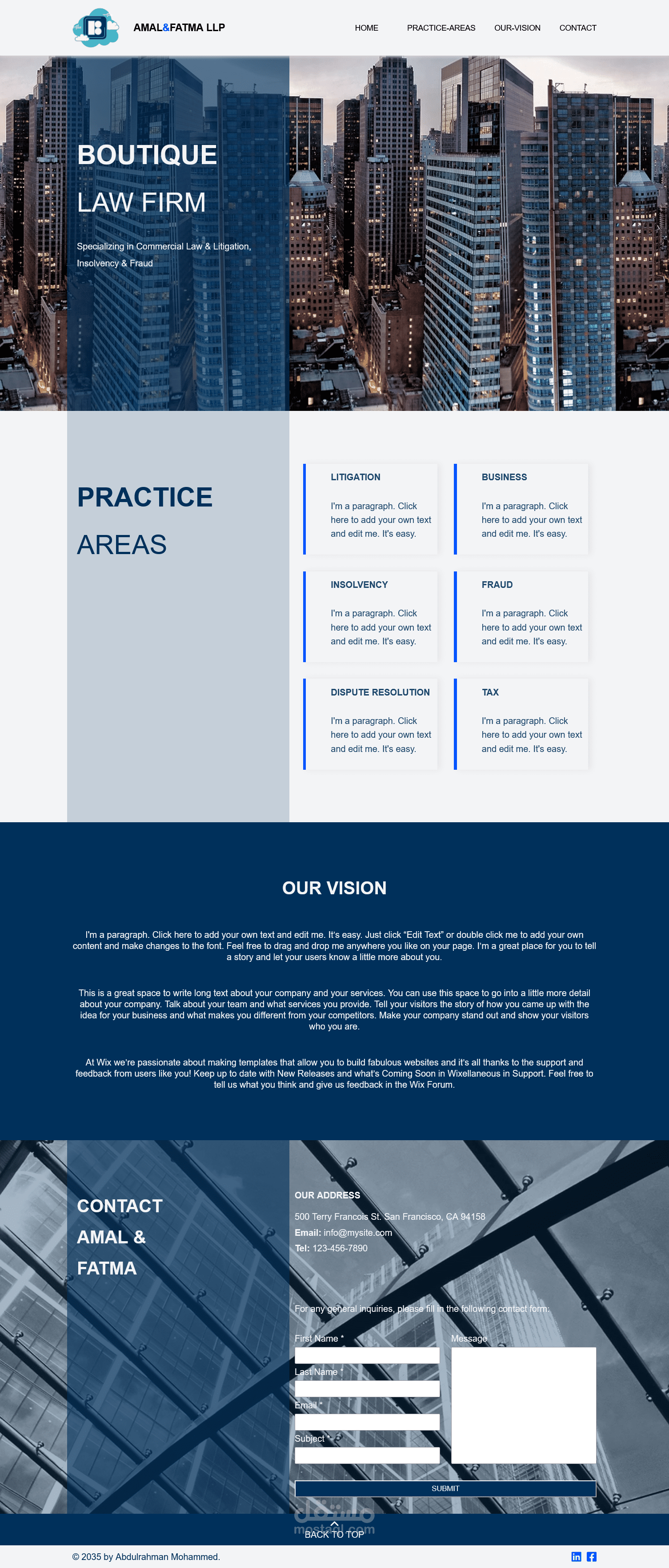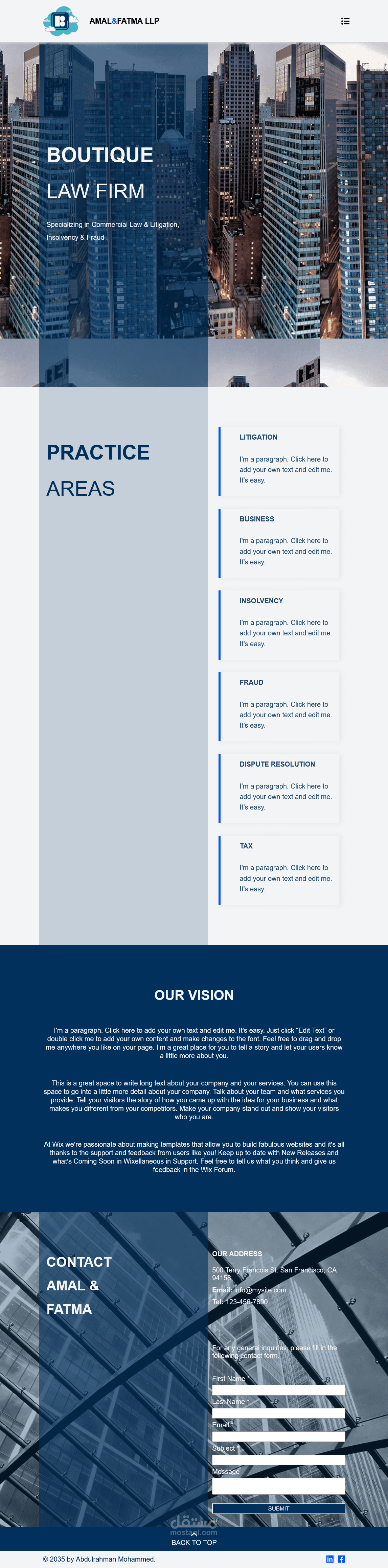 صفحة الويب التي قمت بتصميمها تعرض خدمات شركة محاماة بشكل واضح وبسيط للزوار. تم إنشاء الصفحة باستخدام لغات الويب الحديثة مثل HTML و CSS و JavaScript و React.