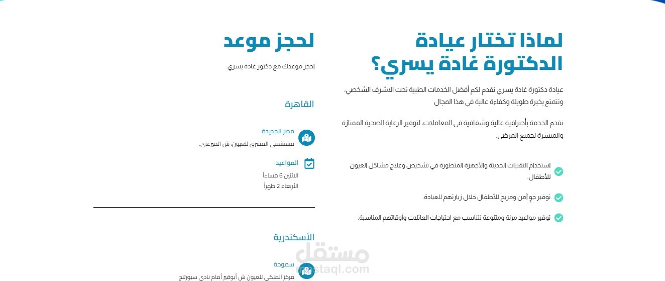 عميلتي دكتورة متخصصة في حول الأطفال كان هدفها عمل ويبسايت اظهار فيه مهاراتها مع خدماتها بالاضافة الى اظهار اراء المرضى الذين اتوا اليها بالاضافة الى صور (قبل وبعد) من العمليات التي قامت بها :