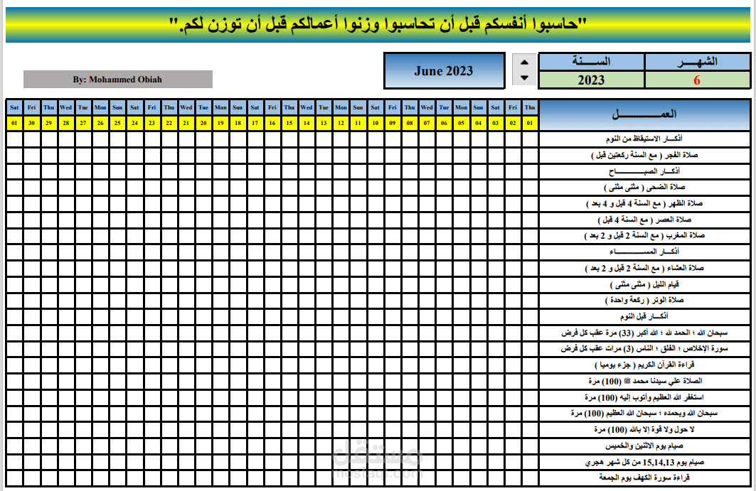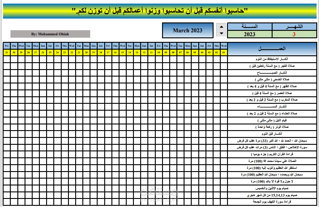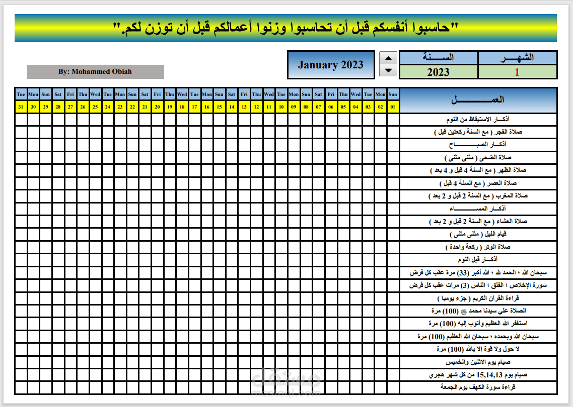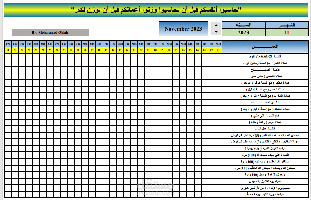 تصميم ورقة عمل لمتابعة العبادات لمدة شهر بإستخدام الإكسل Excel