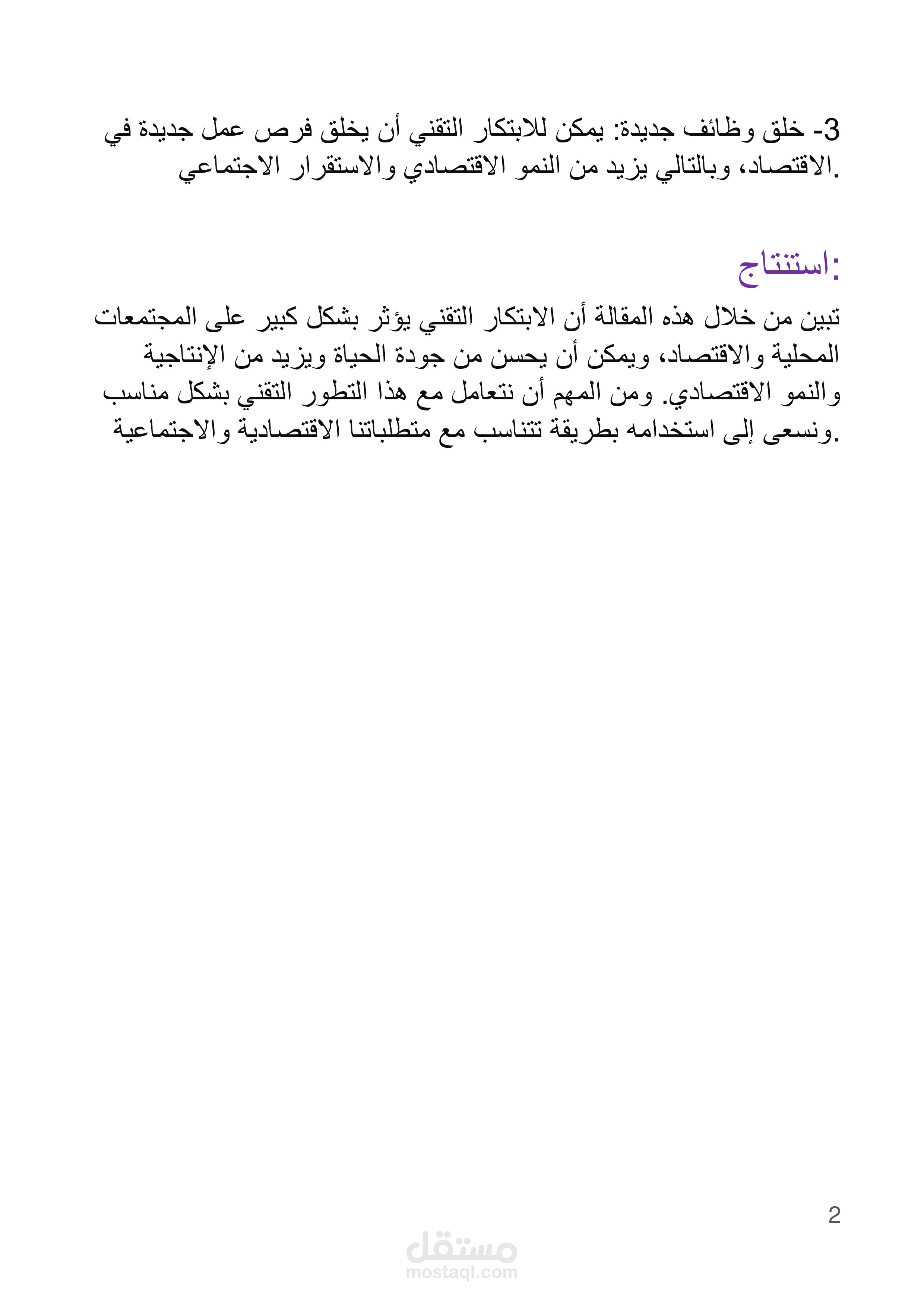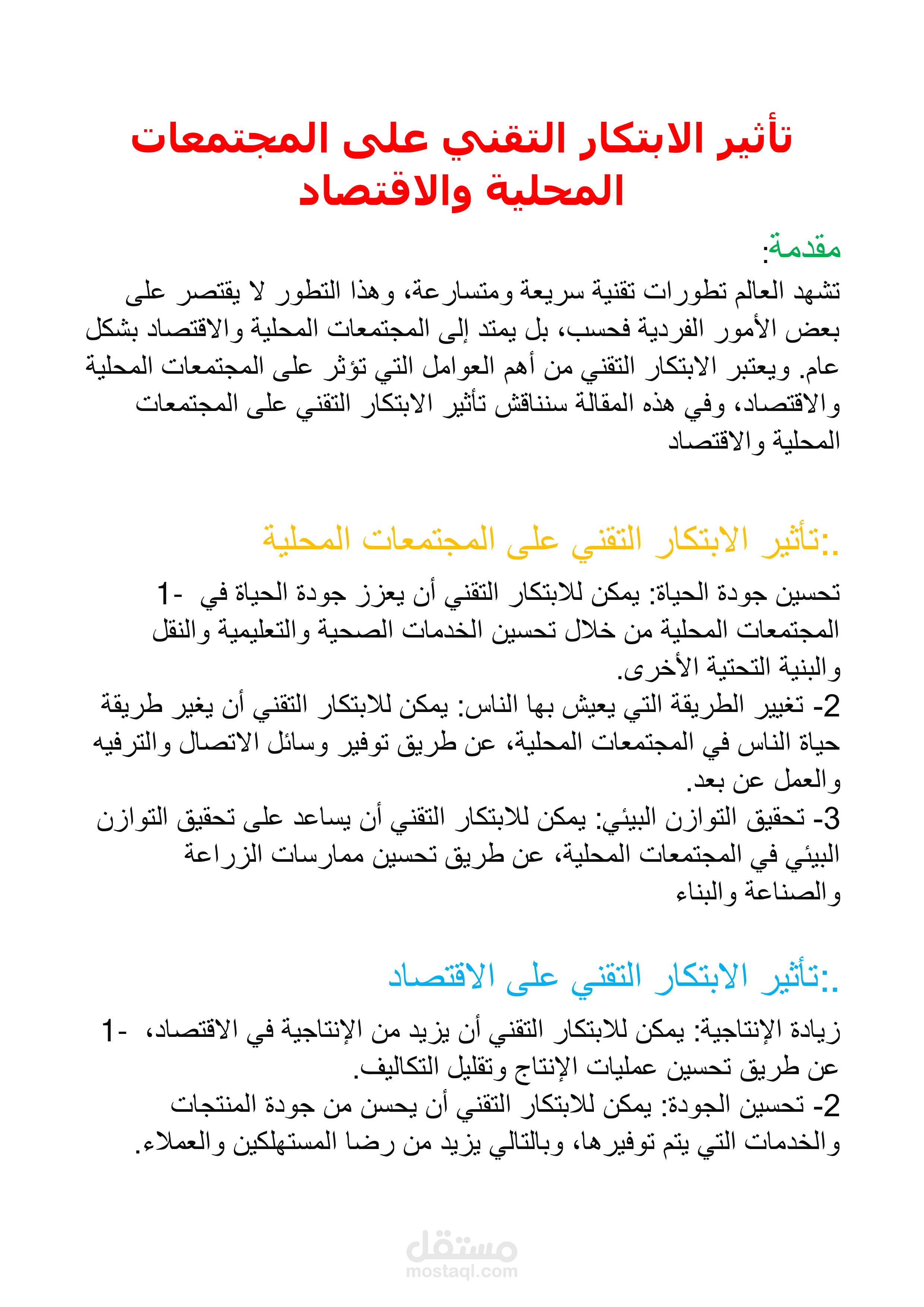 يعد التطور التقني والابتكار في العصر الحالي من أهم العوامل التي تؤثر على المجتمعات المحلية والاقتصاد. فالابتكار التقني يساعد على تحسين الإنتاجية والكفاءة في الصناعات، وبالتالي يساهم في زيادة الإنتاج وتحسين الوضع الاقتصادي، كما يمكن أن يؤدي إلى إنشاء فرص عمل جديدة وتعزيز النمو الاقتصادي. كما يمكن للابتكار التقني أن يساعد في تحسين الخدمات الصحية والتعليمية والتنموية والتكنولوجية، ويمكن أن يتيح للمجتمعات الفرصة للتواصل والتفاعل بشكل أفضل مع العالم الخارجي وتعزيز العلاقات بين المجتمعات المختلفة. وبشكل عام، يمكن القول إن التطور التقني يعد عاملاً حاسماً في تحسين مستوى حياة المجتمعات المحلية وتعزيز النمو الاقتصادي والتنمية المستدامة.