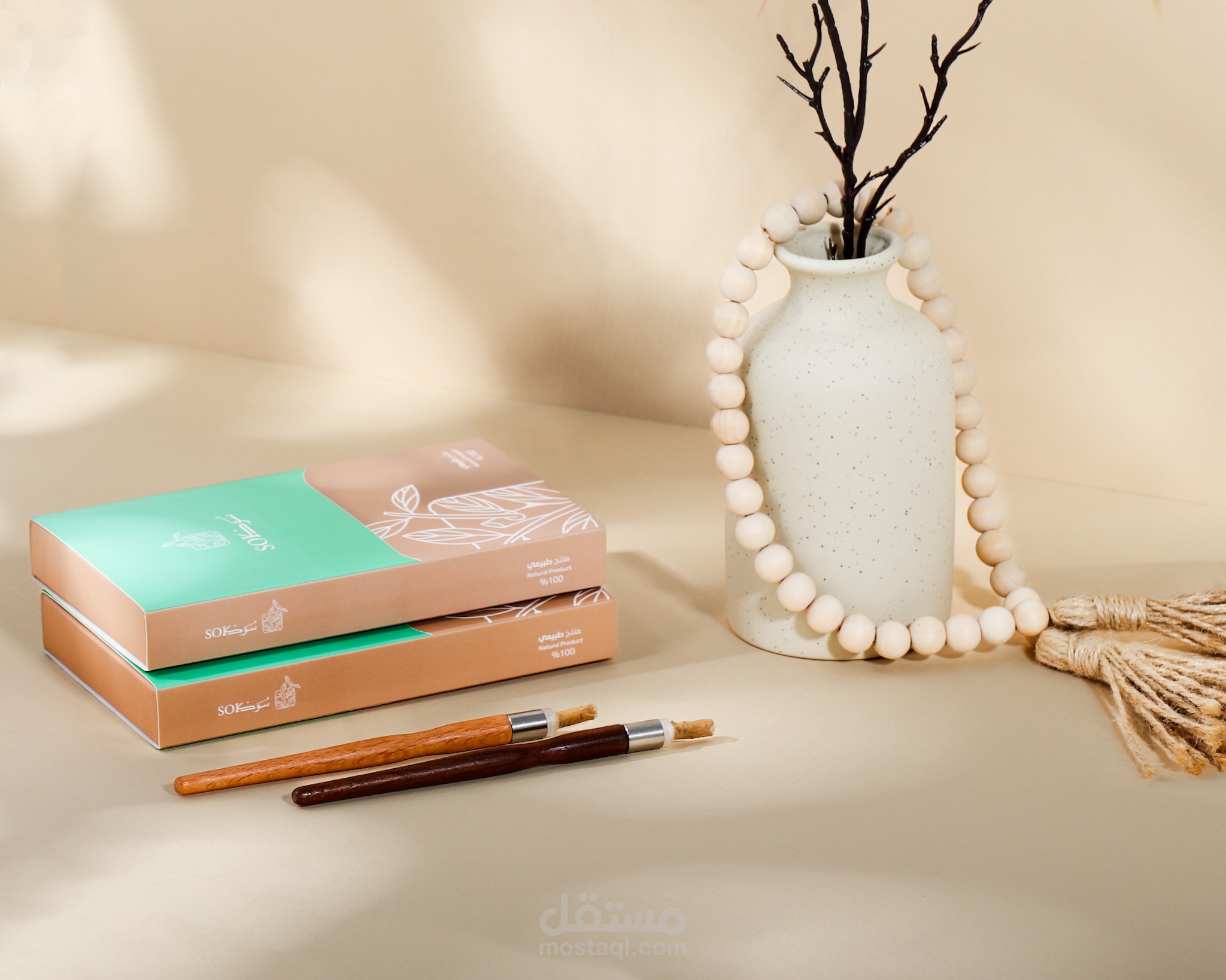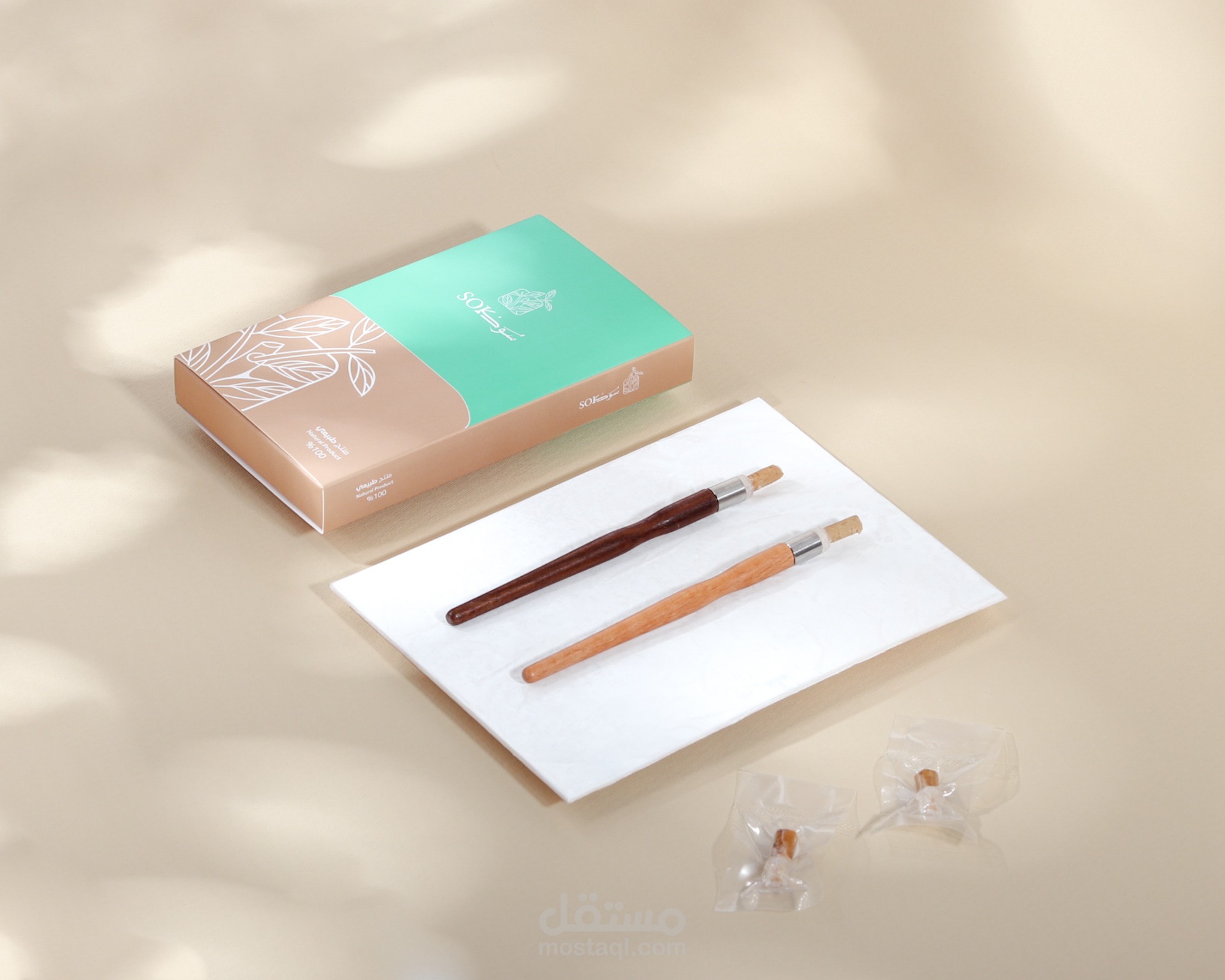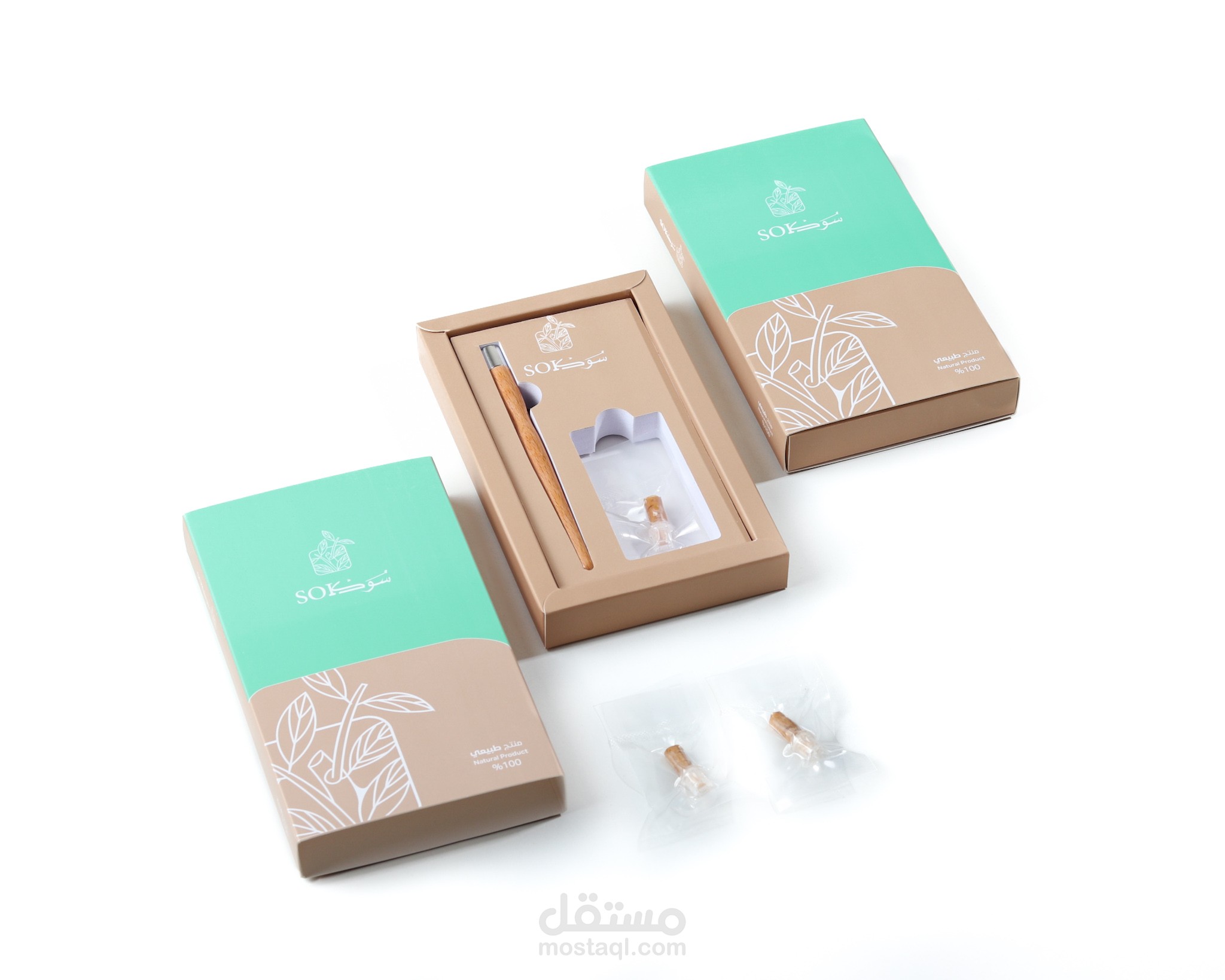 الأيقونة ، تبسيط رسم المنتج ودمجة بأوراق وغصن الأراك كونها محور الهوية " الطبيعة "