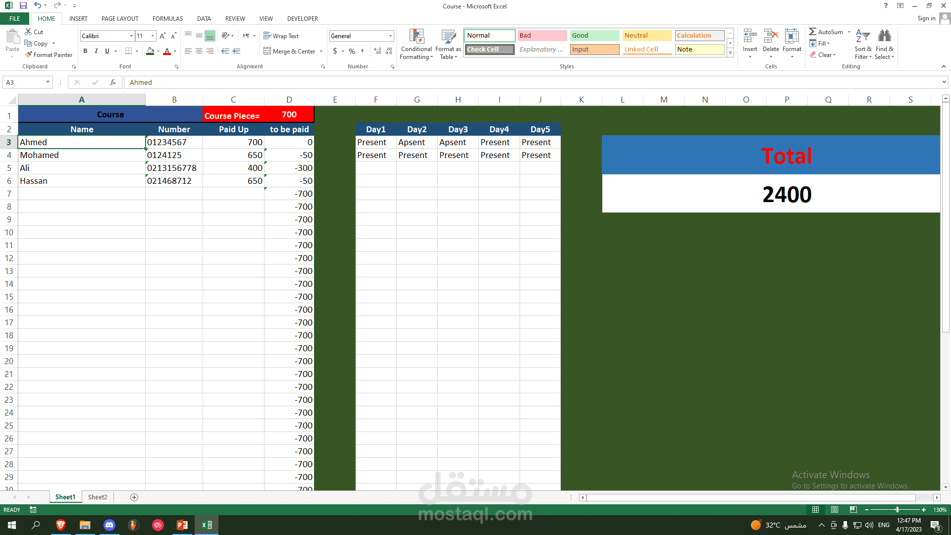 ان يتم وضع سعر الشهر لاشتراك الكورس ويتم تعبئة بيانات الطالب وادخال السعر الذي تم دفعه واذا كان عليه فلوس متبقية تظهر عليه او فلوس زائدة وايضان يمكنك تحديد في كام مرة غاب وحضر و يمكنك معرفة اجمالي الربح وايضا يوجد Search Bar لسهولة الوصول الى الطالب ومعفة تفاصيل عنه