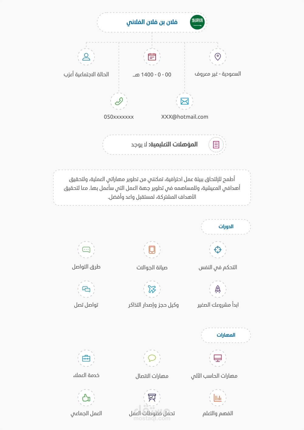 تصميم سيرة ذاتية بأسلوب تصميم الرسوم المعلوماتية (إنفوجرافيك)، بشكل بسيط وواضح وجميل.