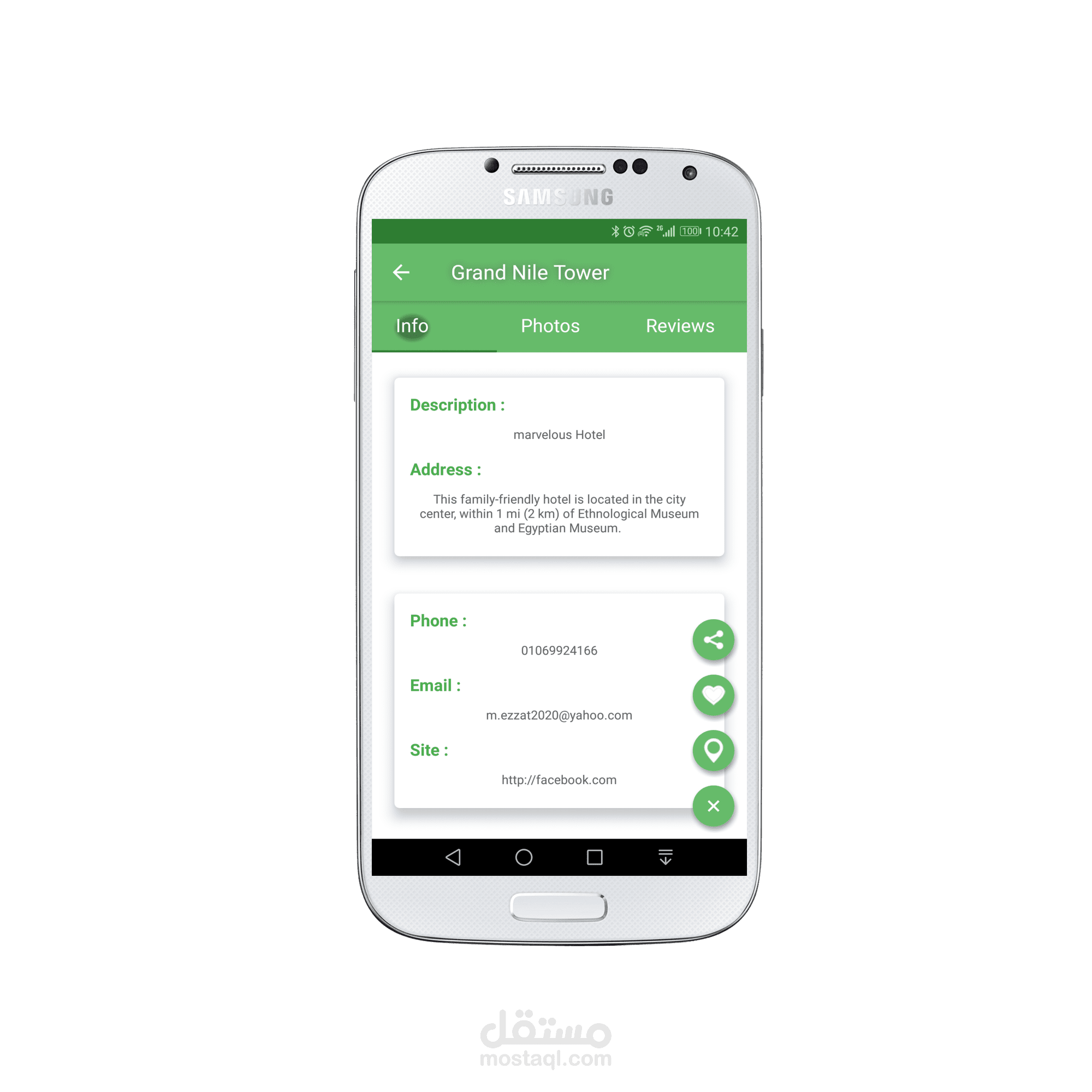 ايضا يمكنك معرفة كل التفاصيل عن الموقع الذي تريد من هاتف ووصف دقيق وعنوان وكذلك الاطلاع علي صور الموقع ومعرفه تقييمات الاخرين له وتعليقاتهم .