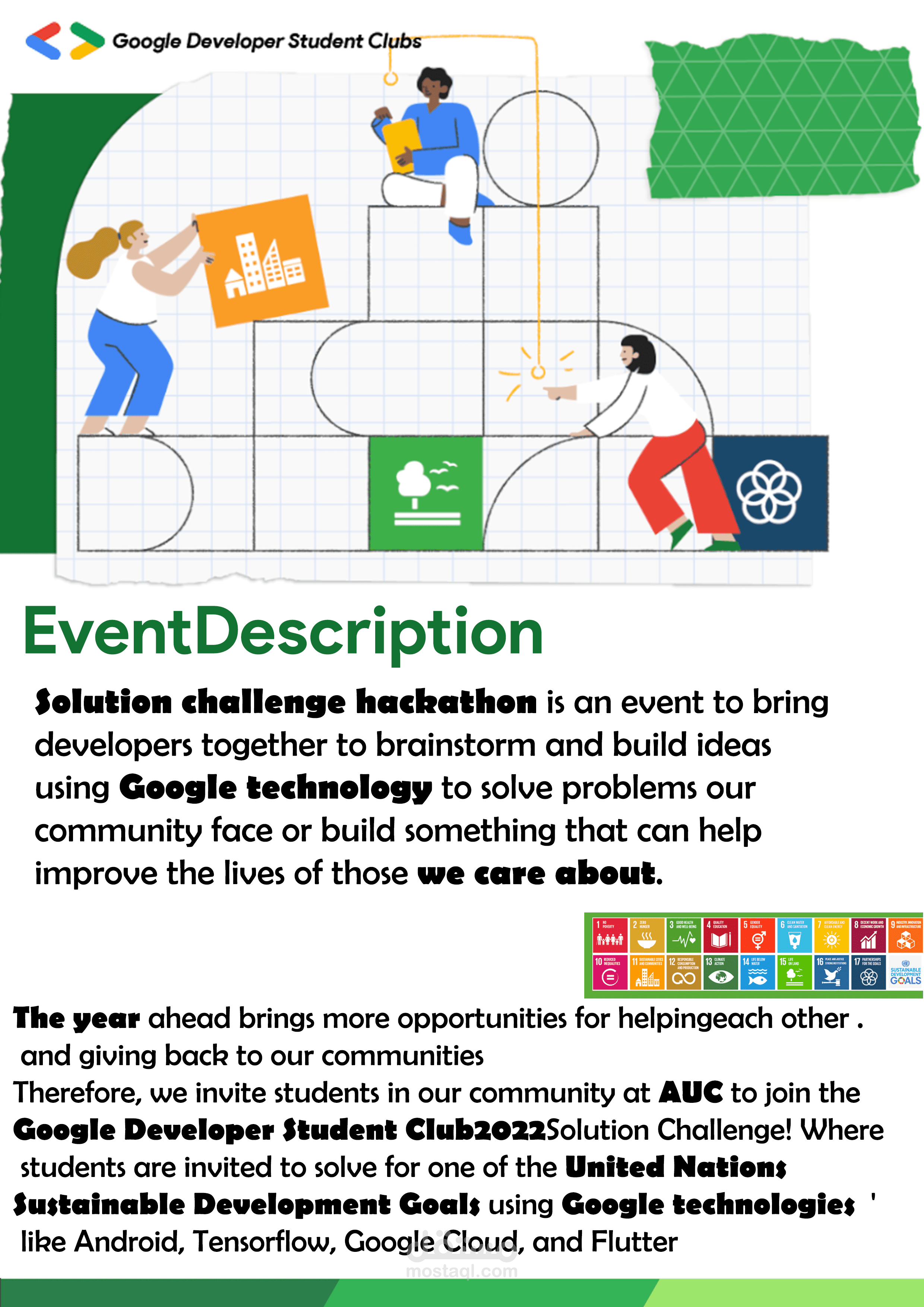 التصميم الجرافيكي هو ممارسة إنشاء محتوى مرئي ينقل رسالة أو فكرة إلى جمهور محدد. إنه شكل من أشكال الاتصال المرئي يجمع بين الفن والطباعة والتخطيط لنقل المعلومات بطريقة مقنعة بصريًا. طلب مني احد اعضاء Google Developer Student Clubs انشاء pdf لمحتوى تعليمي لأيفينت تم عرضه يوم 22-2-2023