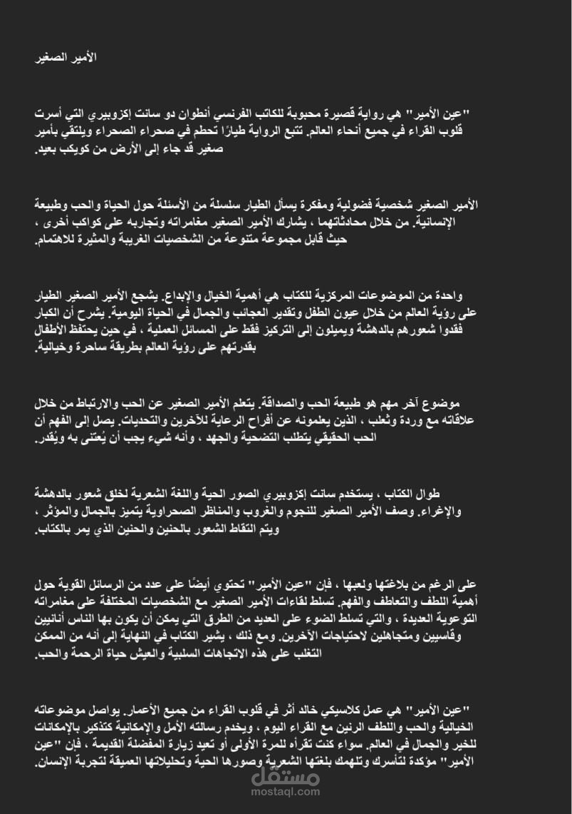 "عين الأمير" هي رواية قصيرة محبوبة للكاتب الفرنسي أنطوان دو سانت إكزوبيري التي أسرت قلوب القراء في جميع أنحاء العالم. تتبع الرواية طيارًا تحطم في صحراء الصحراء ويلتقي بأمير صغير قد جاء إلى الأرض من كويكب بعيد.