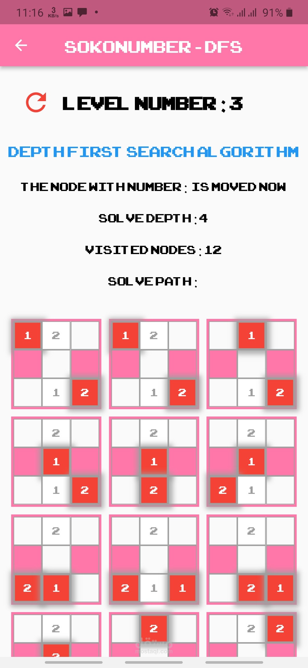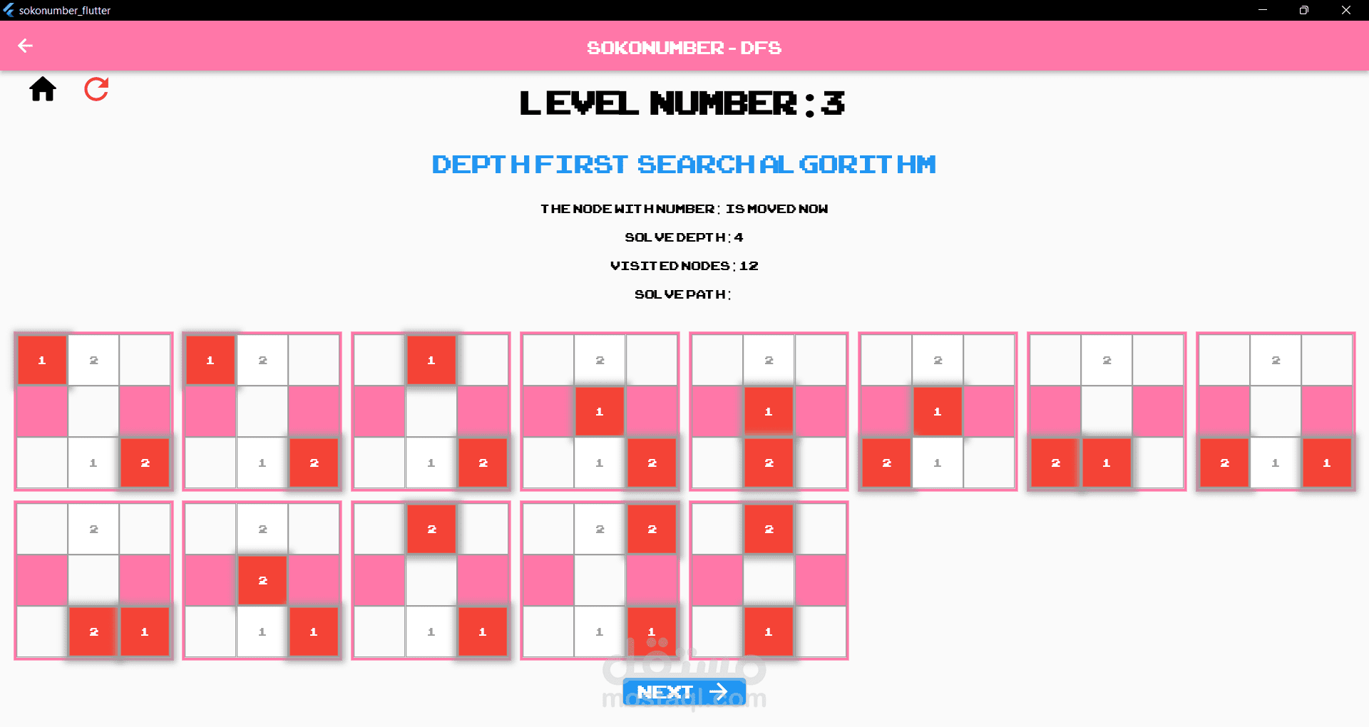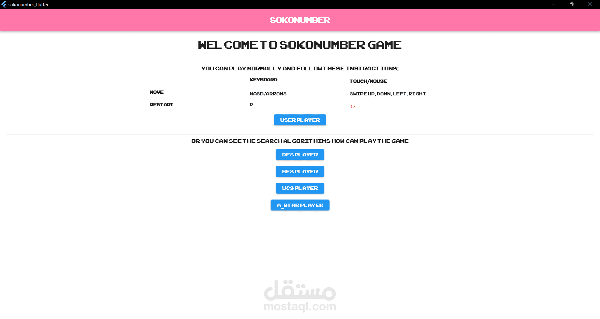 تطبيق flutter حول لعبة Sokonumber يسمح للمستخدم باللعب بشكل طبيعي أو اللعب ومشاهدته كخوارزمية بحث والتي يمكن أن تكون إحدى الخوارزميات التالية: