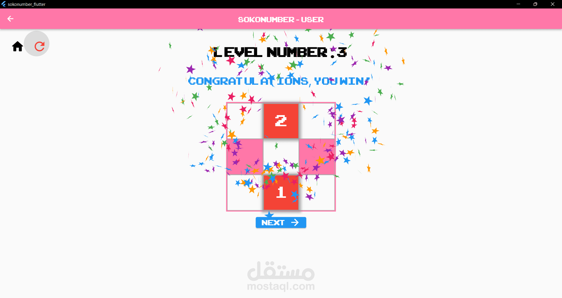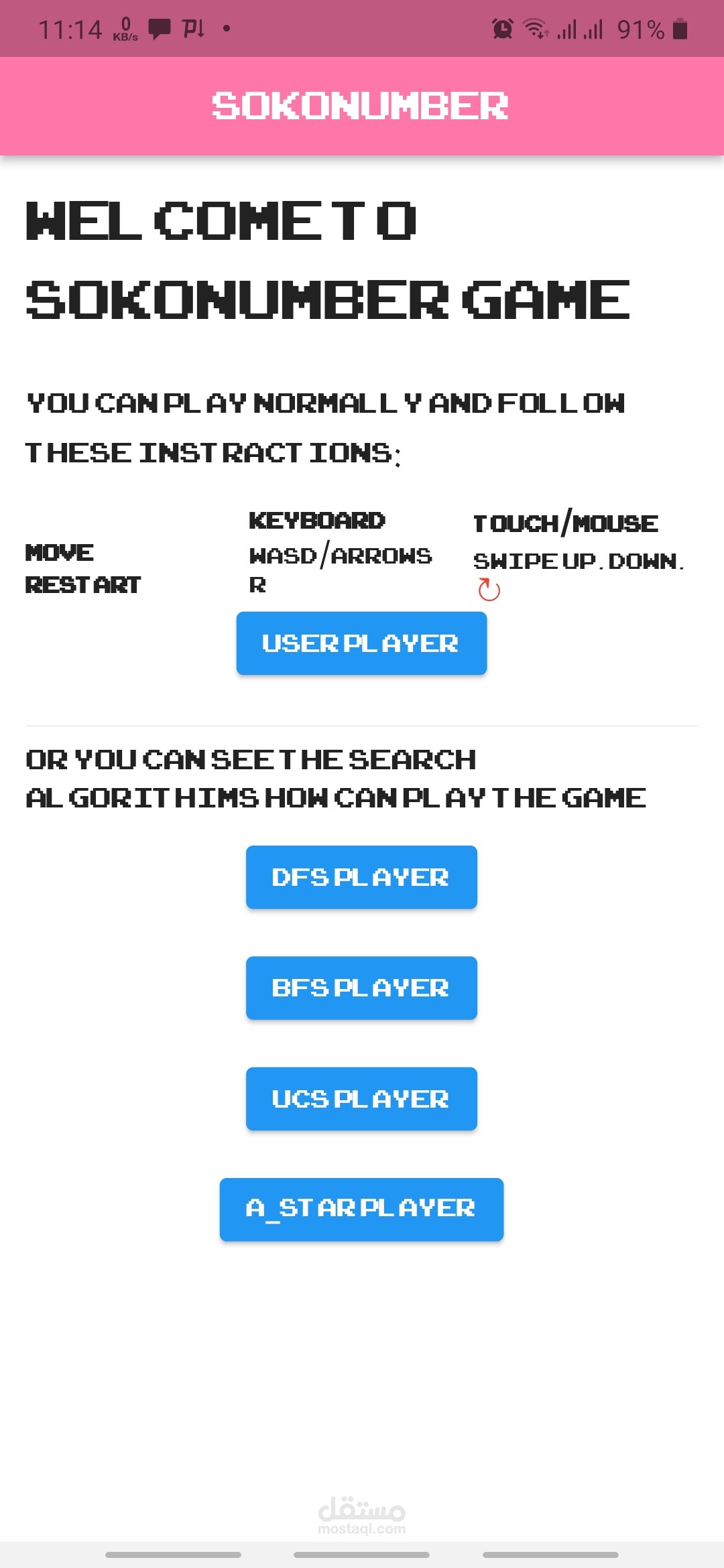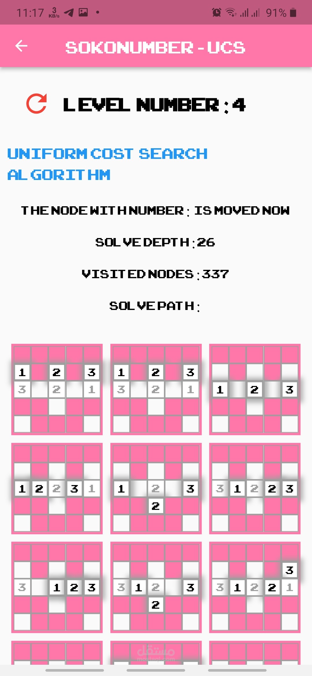 تطبيق flutter حول لعبة Sokonumber يسمح للمستخدم باللعب بشكل طبيعي أو اللعب ومشاهدته كخوارزمية بحث والتي يمكن أن تكون إحدى الخوارزميات التالية: