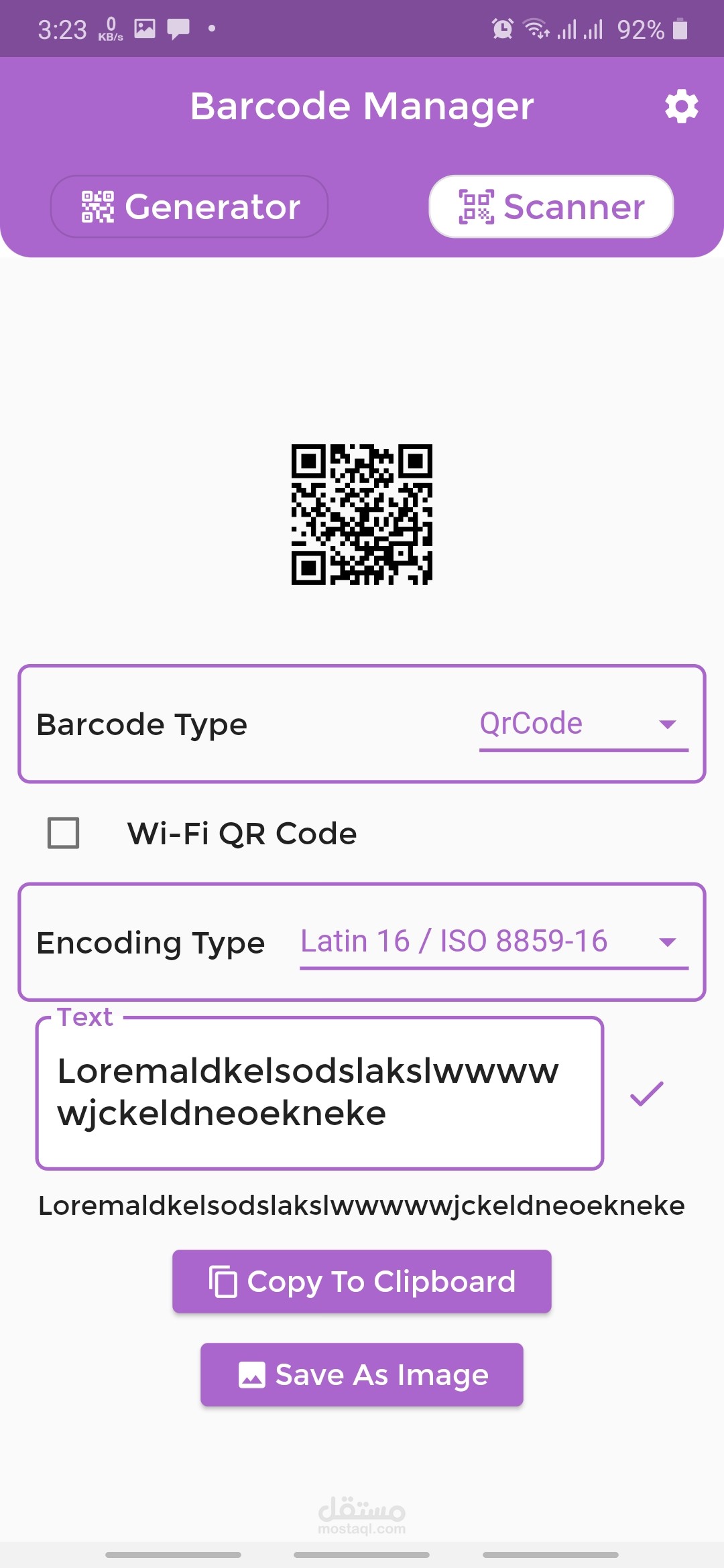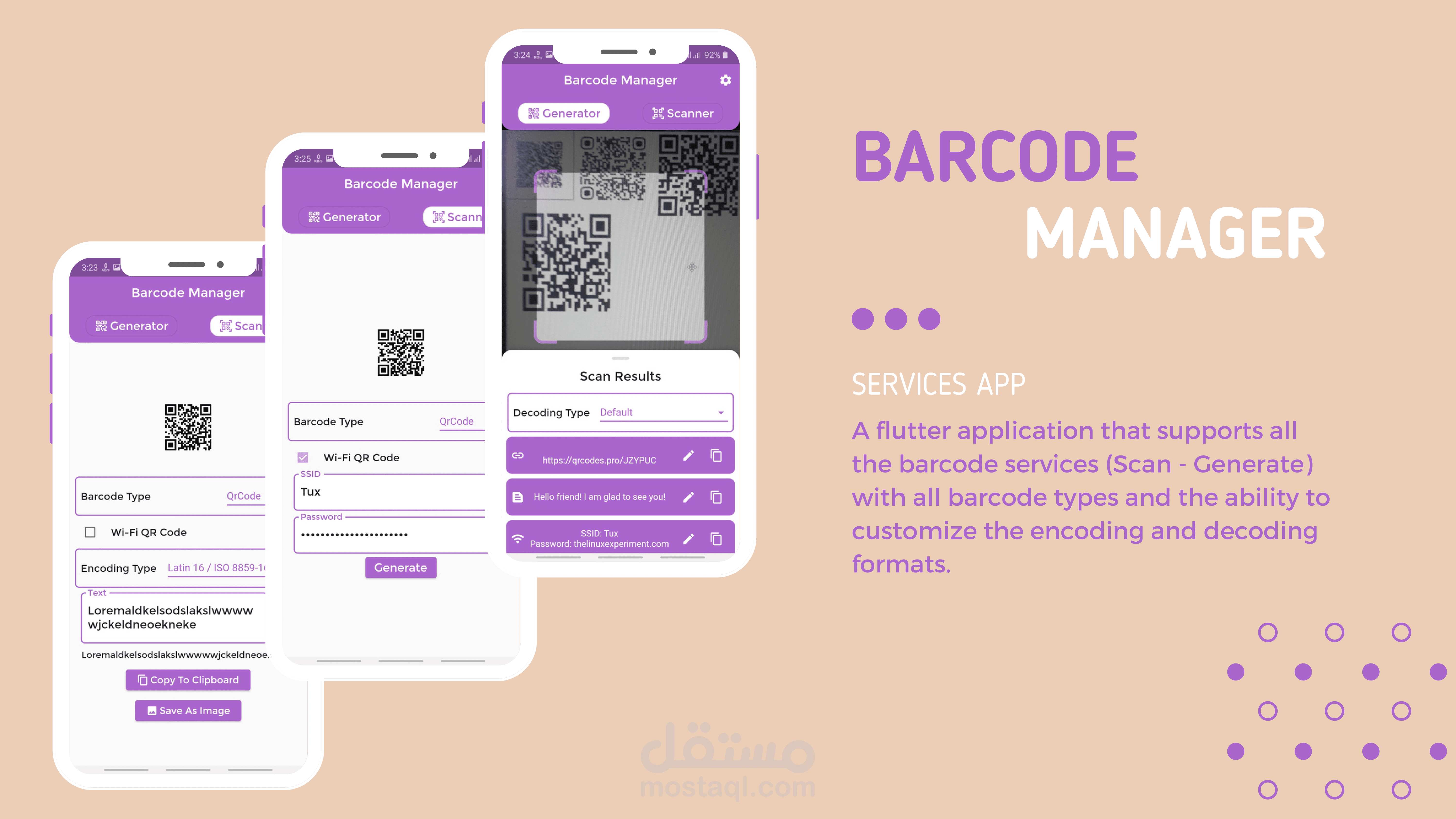 تطبيق flutter يدعم جميع خدمات الباركود (Scan - Generate) بجميع أنواع الباركود والقدرة على تخصيص تنسيقات التشفير وفك التشفير.
