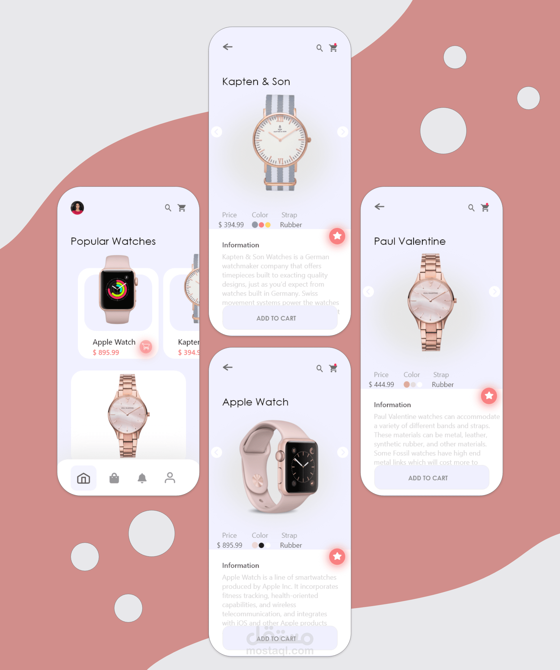 تطبيق يعرض مجموعة من الساعات المتنوعة بألوان مختلفة و أنواع مختلفة، مع عرض الاسعار و الالوان المتاحة.