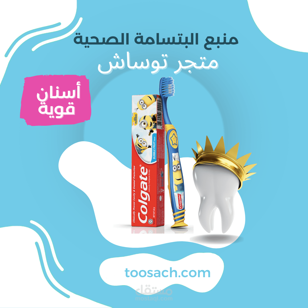 تم تصميم هذا البوست للترويج لمنتج معجون الأسنان بشكل جذاب ومبتكر. يتميز التصميم بوجود صورة لفرشاة الأسنان المرسومة عليها رسوم متحركة، والتي تعطي انطباعًا بأنها تحركت للتو. كما يوجد في الصورة علبة المعجون المرسومة عليها نفس الرسوم والتي تعكس صفات المنتج بشكل جذاب. ويتميز البوست بالديكور الخلفي الأزرق الفاتح الذي يعطي إحساسًا بالنظافة والانتعاش، مما يتناسب تمامًا مع موضوع المنتج. يتميز تصميم البوست بالبساطة والوضوح والشمولية، وهو يعكس بشكل جيد شخصية المنتج ويجعله يبرز عن المنافسين على وسائل التواصل الاجتماعي.