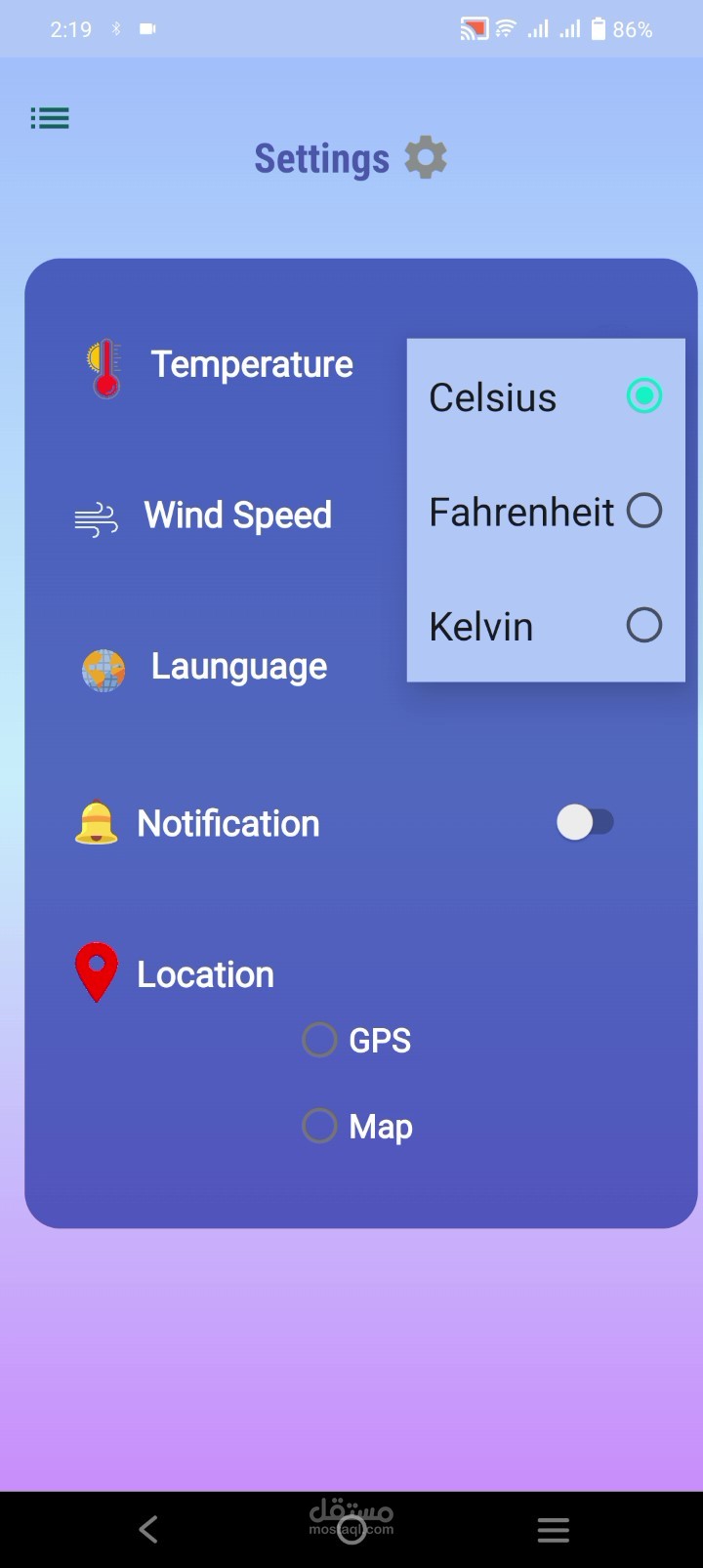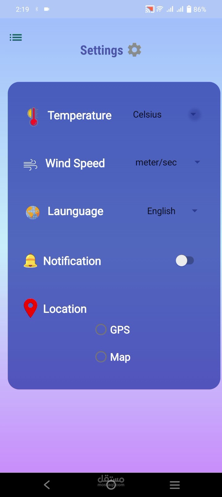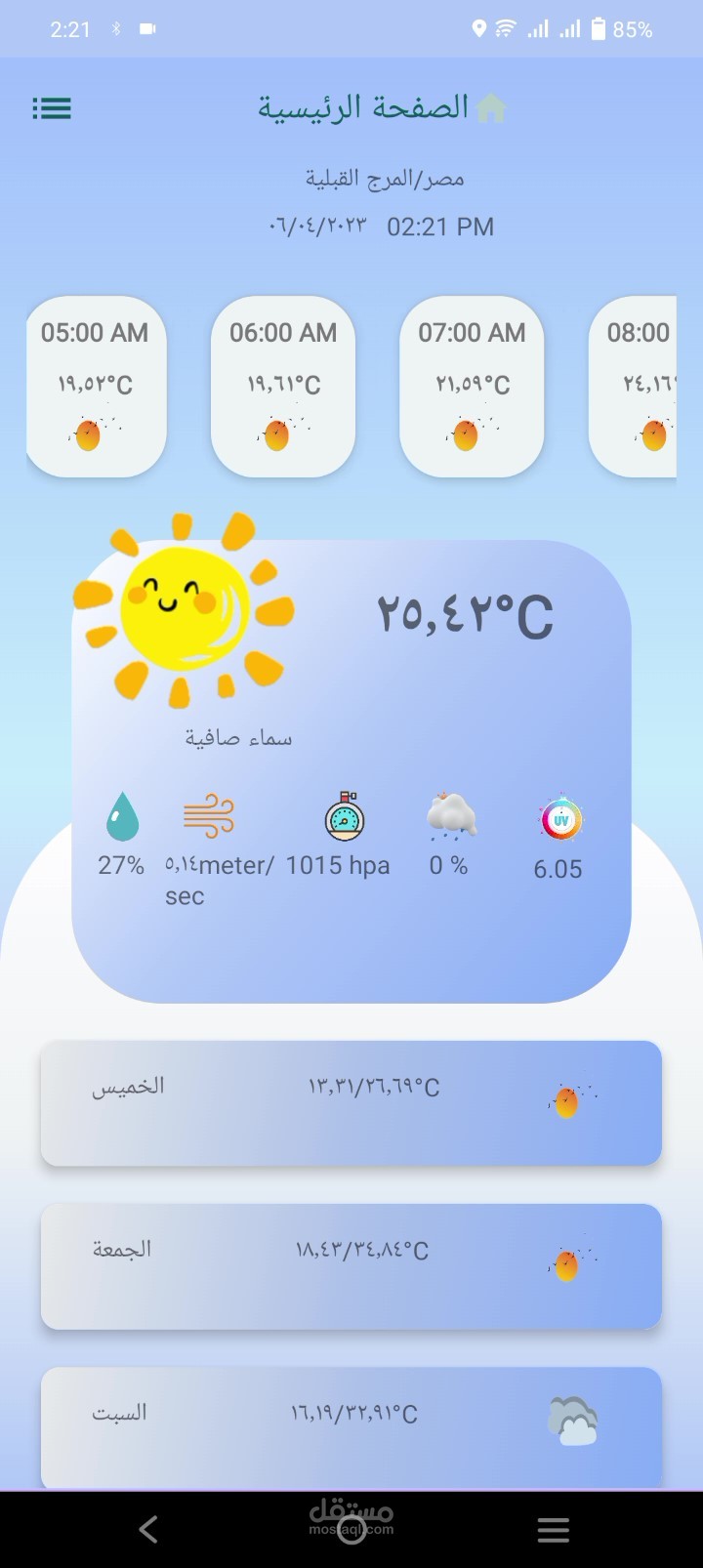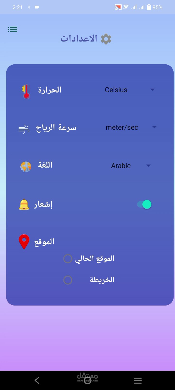 من خلال هذا التطبيق ، يمكنك معرفة كل شيء عن حالة الطقس ودرجة الحرارة من موقعك . يعرض توقعات الطقس الحالية و 8 أيام / 48 ساعة. إذا كنت تريد معرفة حالة الطقس في موقع آخر ، فيمكنك تغيير الموقع في خريطة Google في تطبيق الإعداد ، يمكنك تغيير وحدات درجة الحرارة (كلفن ، ودرجة مئوية ، وفهرنهايت) ، وسرعة الرياح (متر / ثانية ، ميل / ساعة. ) ، وتغيير اللغة (عربي - إنجليزي) كذلك. يمكنك اختيار تمكين وتعطيل الاشعارات.