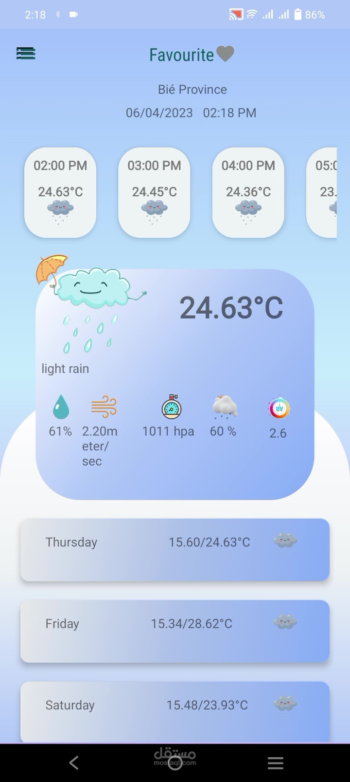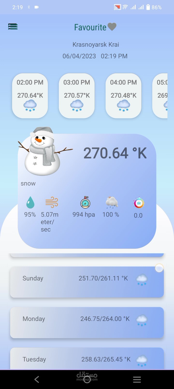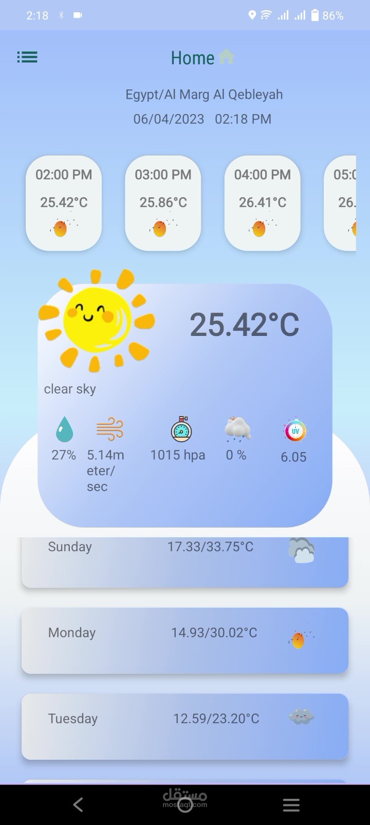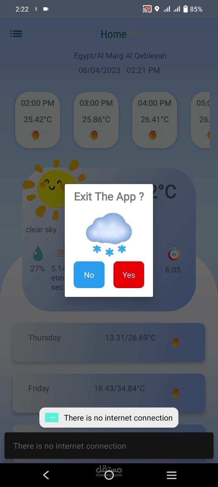 من خلال هذا التطبيق ، يمكنك معرفة كل شيء عن حالة الطقس ودرجة الحرارة من موقعك . يعرض توقعات الطقس الحالية و 8 أيام / 48 ساعة. إذا كنت تريد معرفة حالة الطقس في موقع آخر ، فيمكنك تغيير الموقع في خريطة Google في تطبيق الإعداد ، يمكنك تغيير وحدات درجة الحرارة (كلفن ، ودرجة مئوية ، وفهرنهايت) ، وسرعة الرياح (متر / ثانية ، ميل / ساعة. ) ، وتغيير اللغة (عربي - إنجليزي) كذلك. يمكنك اختيار تمكين وتعطيل الاشعارات.