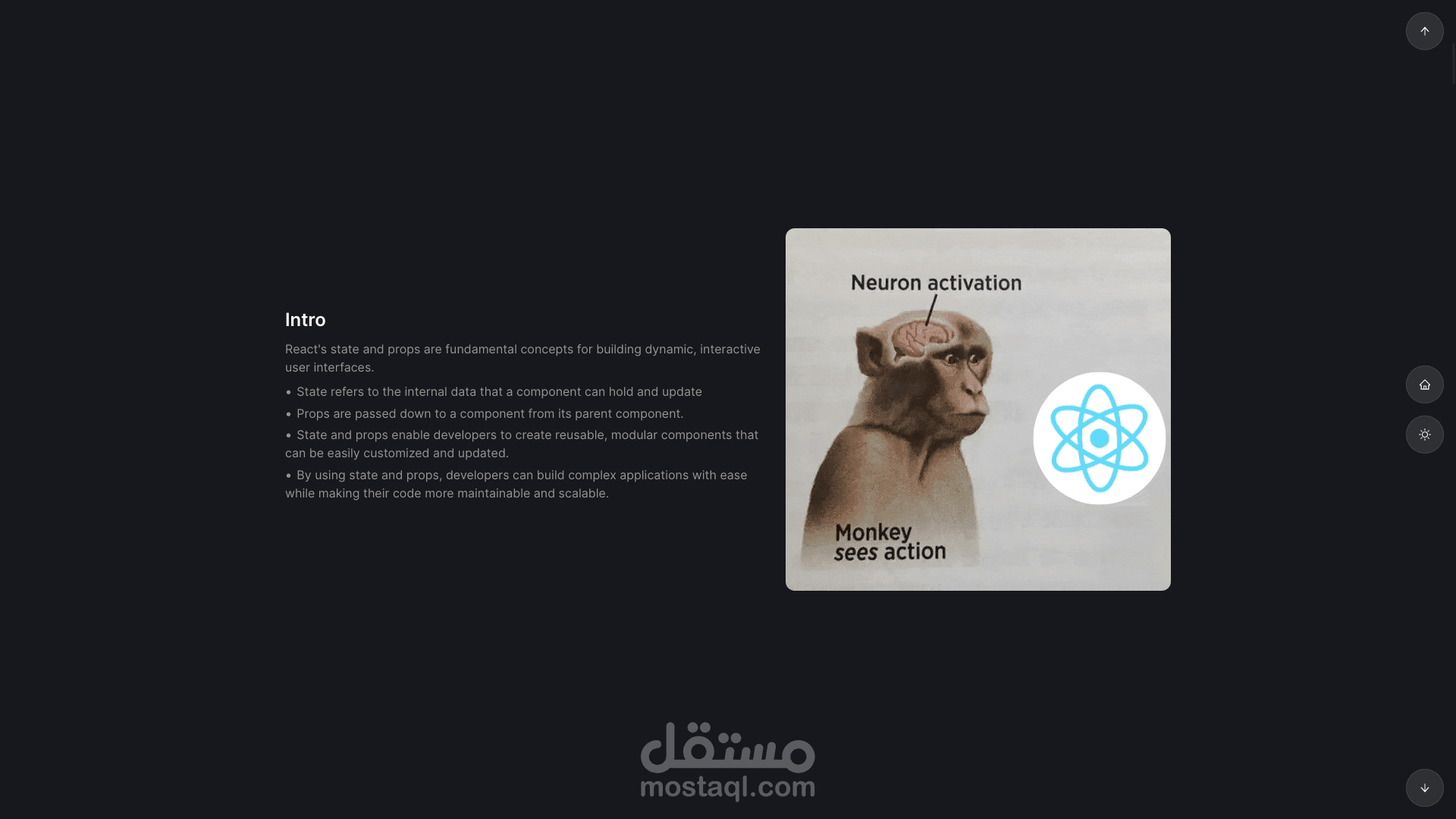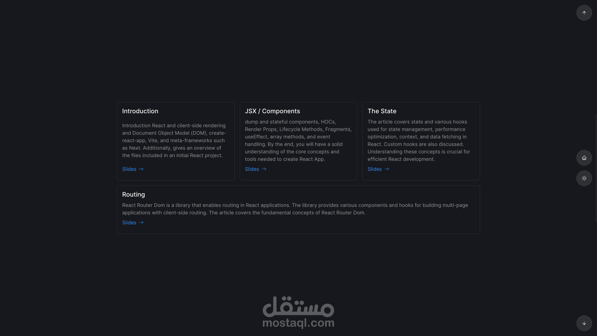 React-Presentation is a web-based lecture platform that provides an interactive and visually engaging learning experience for understanding the core concepts of React, a popular JavaScript library for building user interfaces. The presentation website is built using React and Tailwind CSS, and showcases the key features and benefits of React with real-world examples of how to use it to build web applications.