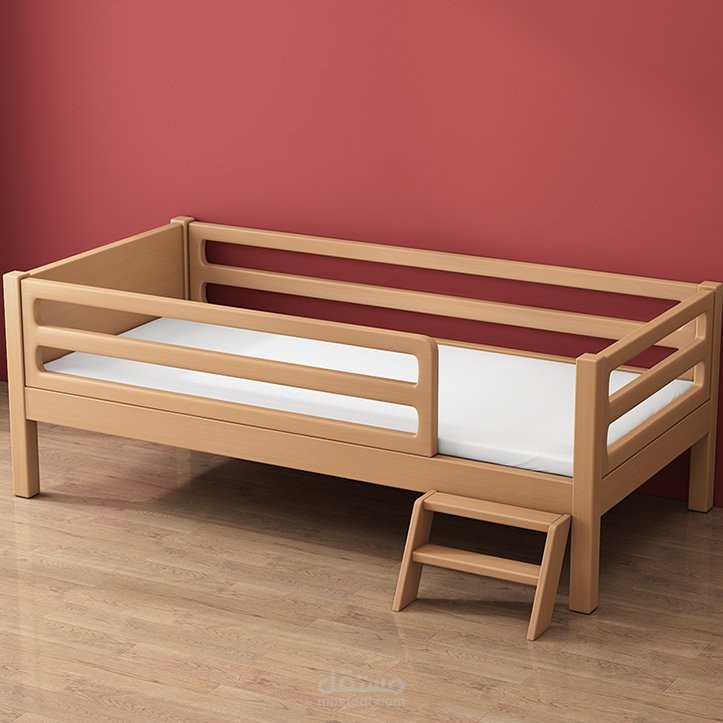 سرير اطفال خشبي ارتفاعه عن سطح الارض ما يقارب حوالي 10 سم يوجد بالجانبين قطعتين من الخشب لحجز الطفل كي لا يقع وهو نائم ويوجد سلم بطلوع الطفل من عليه
